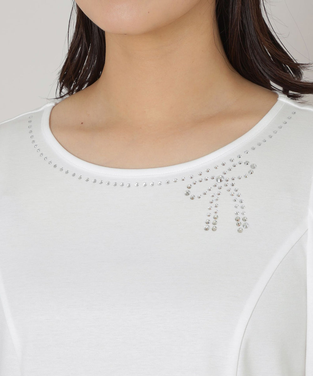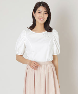 襟元にきらめくホットフィットをあしらった、リボンモチーフが印象的なトップスです。袖はギャザーパフとカフスで仕上げ、TO BE CHICらしい華やかさと可愛らしさをプラスしています。
