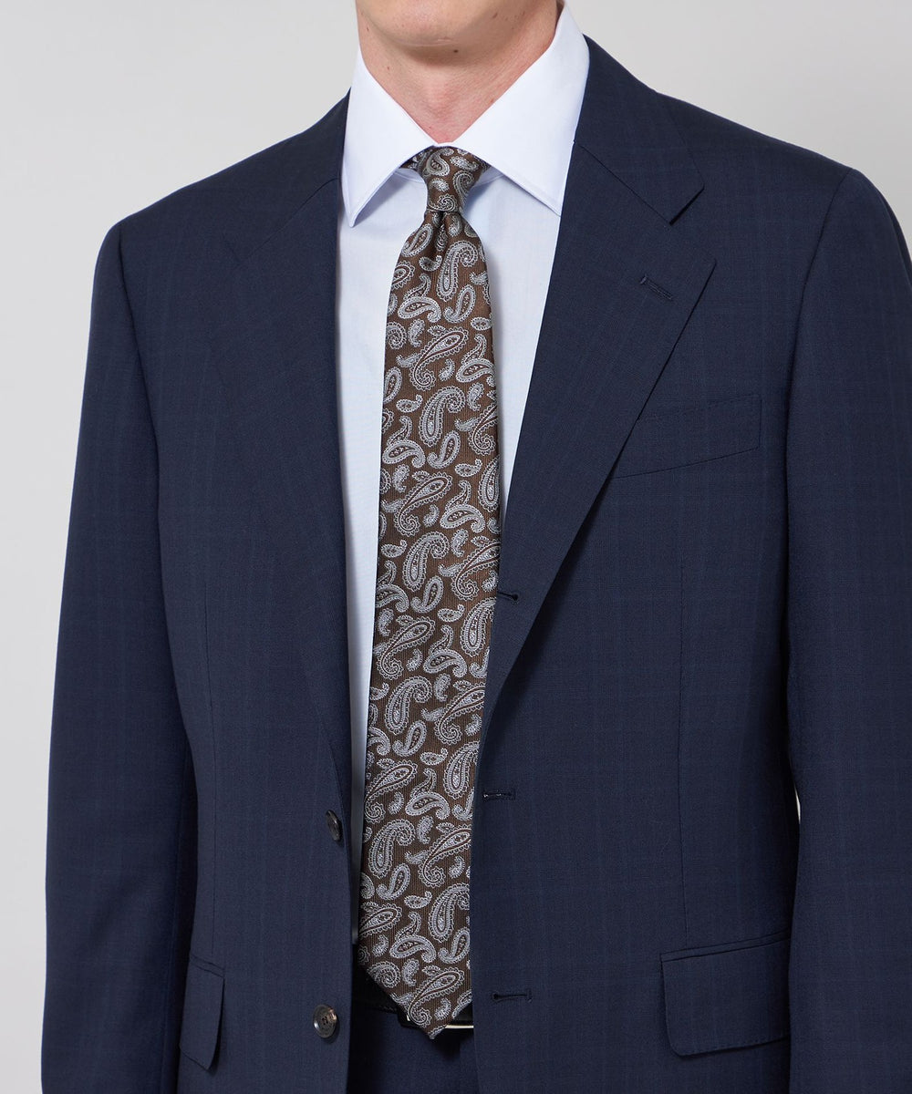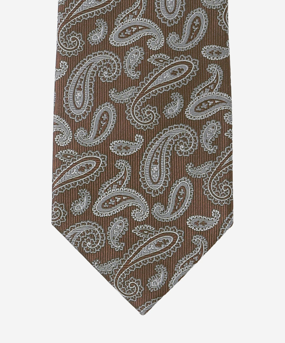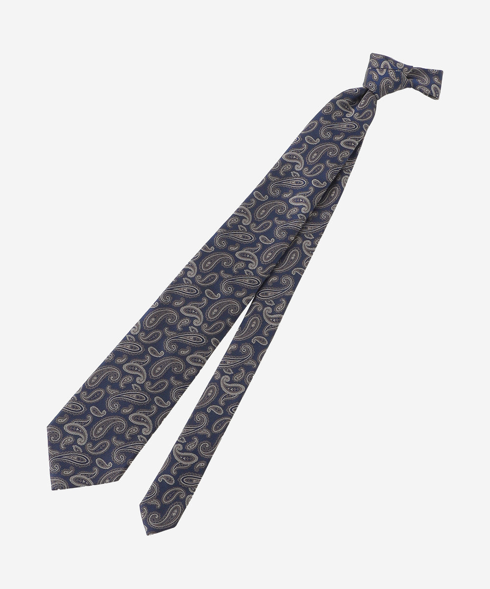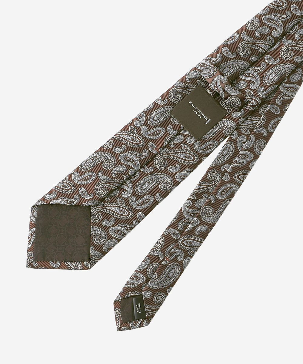 糸の風合いと光沢、発色を活かす為、あえて扱いの難しい甘撚りの糸を使用し、低速の織機で時間をかけて織り上げたストライプ柄です。レジメンタルをラインごとに組織を切り替えてクラシックに表現しています。結びシワからの回復力に優れた、ウール100%のダブルクロスを芯に使用しています。