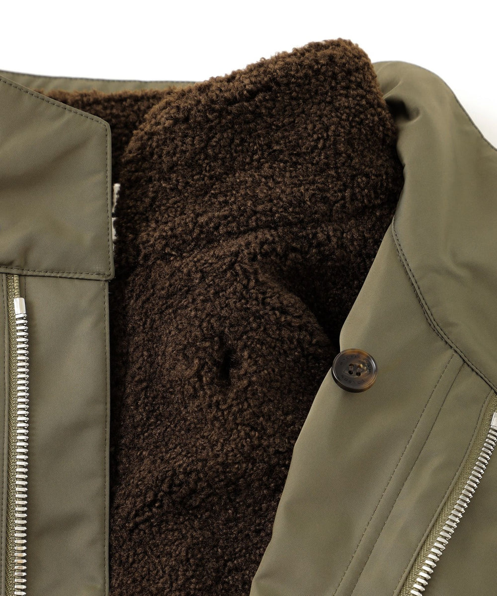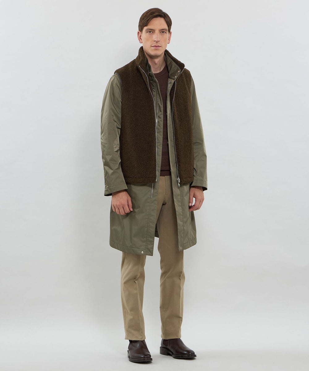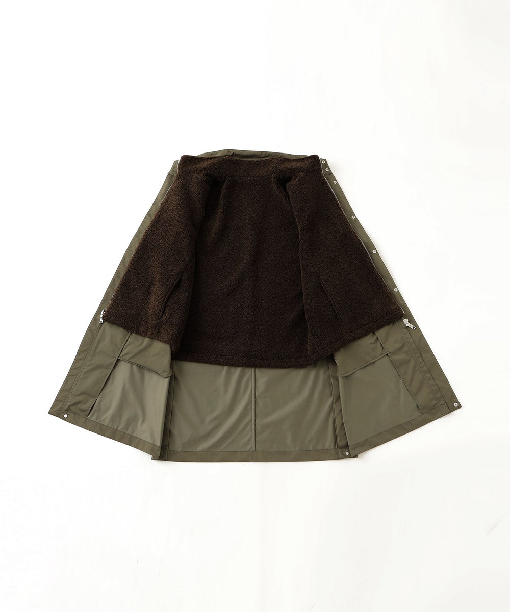今期からはボアライナーに工夫を凝らし、4WAYでスタイリングを楽しめる仕様にしています。オーソドックスにライナーを着脱して使ってもよく、外して裏返すと単品のボアベストとしても着用可能です。外したライナーを敢えてコートの上から羽織ることで、遊びの効いたレイヤースタイルも楽しむことができます。是非気温や気分に合わせてスタイリングバリエーションをお楽しみください。