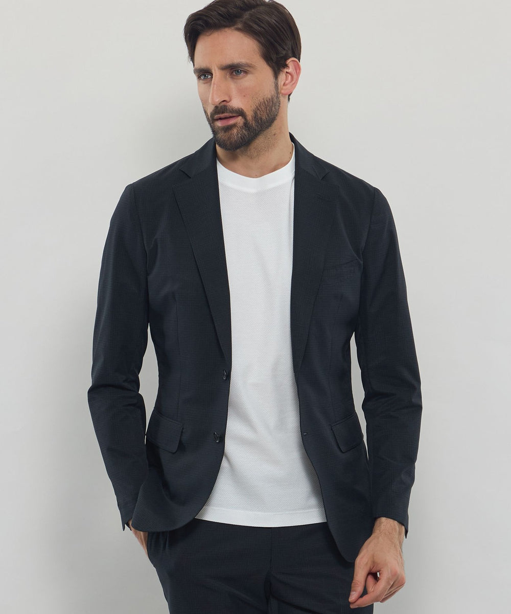 シワになり難く、タテ、ヨコ両方向に伸縮するストレッチ性と併せて、汗ばむ季節のセットアップスタイルの強い味方となる清涼素材です。