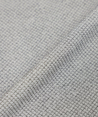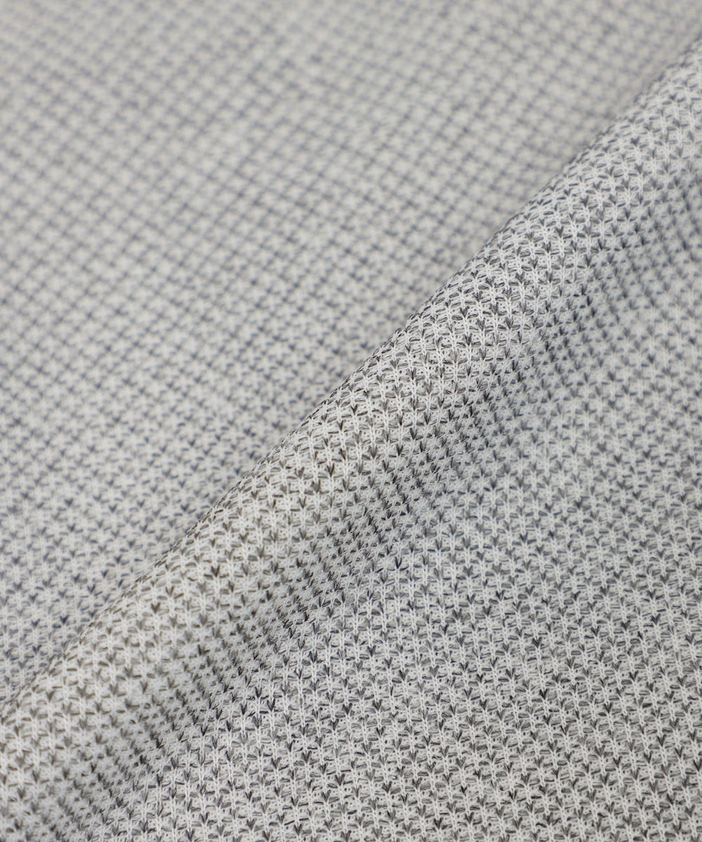 麻調合繊「サマー尾糸」を使用。ポリエステル100%ながら麻混のような風合いを表現した素材です。特殊仮撚加工により撚糸杢とは違った独特な杢表現を出しています。また、裏側の滑りの良さにより、裏地無しの1枚仕立てでもストレスなく着用できます。