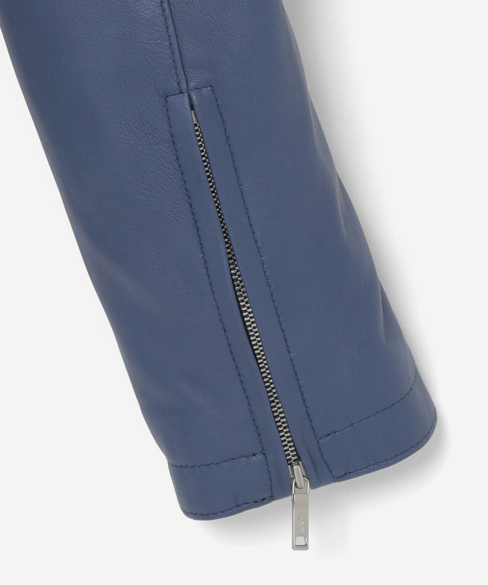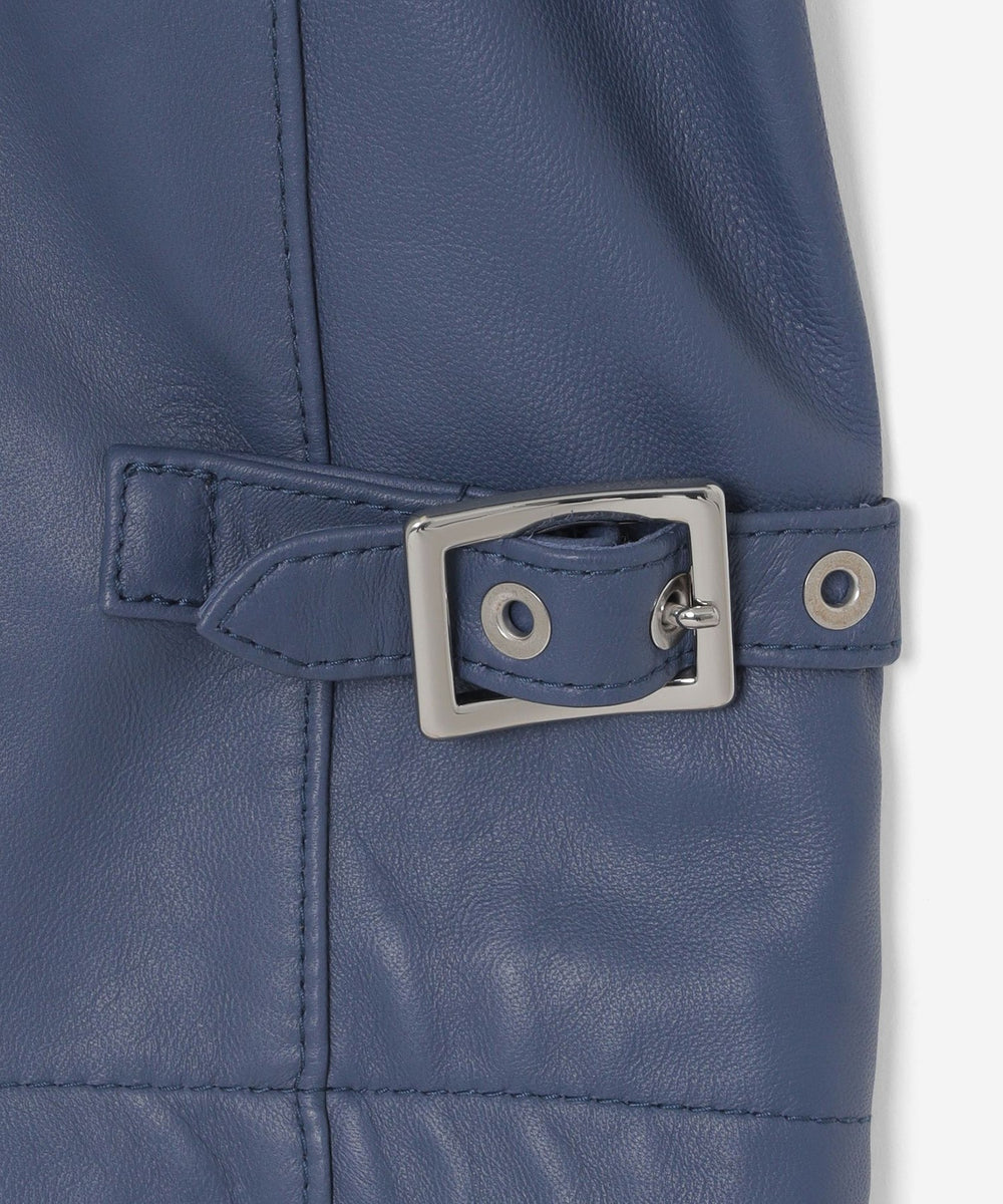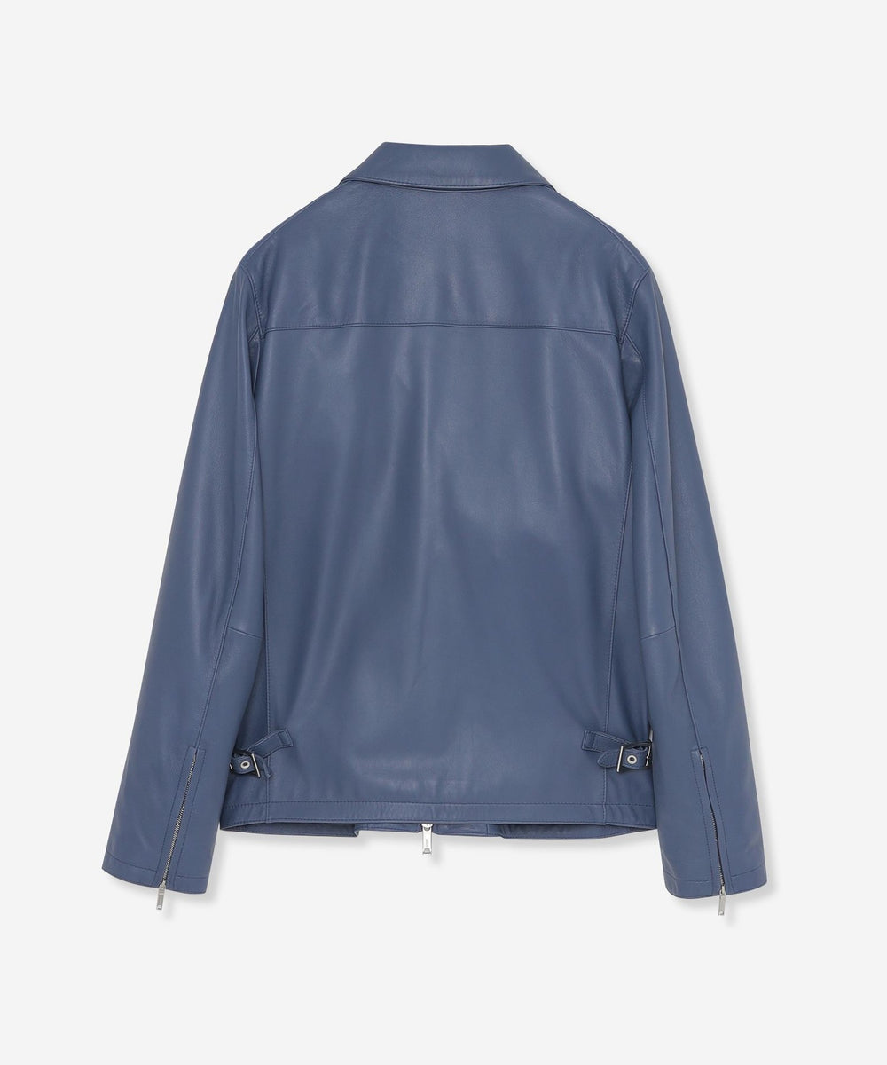 シャツカラーデザインを採用したシングルライダース。脇にベルテッドのデザインを施しシルエットをアジャストできる仕様になっています。 ハード感を極限まで抑えたエレガントなテイストが、ジャケット全体を上品にまとめています。