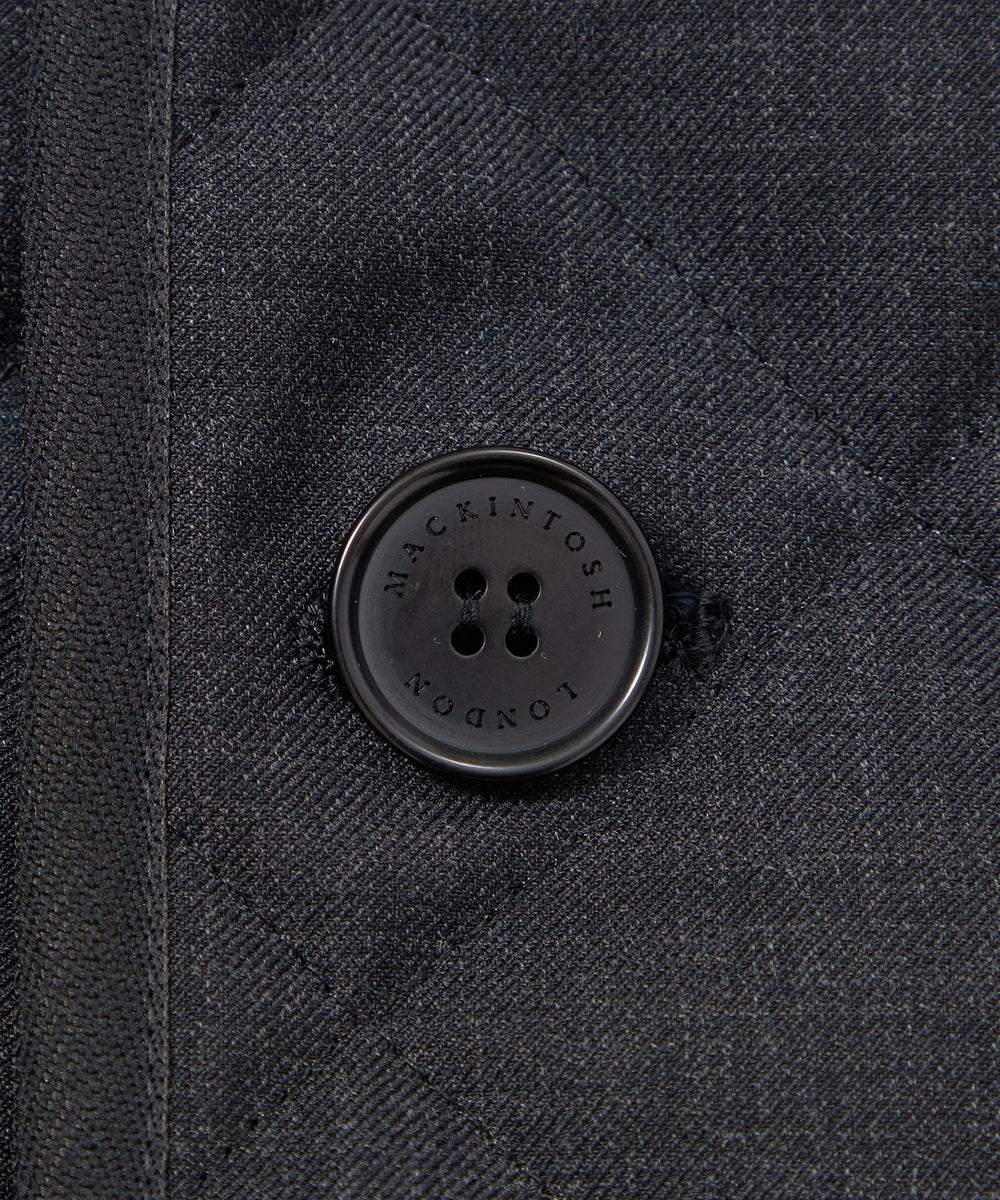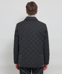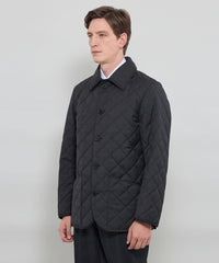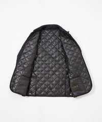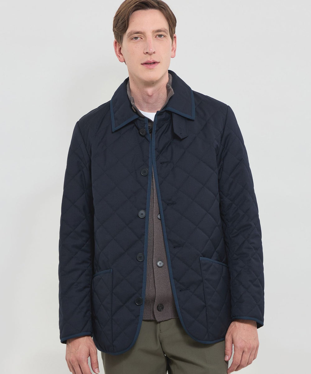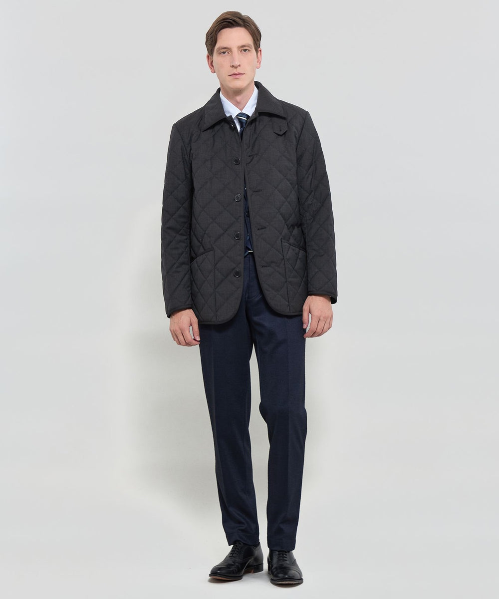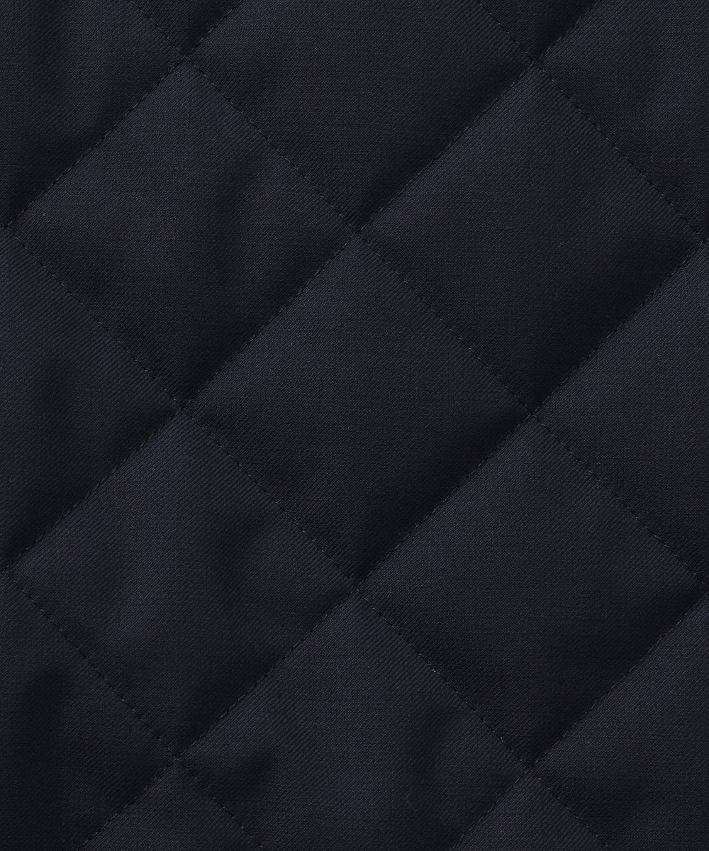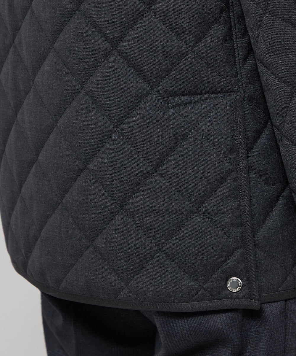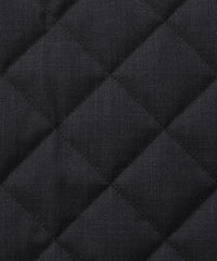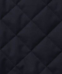 光沢感のあるウール混ツイル素材を使用。裏面にはフィルム加工を施し、防風性を確保しています。中綿入りの伝統的な3インチダイヤ柄キルトで、保温性も備えた素材です。