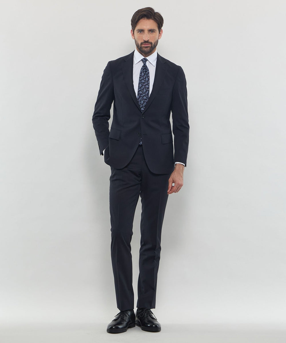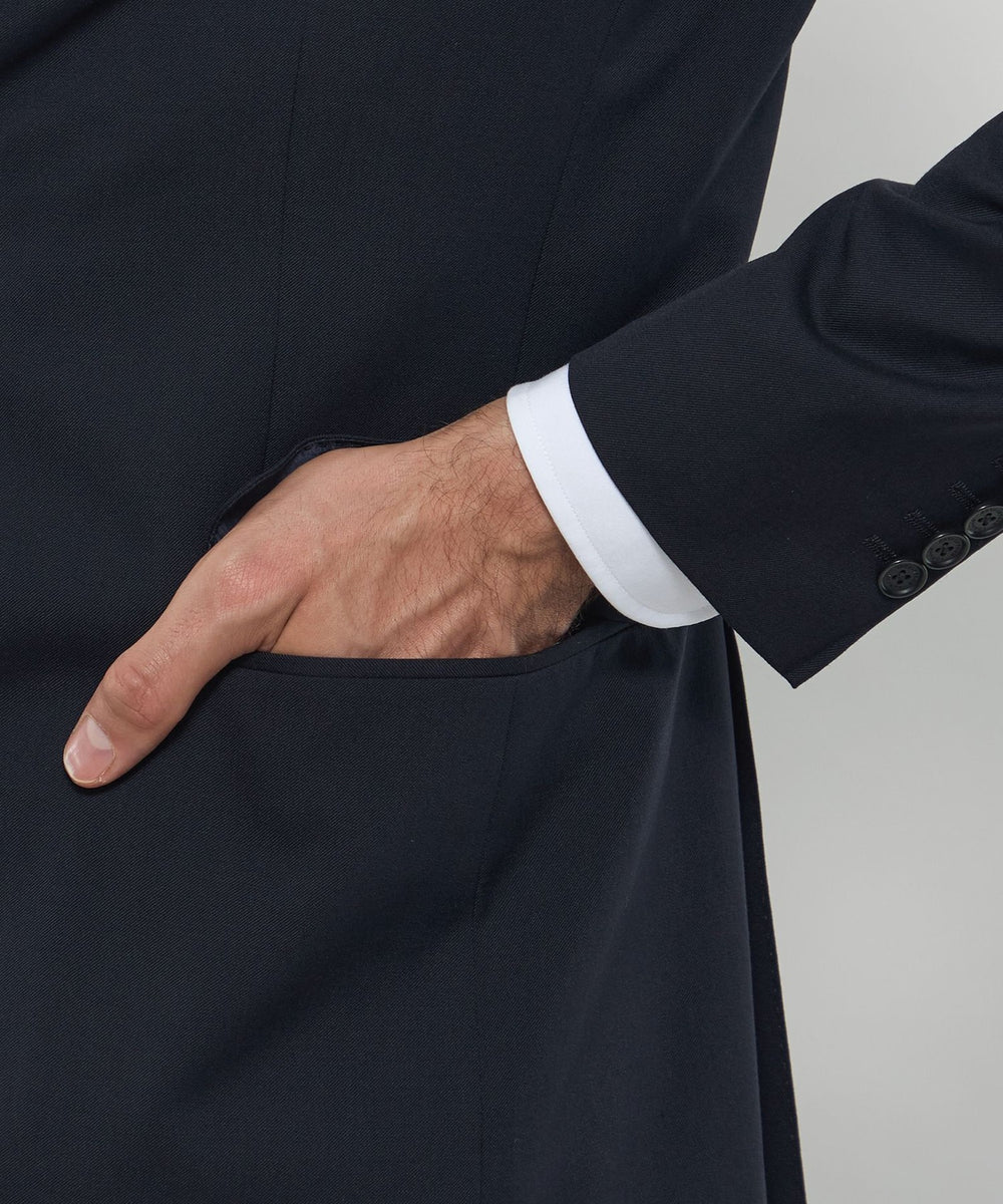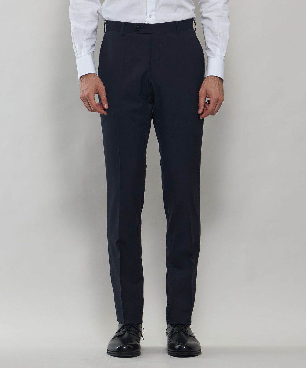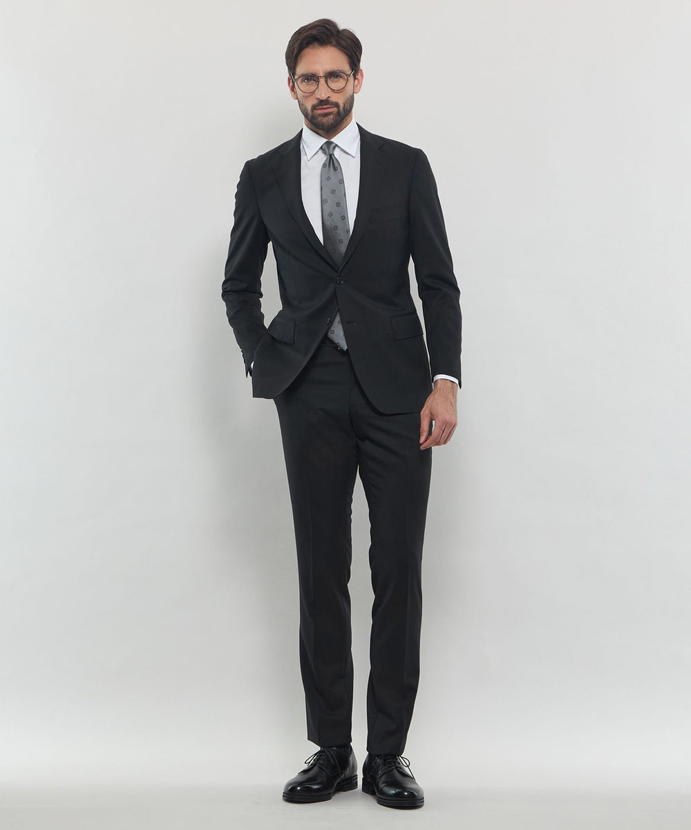 高級品種であるメリノウールの中でもさらに厳選されたSuper100'Sの原毛を使用。上品で自然な光沢、なめらかさ、スーツに相応しい適度なハリコシを持った上質な素材です。年間を通して着用できるようやや軽量なツイル組織になっています。