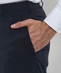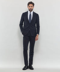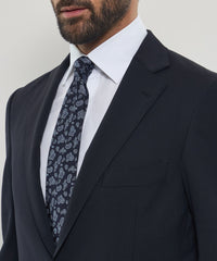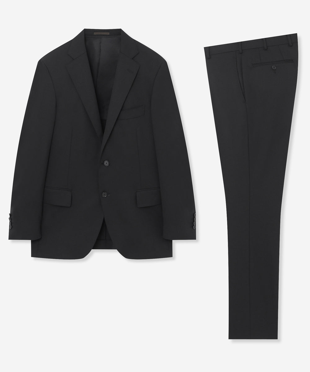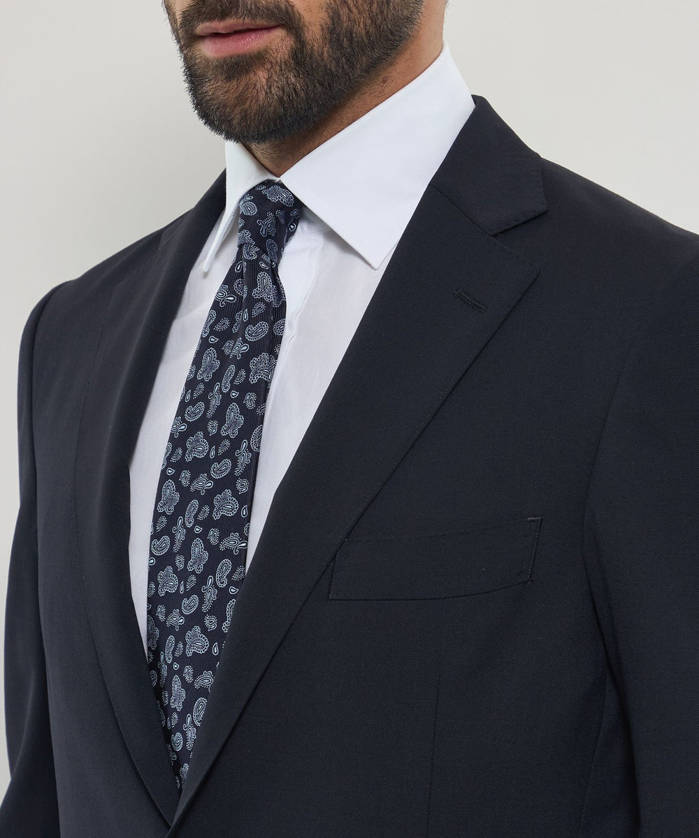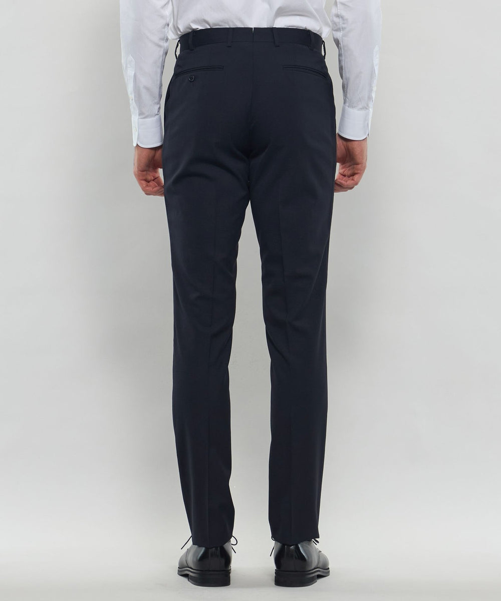 高級品種であるメリノウールの中でもさらに厳選されたSuper100'Sの原毛を使用。上品で自然な光沢、なめらかさ、スーツに相応しい適度なハリコシを持った上質な素材です。年間を通して着用できるようやや軽量なツイル組織になっています。