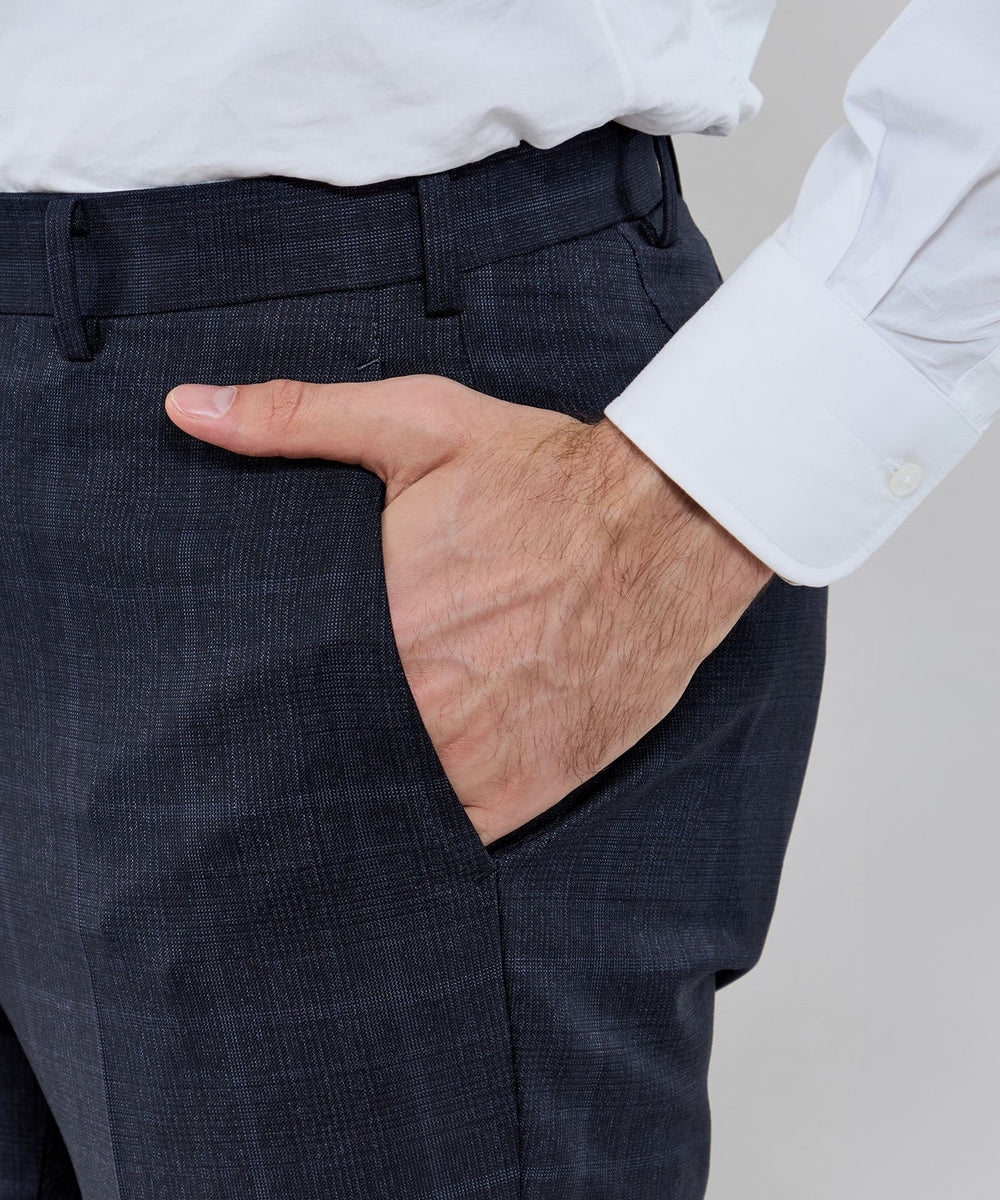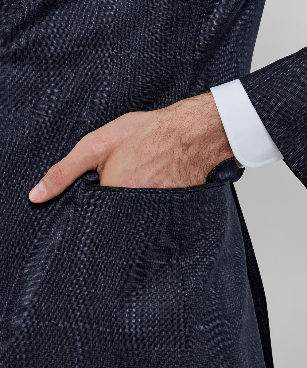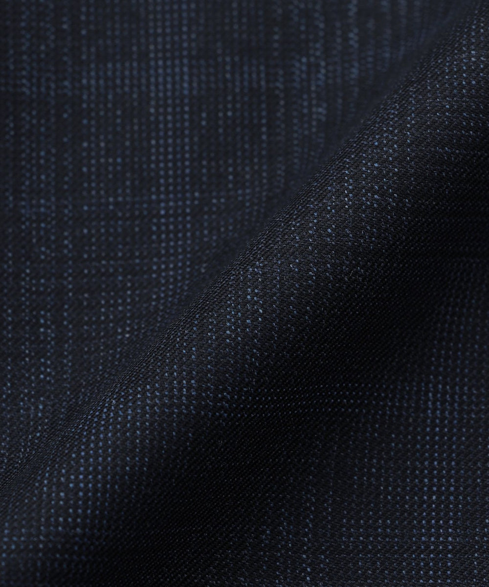 希少なSuper150's(16.0μm)の原毛を使い繊細に織られた素材です。上品な光沢、細番手使いならではのとろみとしなやかさが特徴です。オーソドックスなグレンチェックにオーバーペンが合わさったコンビネーションチェックです。