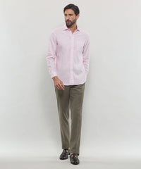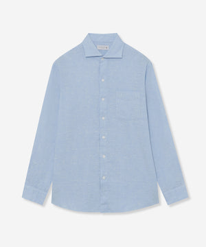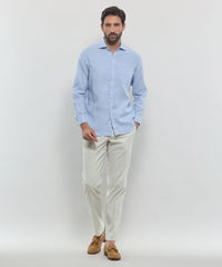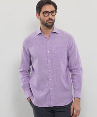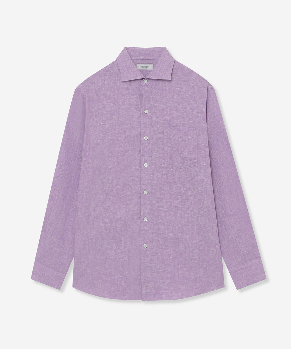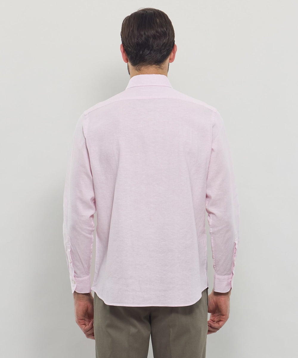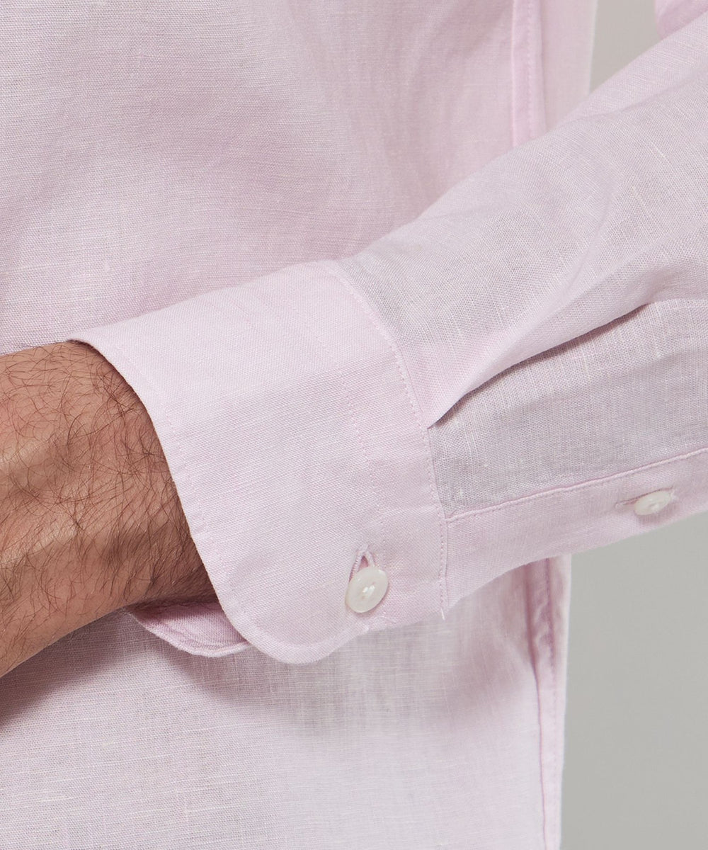 日本最古のリネンテキスタイルメーカーが開発したリネンシャンブレーを採用しています。従来の方法では、ストレッチ性を持たせようとすると、どうしても麻らしい風合いが薄れ、重量感が出てしまうデメリットの改善に成功。研究を重ねた特殊な紡績方法でリネンとストレッチ糸を紡績した糸を織りあげることで、エアリーな麻の風合いはそのままに、程良いストレッチ性を兼ね備えたリネン素材が生まれました。リネン素材は良質なフレンチリネンの原料メーカーSAFLIN(サフィラン)社を使用。先染めのシャンブレー生地でMACKINTOSH LONDONの別注カラーをオーダーしました。