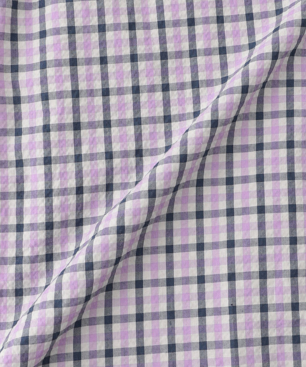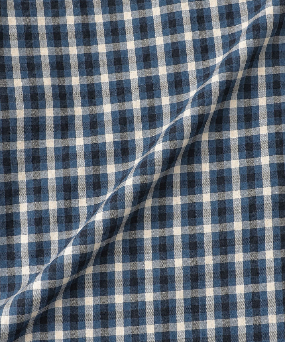 涼し気でリラックスムード満載なシアサッカーはナチュラルな皺感が特徴です。今シーズンはポリエステルを交織したはリネンを追加し、薄く、軽く、サラッとした風合いと清涼感をアップデートしています。こちらも定番シアサッカーと同様にアイロンを使用せず、洗いざらしで雰囲気良くご着用頂けます。やや小さめピッチの3色使いのギンガムチェックを秋らしい落ち着いた色目にしており、長い晩夏にお勧めの素材です。
