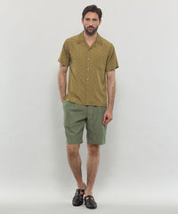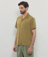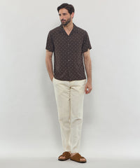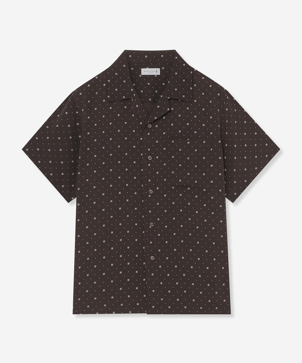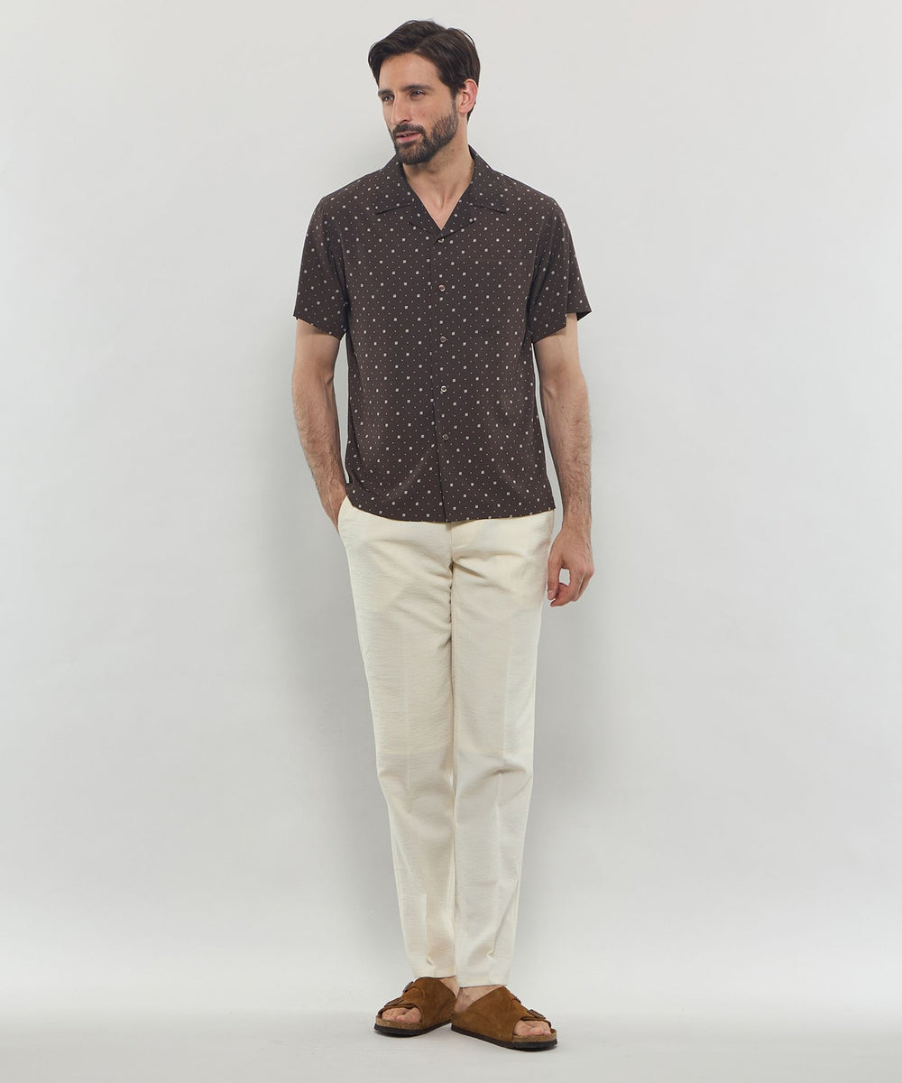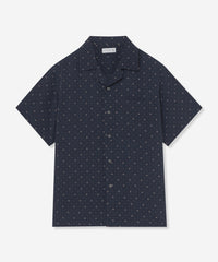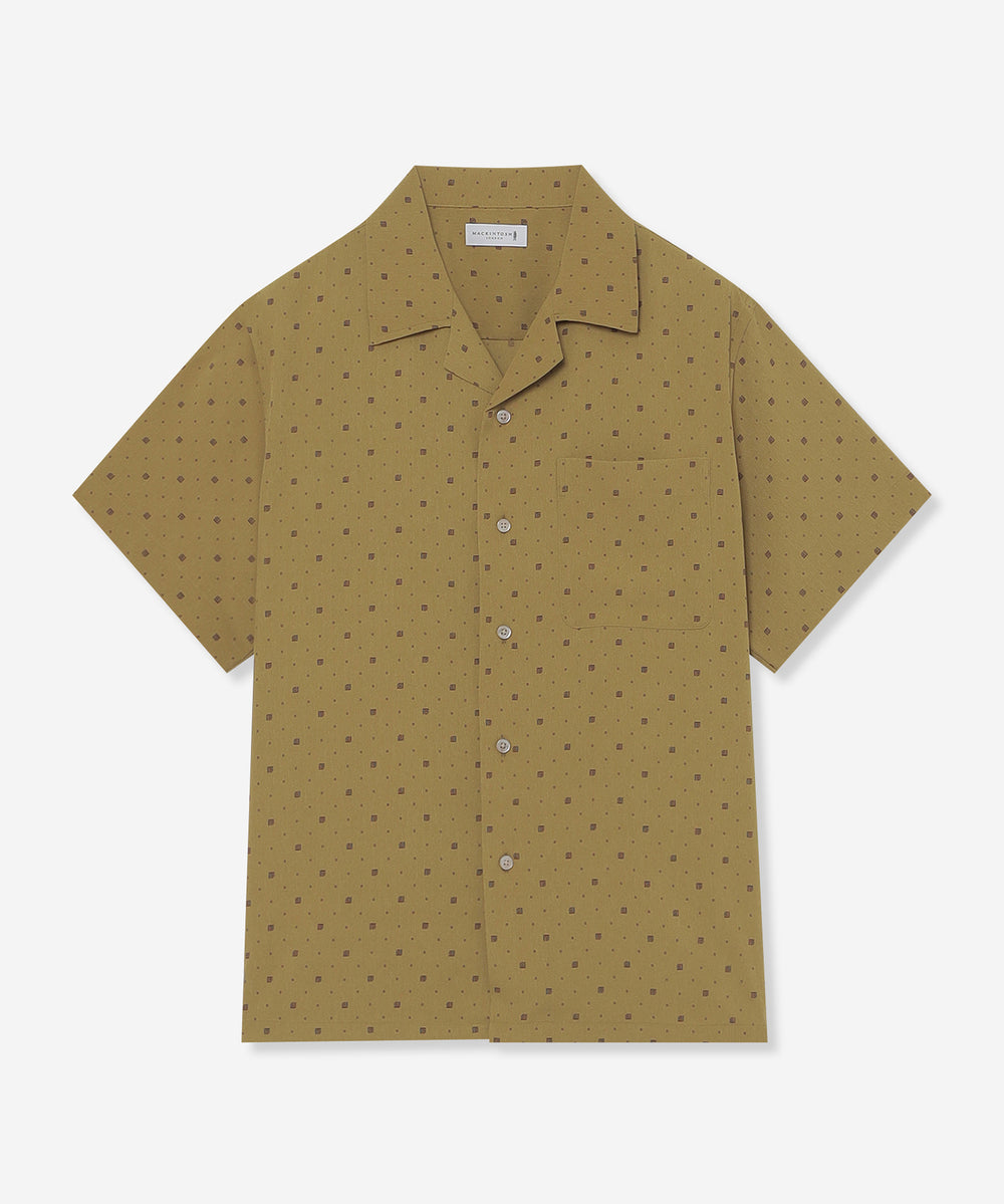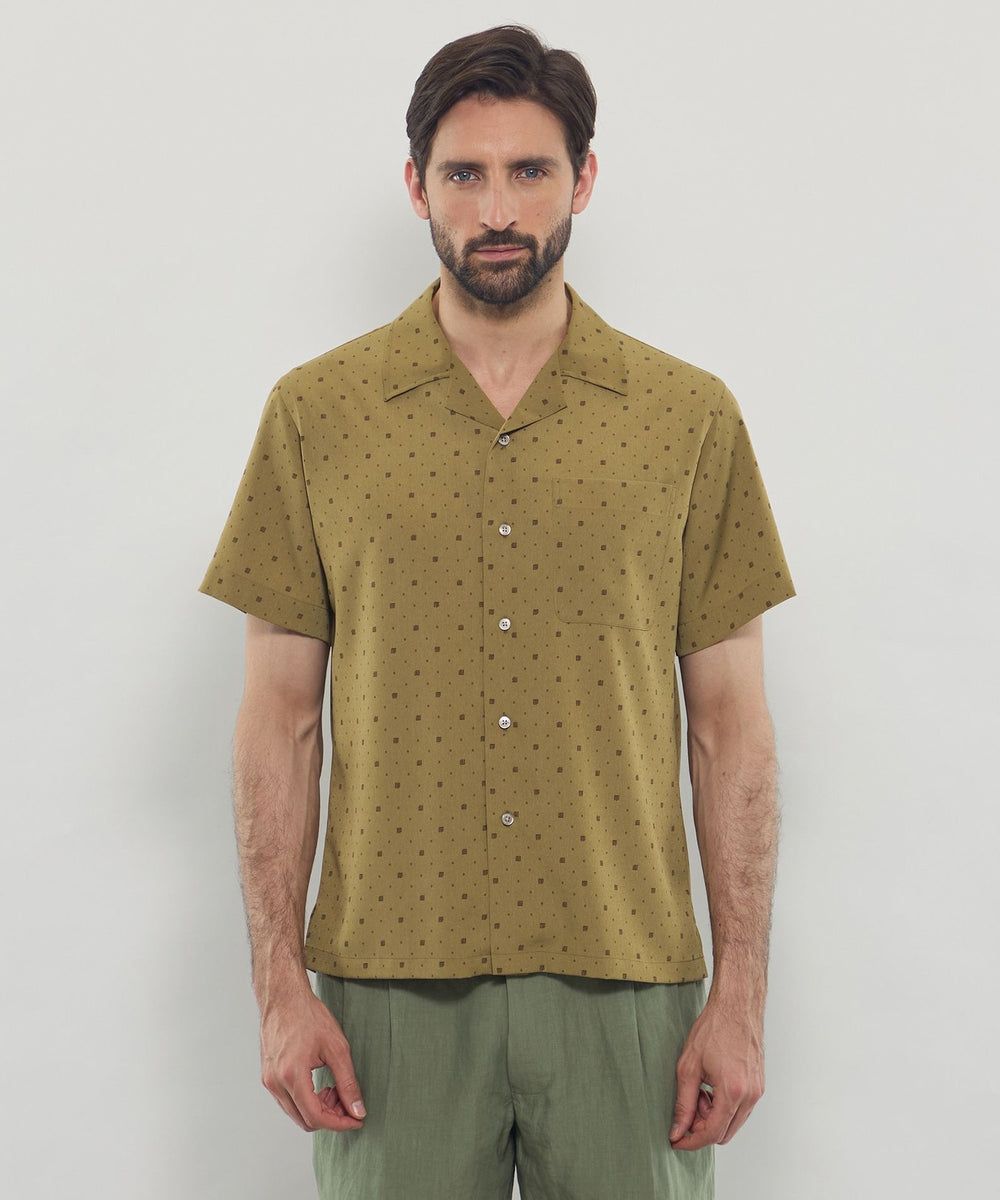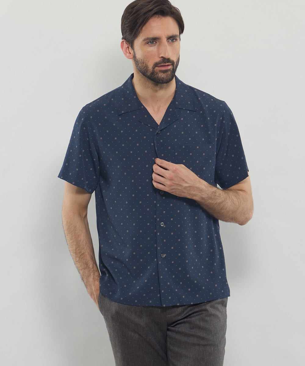 リラックスムード満点の半袖オープンカラーシャツです。程よい膨らみと落ち感のある上質な素材感でカジュアルになり過ぎず、程よくきれい目なスタイルにも合わせられます。サイズと密度を研究し、大人がサラッと着られる小紋柄のバランス感に拘りました。シンプルな柄なので、春先はジャケットやカーディガンのインナーに、盛夏には1枚でと様々なスタイリングに取り入れられるアイテムです。消臭テープを襟やアームホールに施しているので、汗ばむ季節でも安心してご着用いただけます。