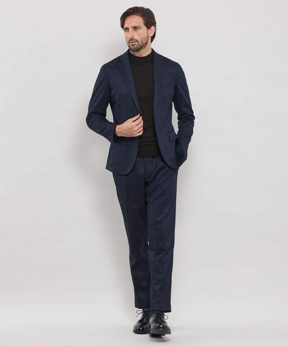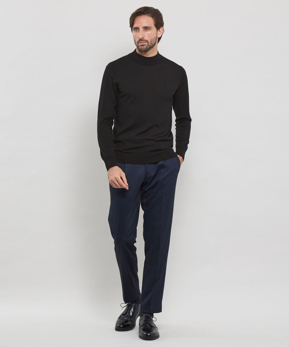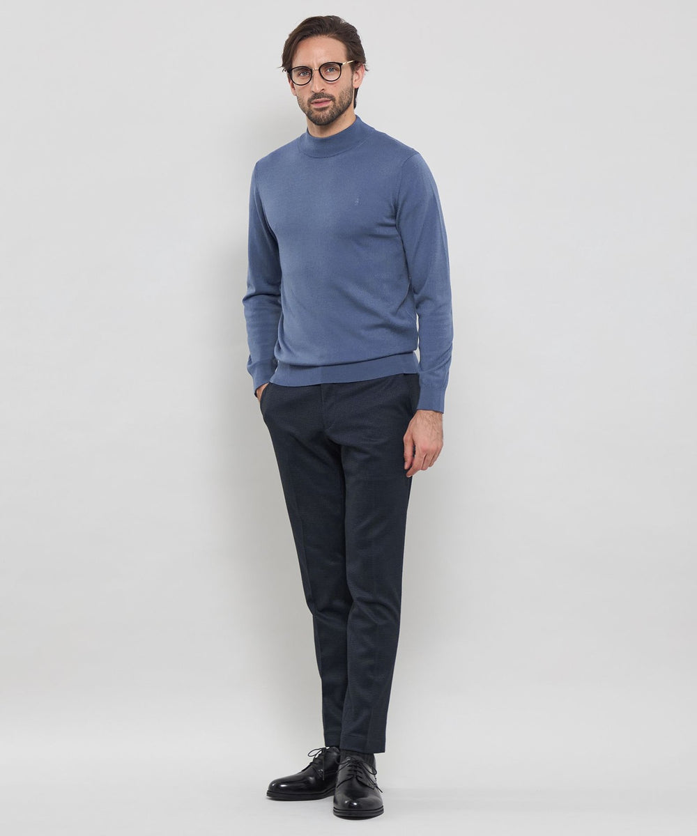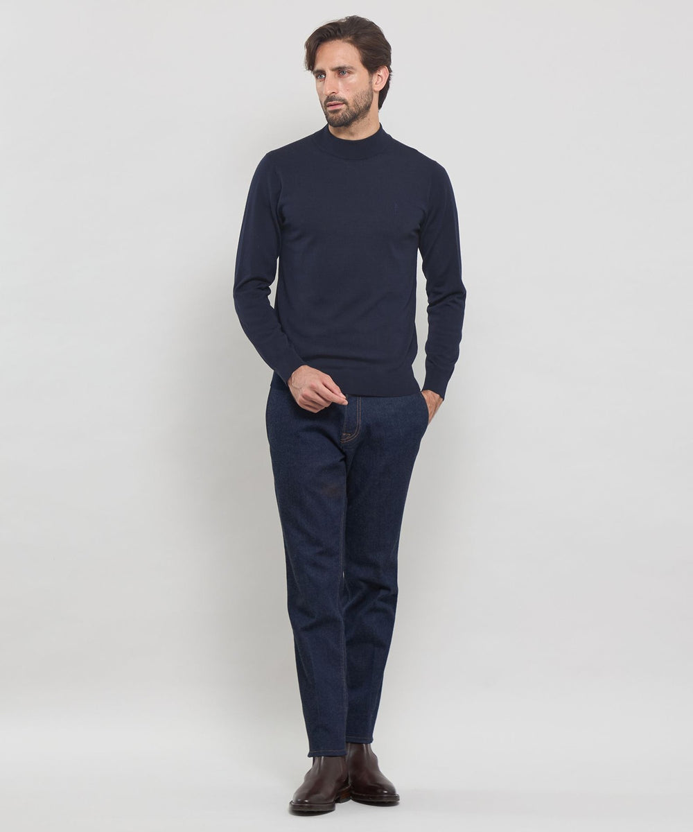 ベーシックなモックネックのニットはテーラードの考えを取り入れ、立体的な設計に変更しています。身体の形状に合わせてパターン形状、分量感を細かく調整することで,シルエット、着用感が大幅にアップデートされました。肩の接ぎの縫い目をゼロにする特殊な縫製仕様など、パターンと合わせて細部まで、着用感に拘りました。ワンポイントで左胸にダンディマン刺繍が入ります。