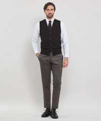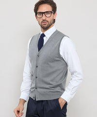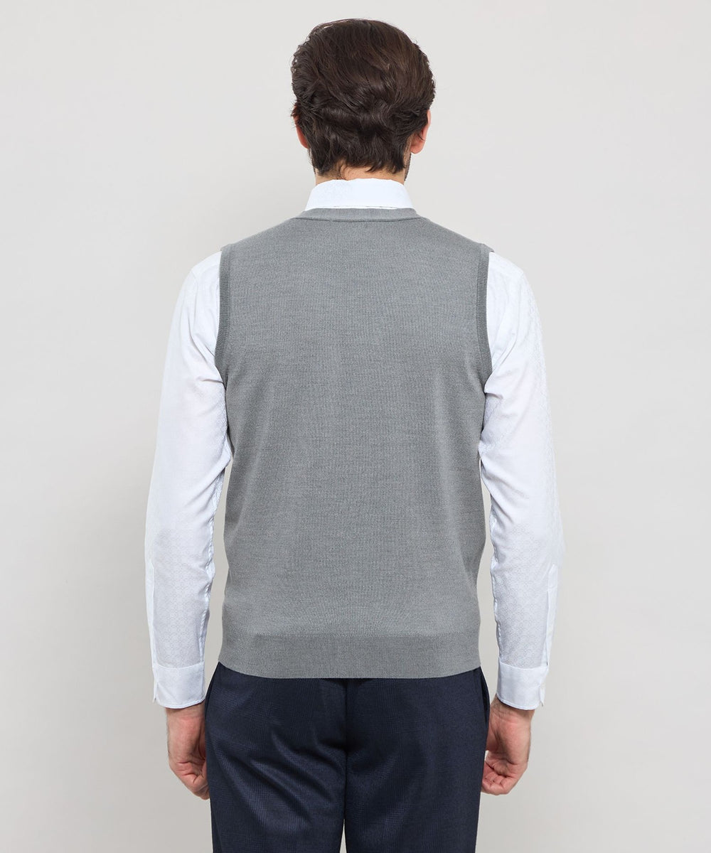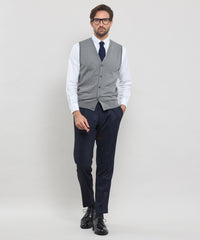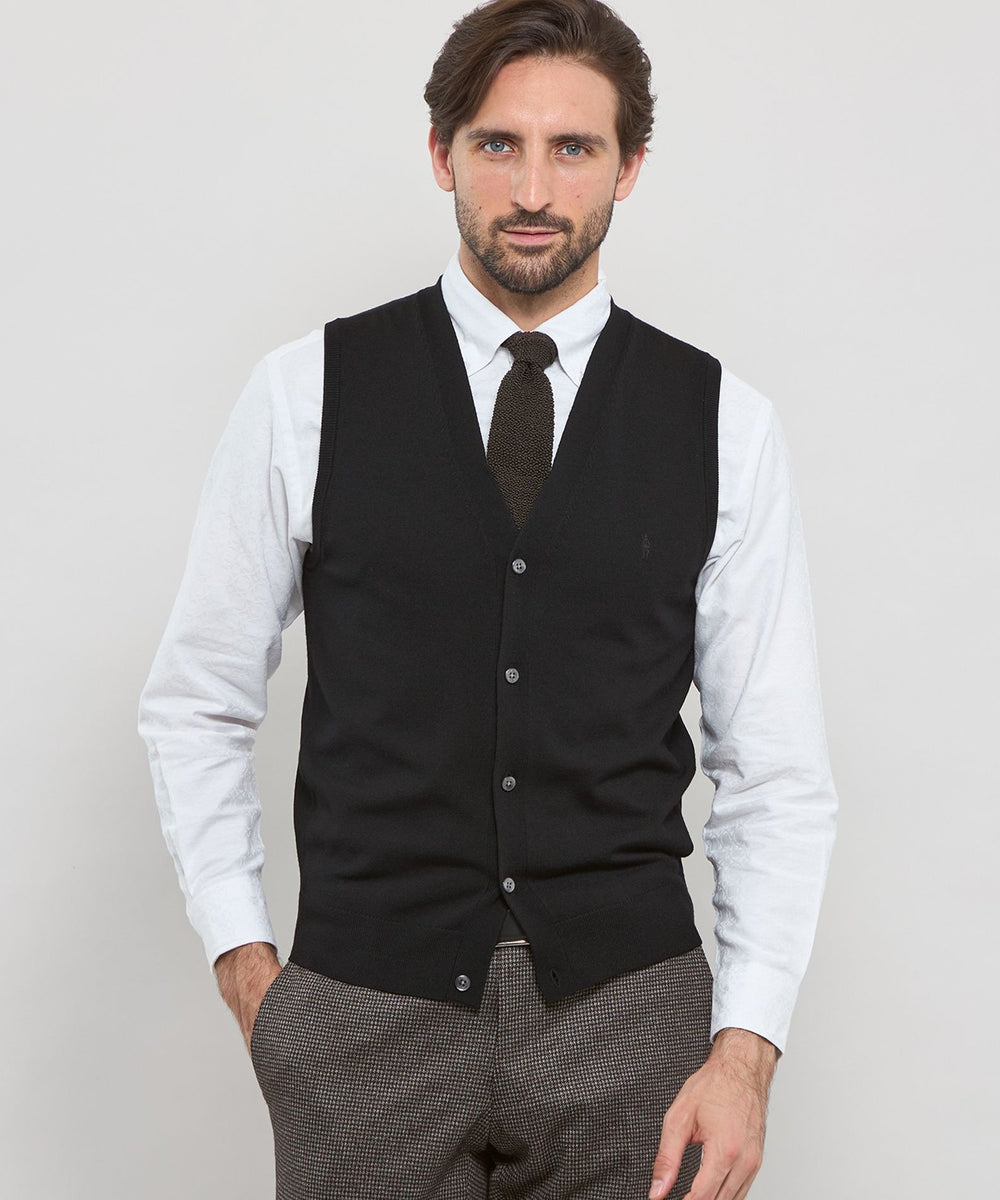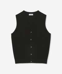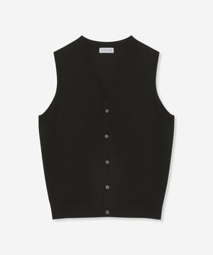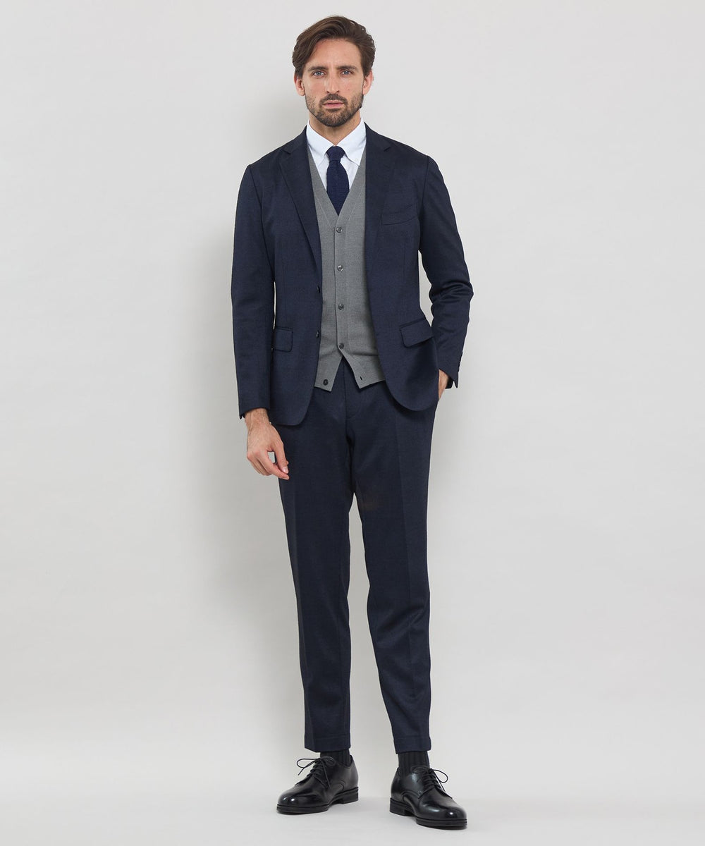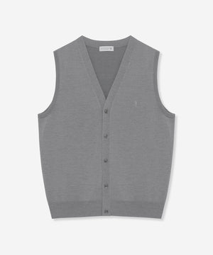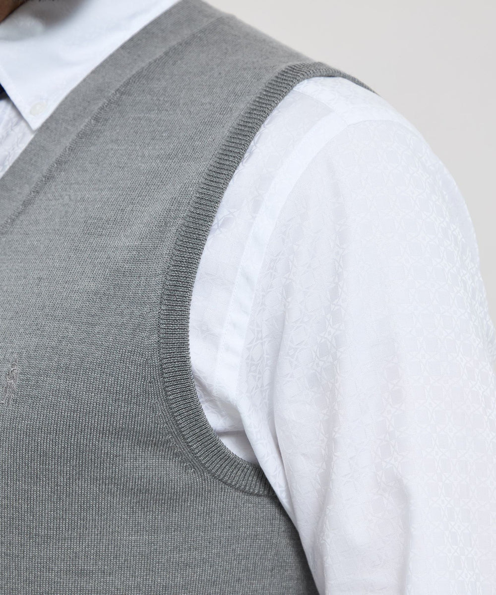 ベーシックなデザインの前開き釦ベストはテーラードの考えを取り入れ、立体的な設計に変更しています。身体の形状に合わせてパターン形状、分量感を細かく調整することで,シルエット、着用感が大幅にアップデートされました。肩の接ぎの縫い目をゼロにする特殊な縫製仕様など、パターンと合わせて細部まで、着用感に拘りました。ワンポイントで左胸にダンディマン刺繍が入ります。