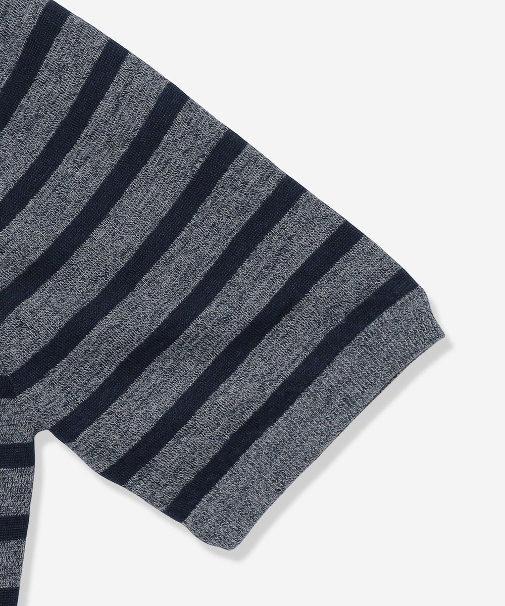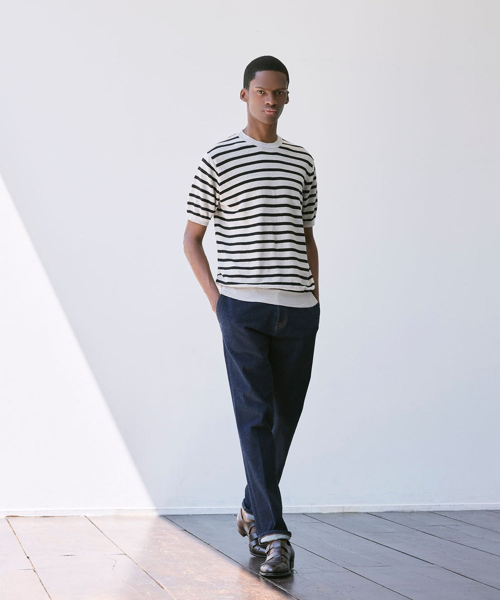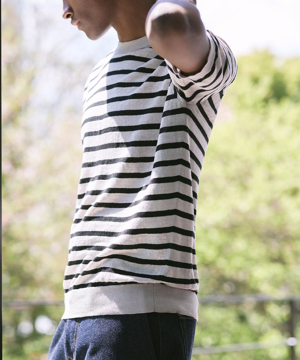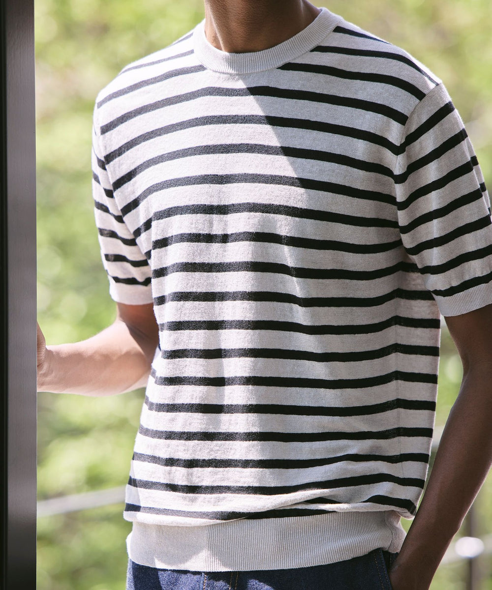 レギュラーフィットの半袖クルーネックプルオーバーです。シンプルなボーダー柄で1枚で着てもサマになる大人のニットTシャツです。