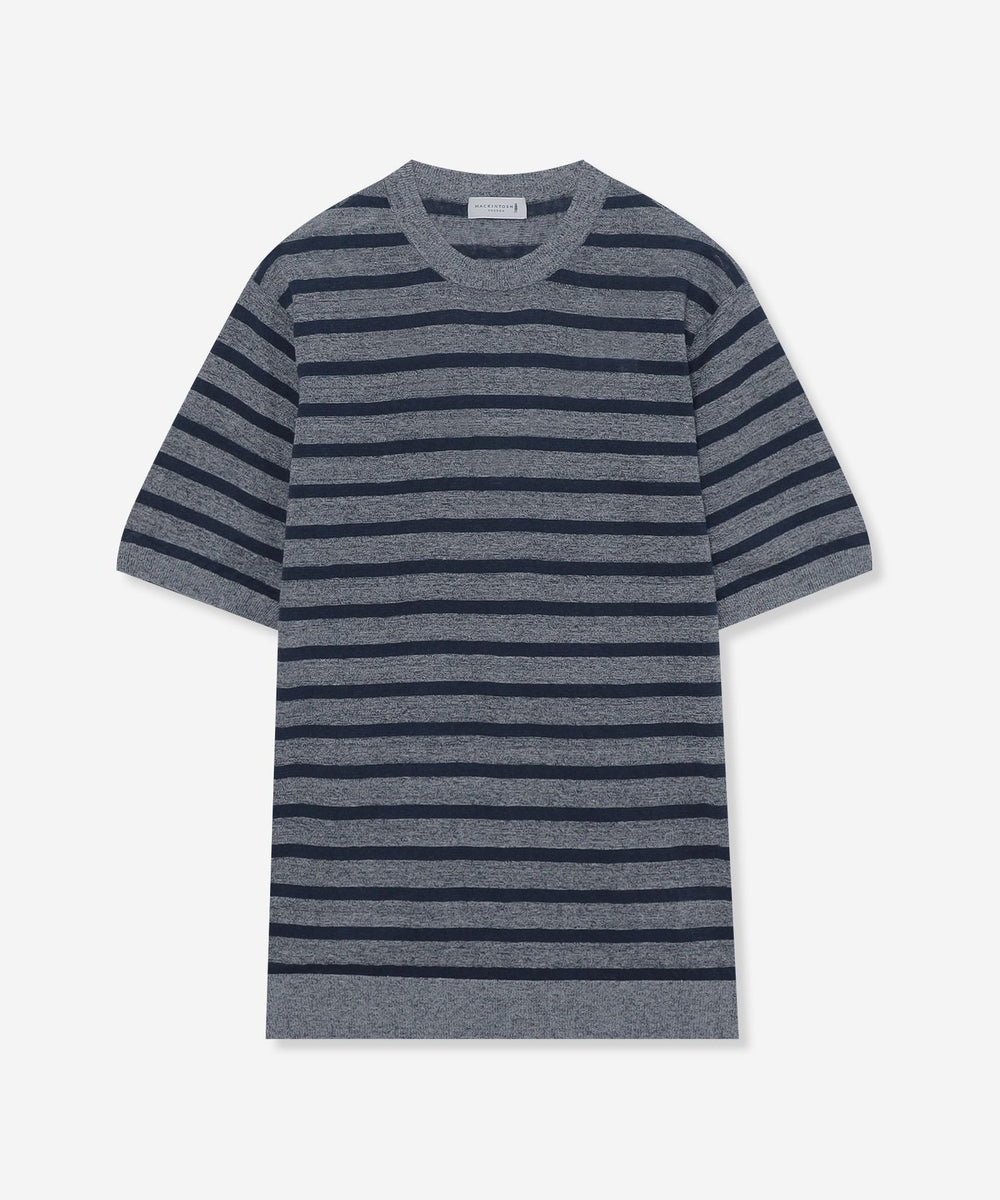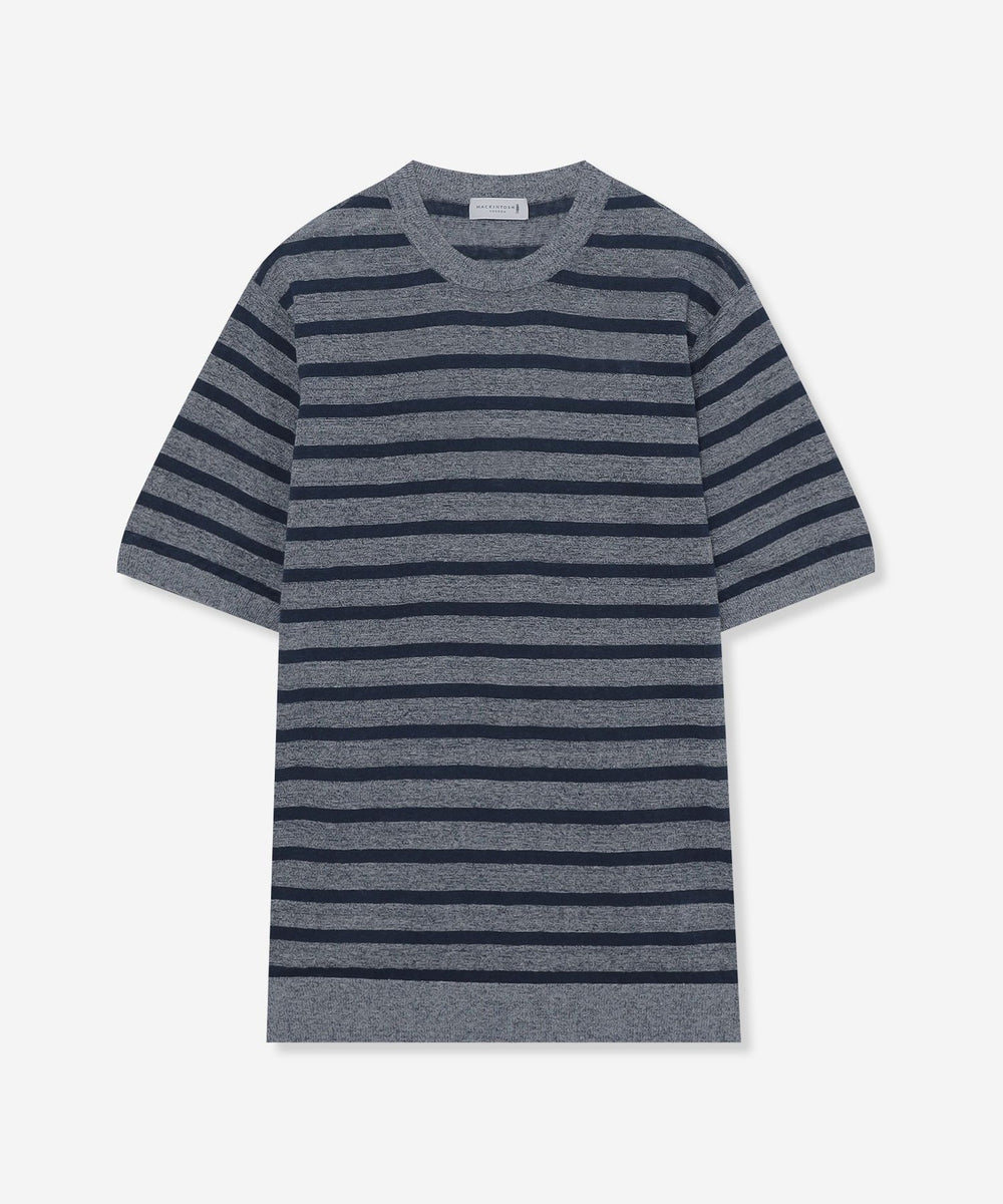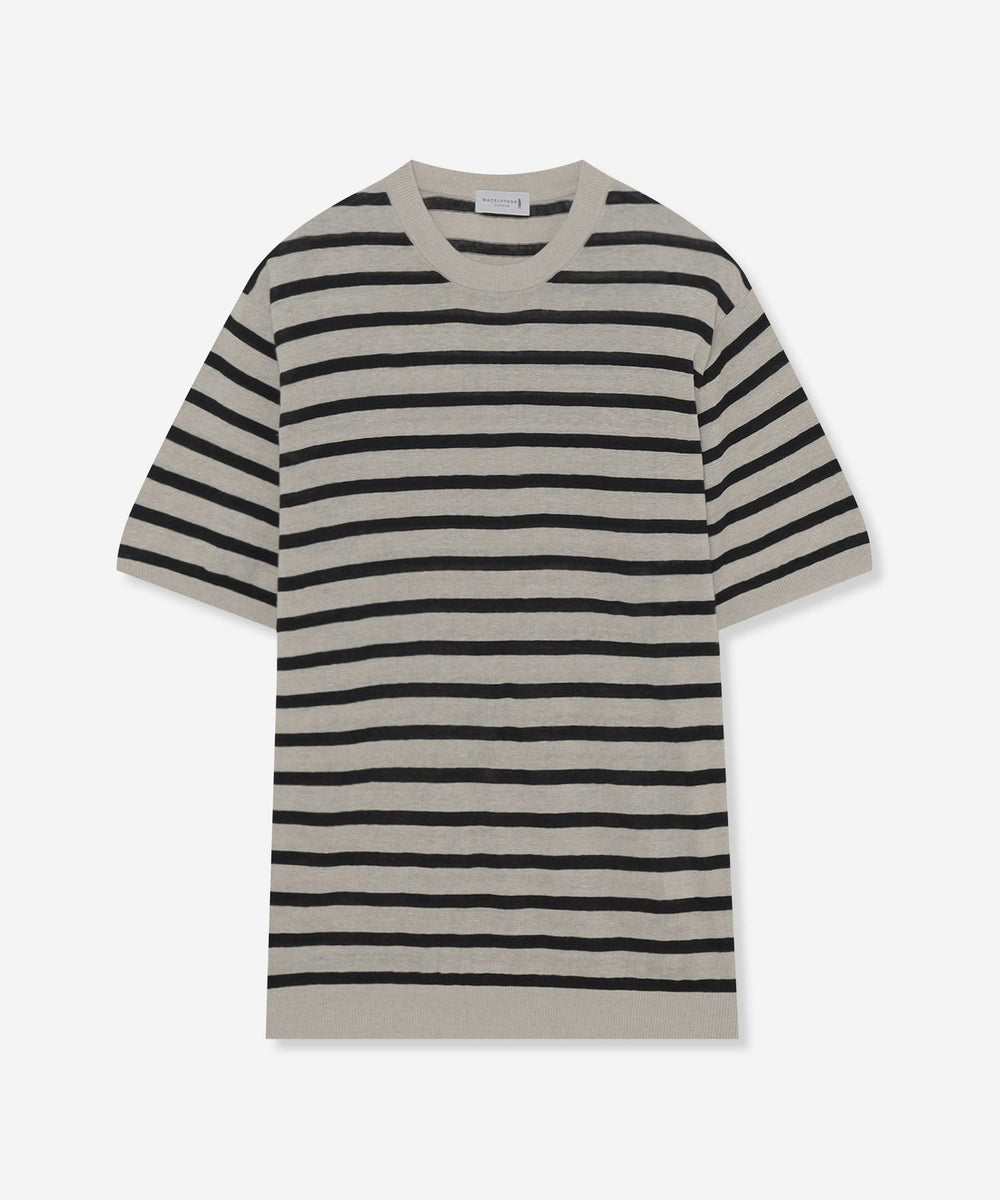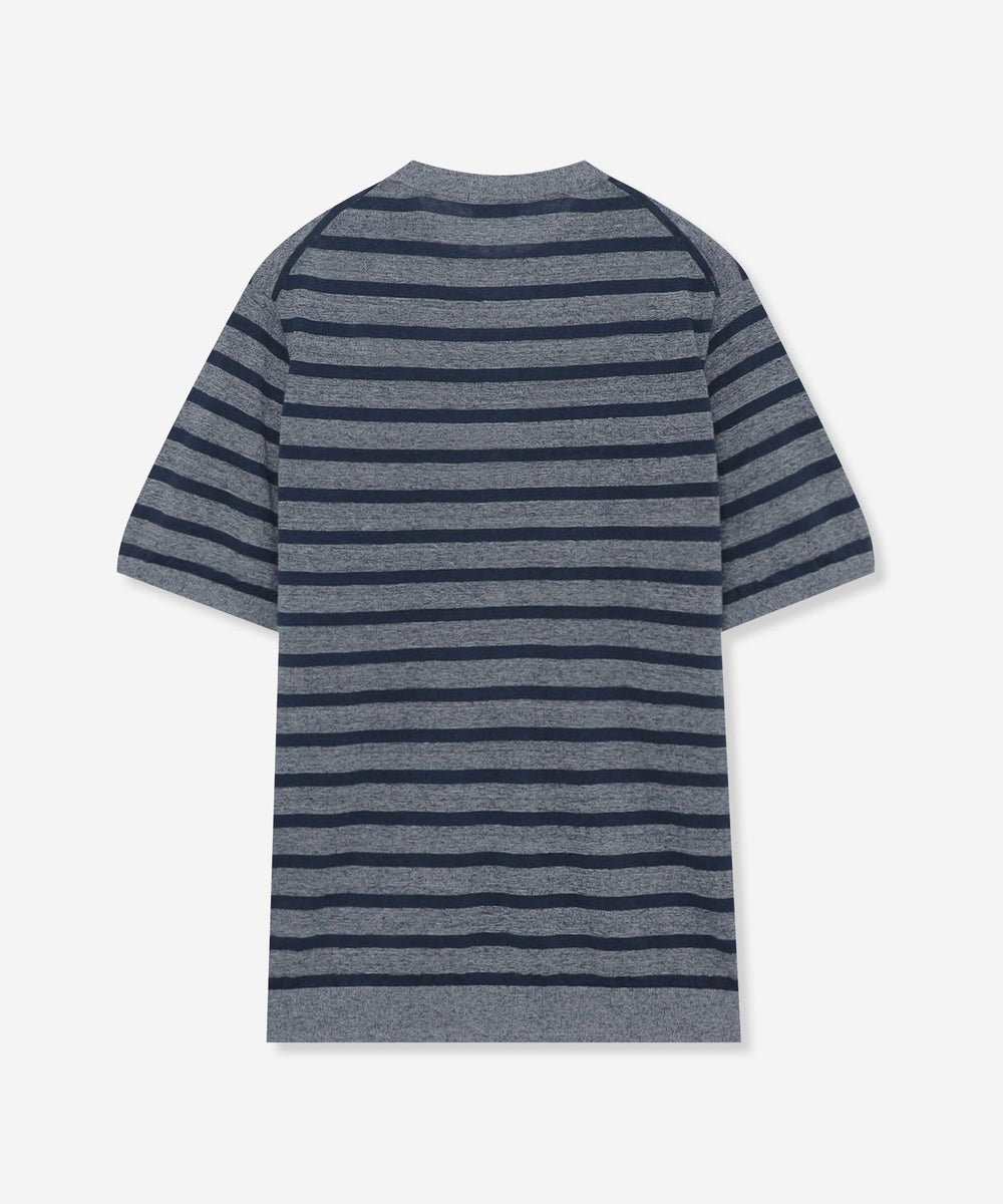 レギュラーフィットの半袖クルーネックプルオーバーです。シンプルなボーダー柄で1枚で着てもサマになる大人のニットTシャツです。