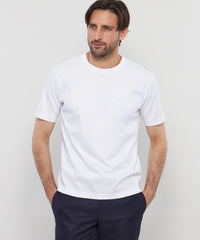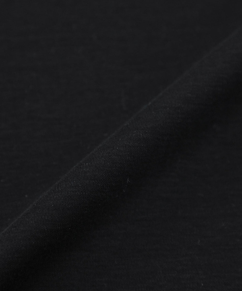 上質な細い綿糸を表裏2枚重なるように編まれており、適度な膨らみ感と滑らかな表面の生地です。仕上げに光沢感の出る加工を施すことで、毛羽の少ないきれいな目面で柔らかい風合いに仕上がりました。