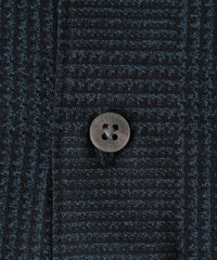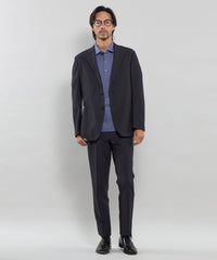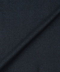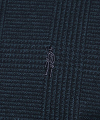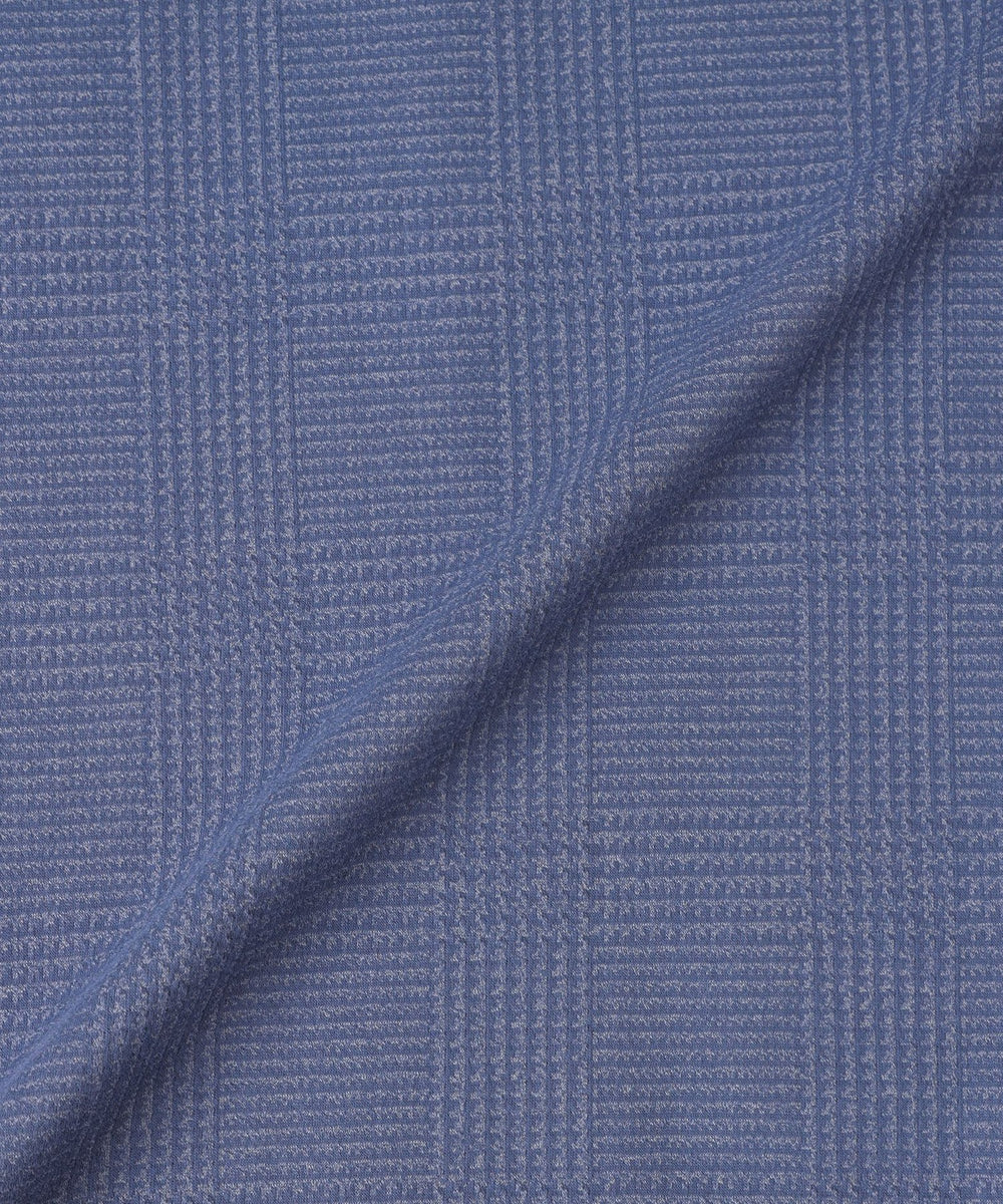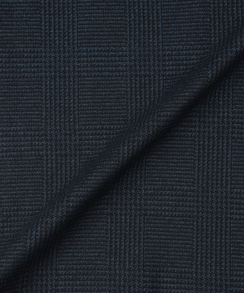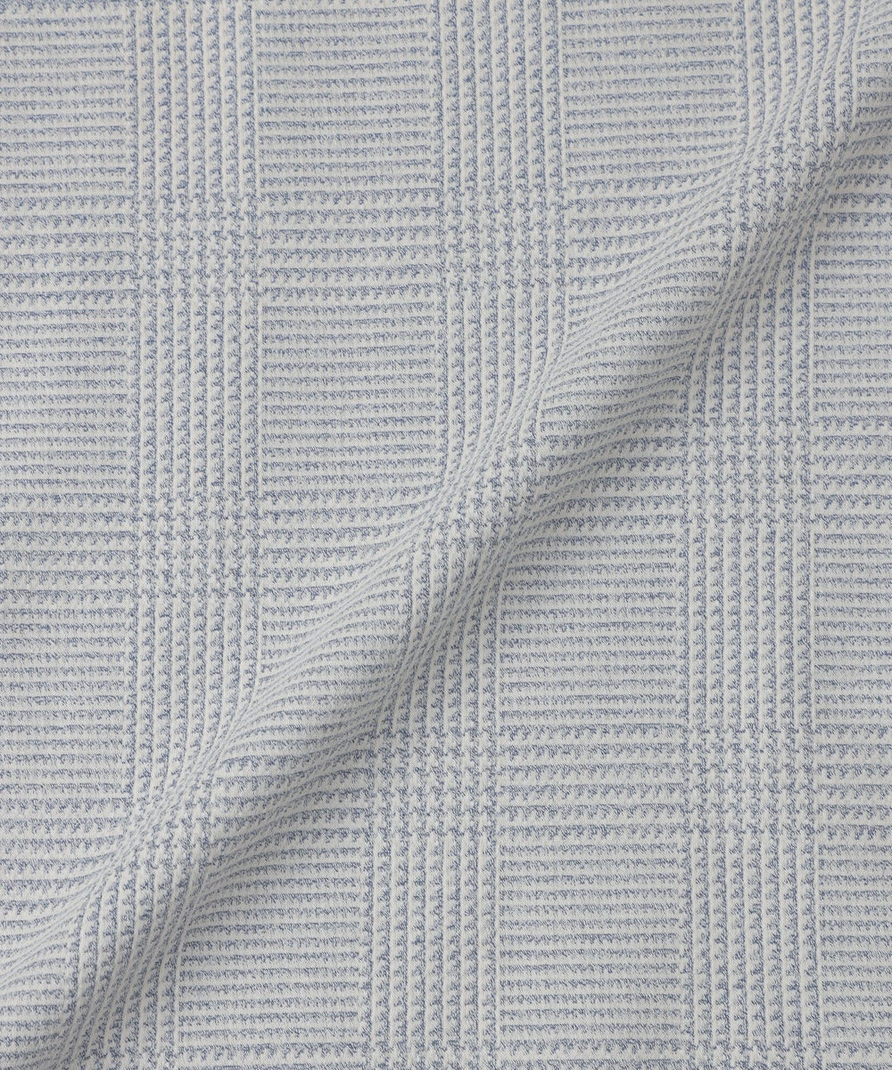 ハイゲージのジャカード機で編んだ繊細なグレンチェック柄のジャージー素材です。ムリネ糸を用い織物のような見え方に拘りました。肉感の厚くなりがちなジャカード編みですが、細番手の糸をハイゲージで薄く編むことで余計な厚みの無いスッキリとした肉感に仕上がりました。ハリ感を持たせるフィニッシュにしている為、身体のラインを拾いにくくキレイ目な印象になる点もこだわったポイントです。