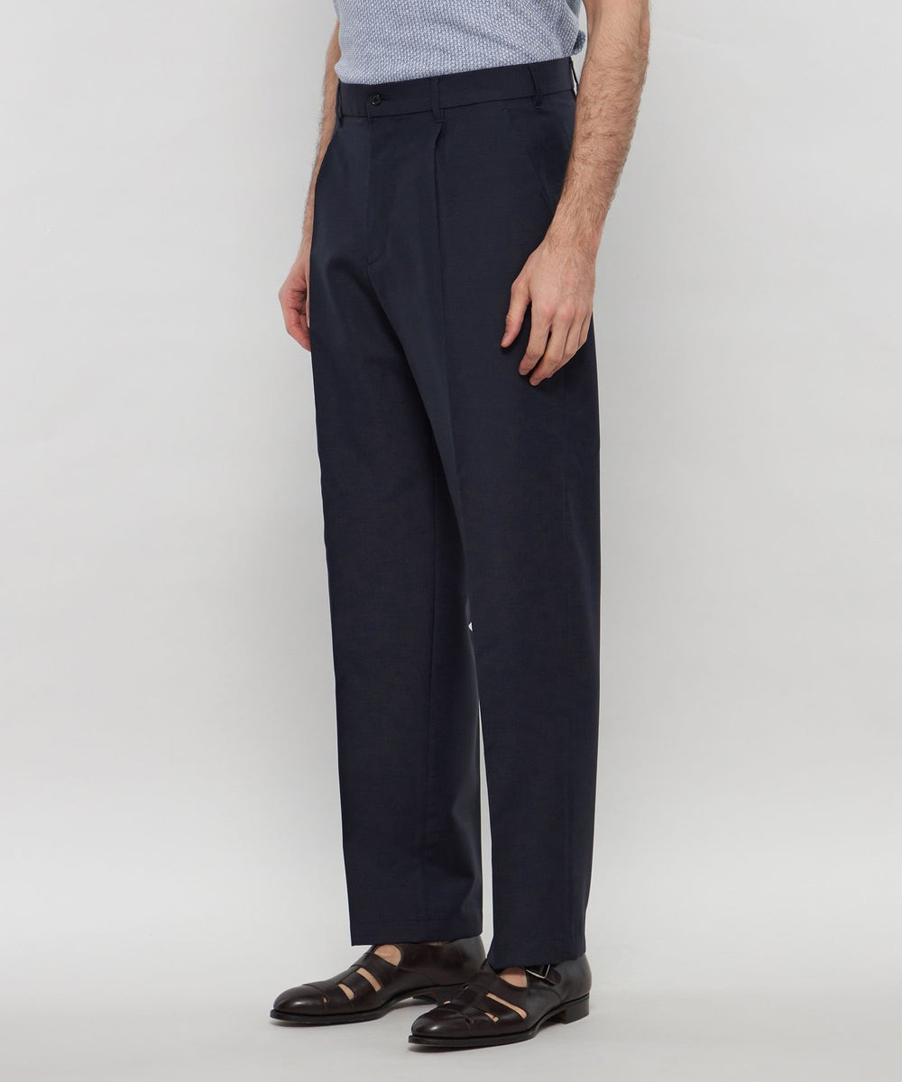 ゆったりしたシルエットの1プリーツトラウザースです。適度なゆとりのヒザ周りから裾に向けて緩やかに絞られるスッキリとしたラインのトラウザースです。
