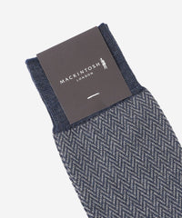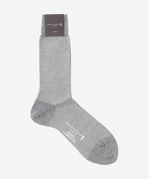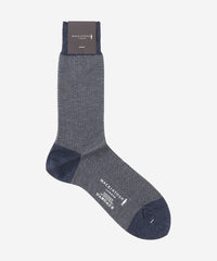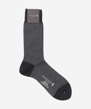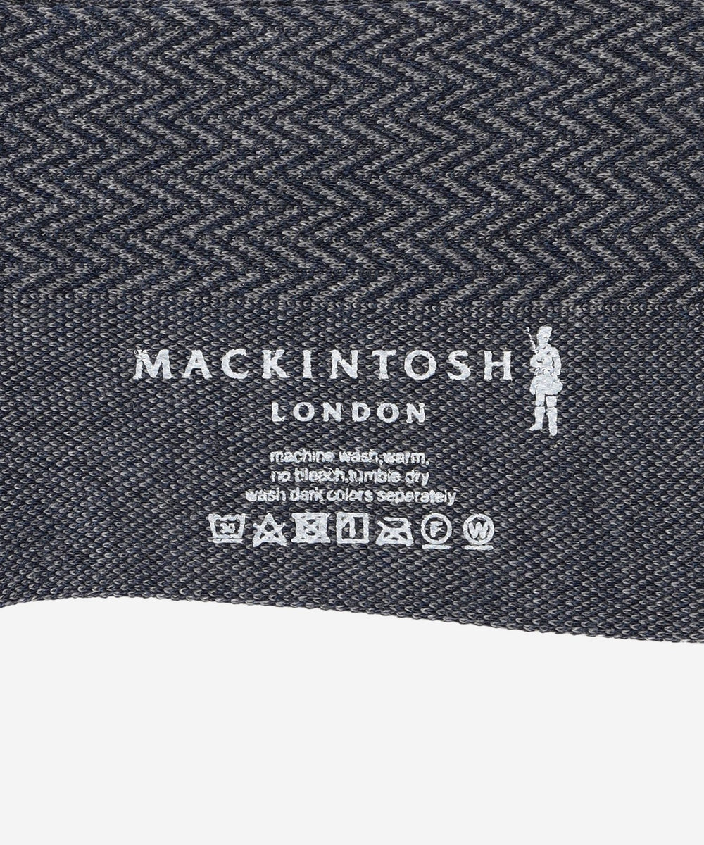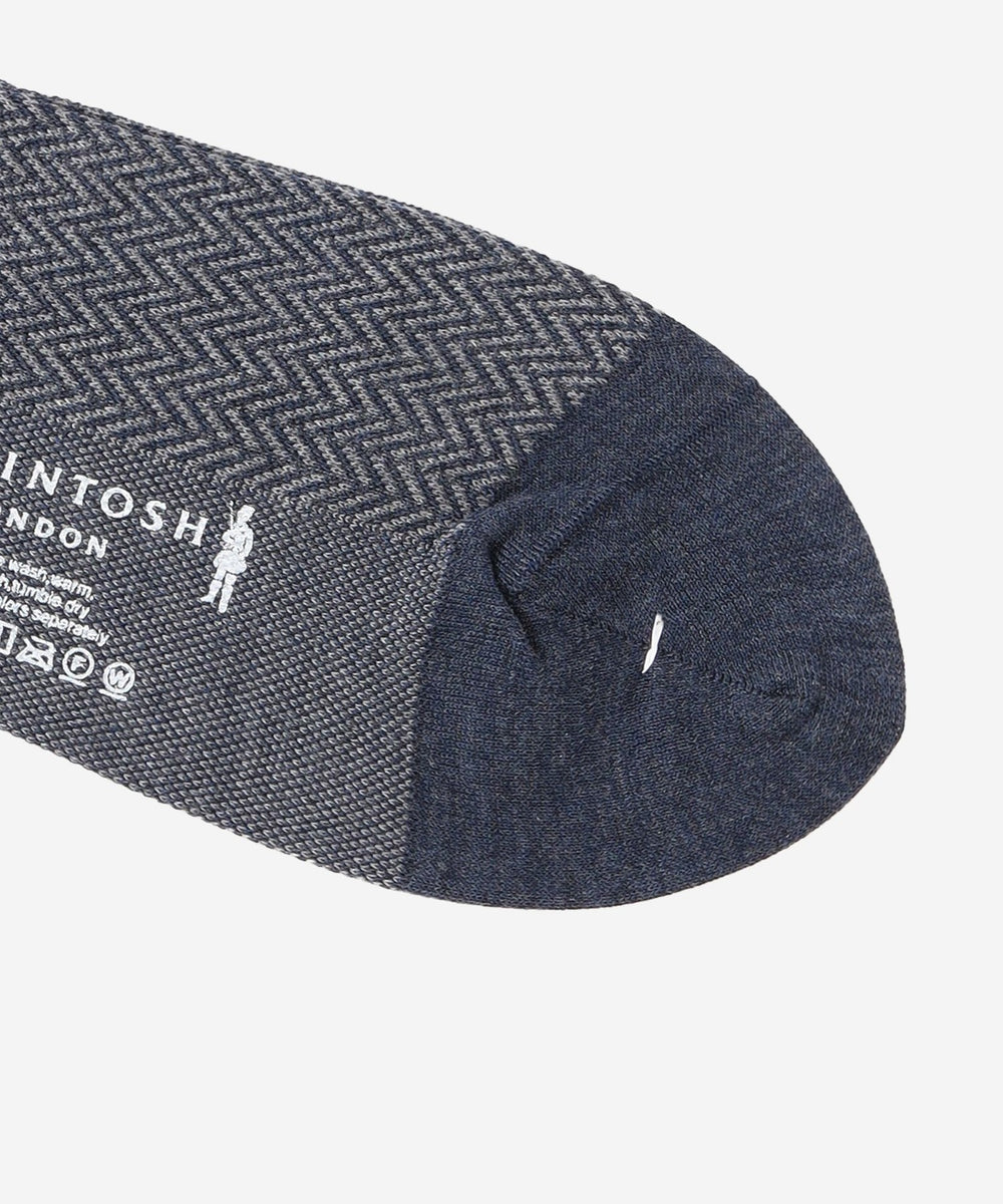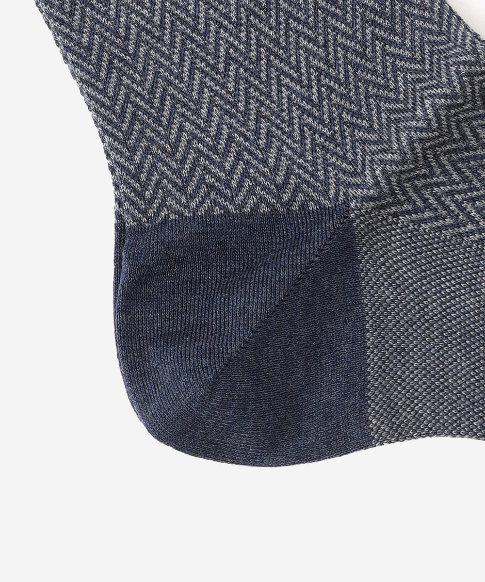 エジプト綿で作成したヘリンボーン柄のソックスです。綿本来の上質さに加え、毛羽をガスで焼くことで、柔軟性・耐久性・色の美しさ・光沢感が特徴です。縫製に関しての特徴は、つま先(指の付け根あたり)と本体とのつなぎ目を、編み目1目1目を職人の手作業によって縫合することで、つなぎ目がフラットで肌に当たるストレスがないことです。昨今、国内はもとより海外でも少なくなっている貴重な縫製技術となります。クラシックな柄域ででトレンドに左右されることなく、かつ履き心地にも配慮して作成された逸品となっています。