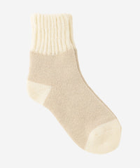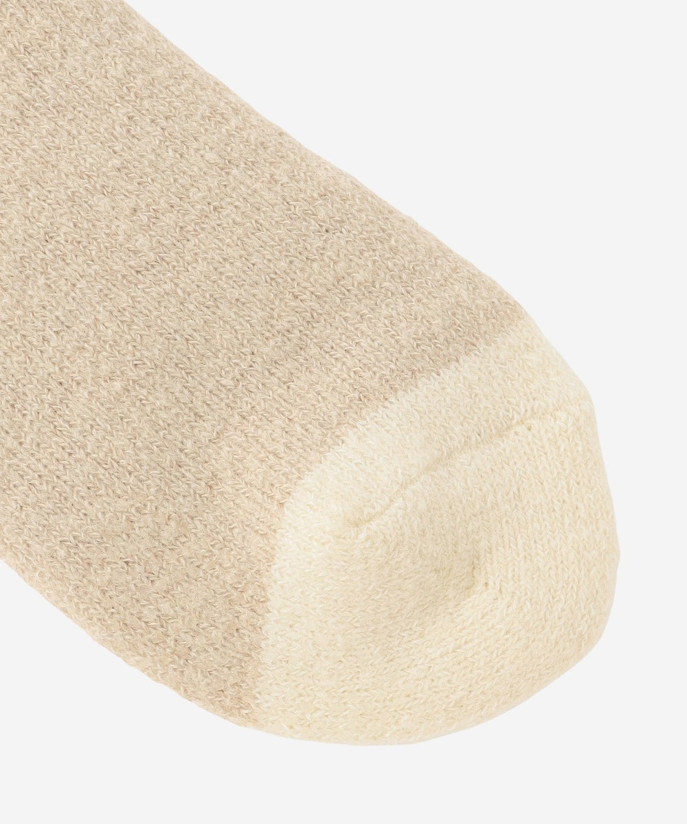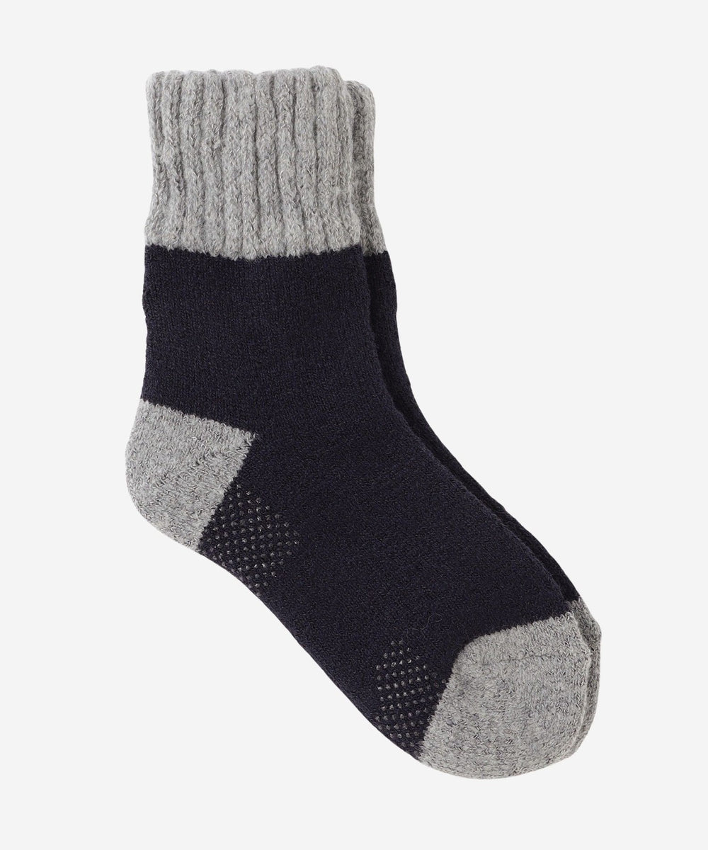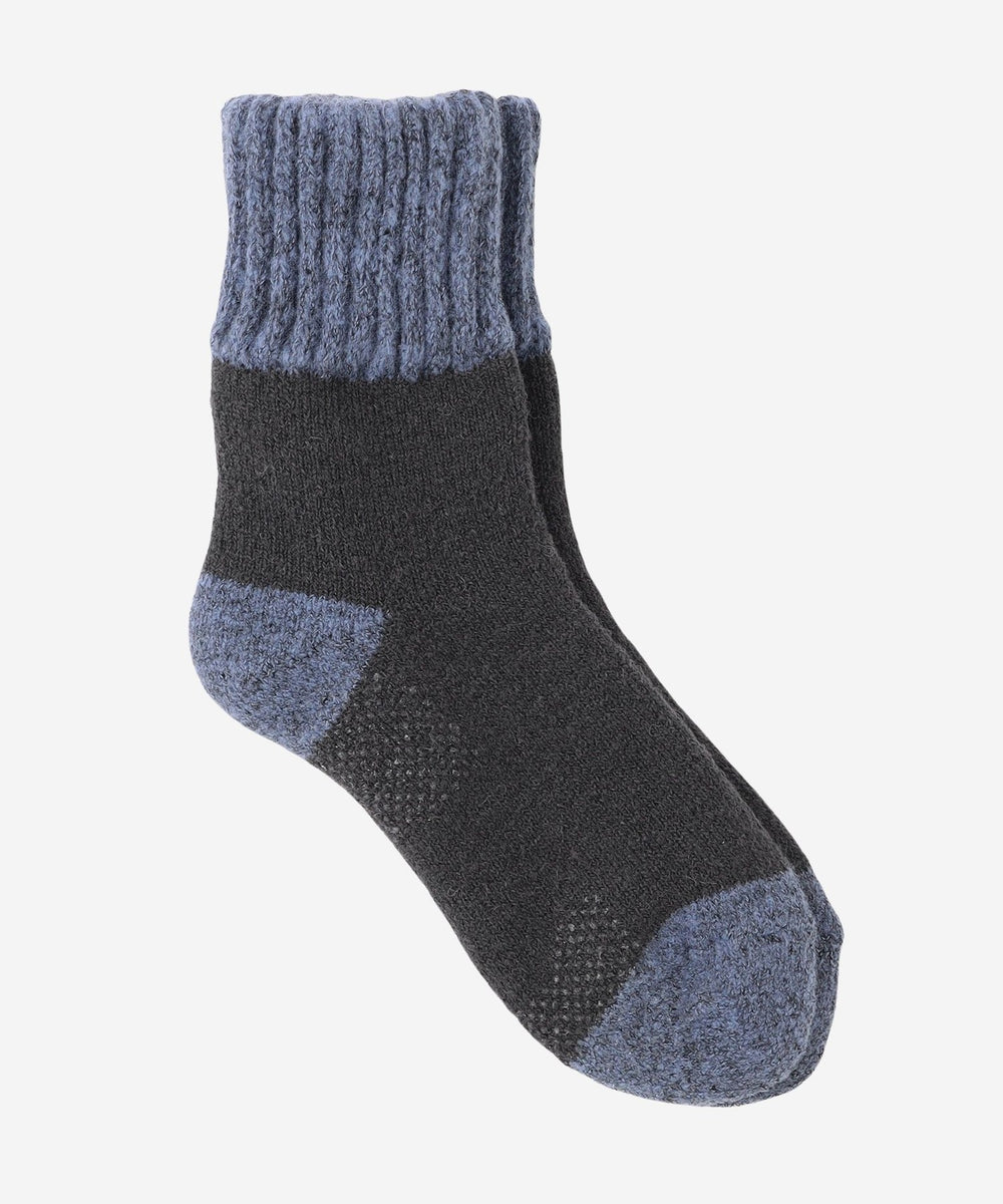 ローゲージのパイル編み機で作ったルームソックスはふんわりあたたか。くちゴム部分は特殊な編地でふんわりやわらか。足底部分にはすべりどめもついてます。