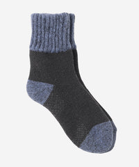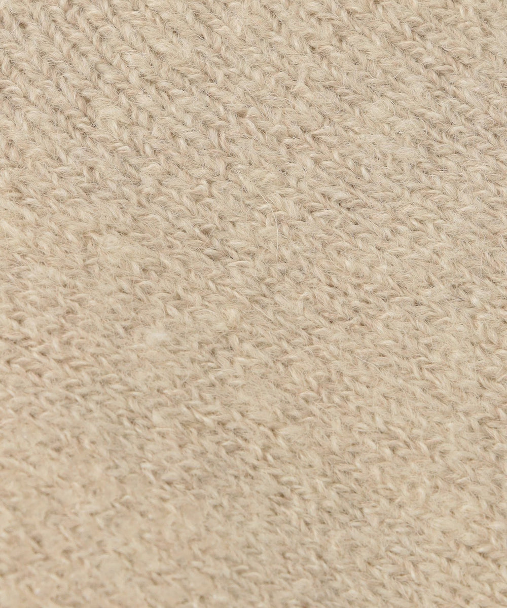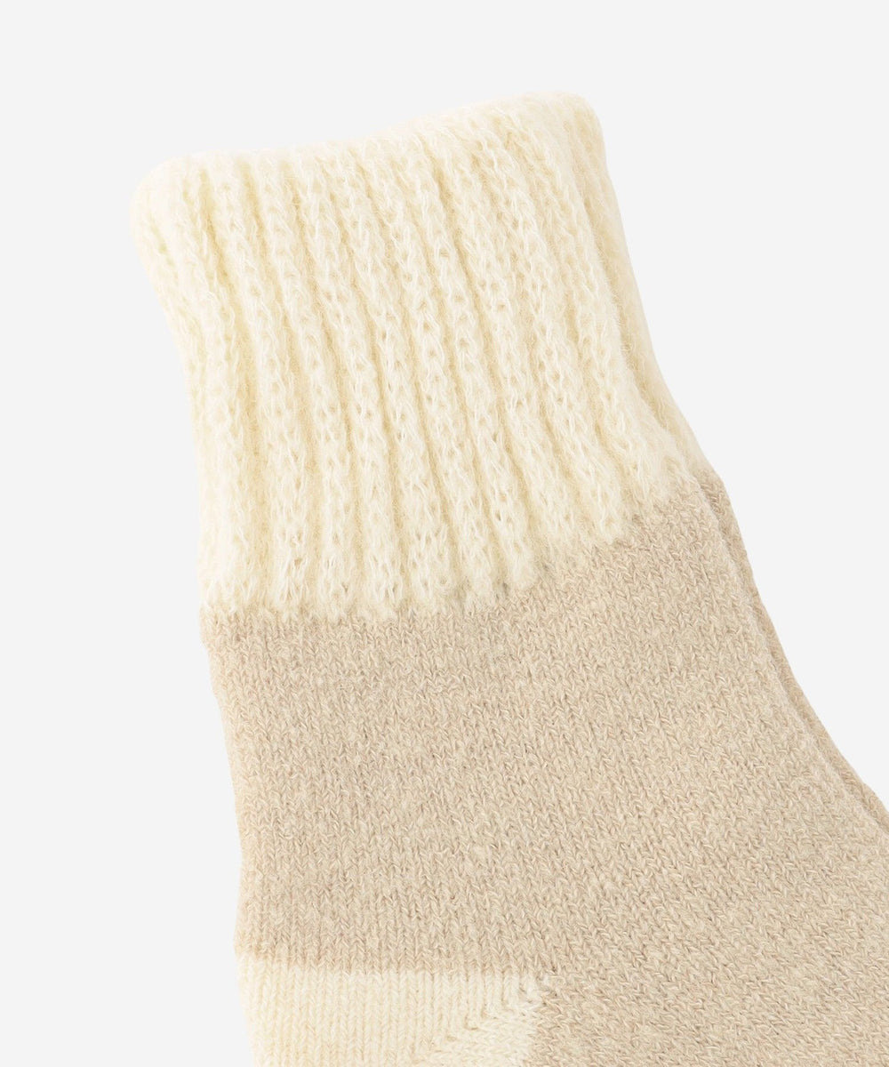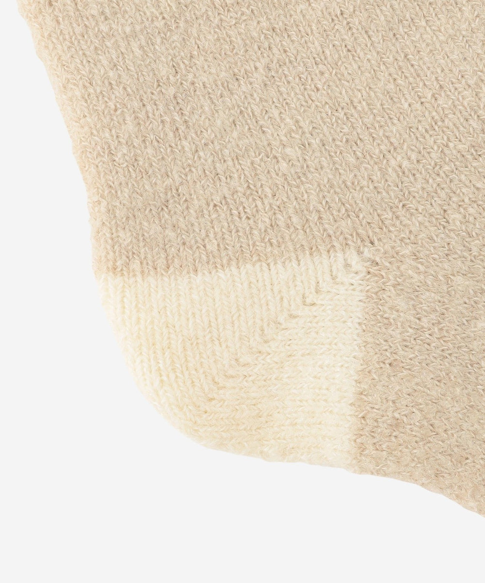 ローゲージのパイル編み機で作ったルームソックスはふんわりあたたか。くちゴム部分は特殊な編地でふんわりやわらか。足底部分にはすべりどめもついてます。