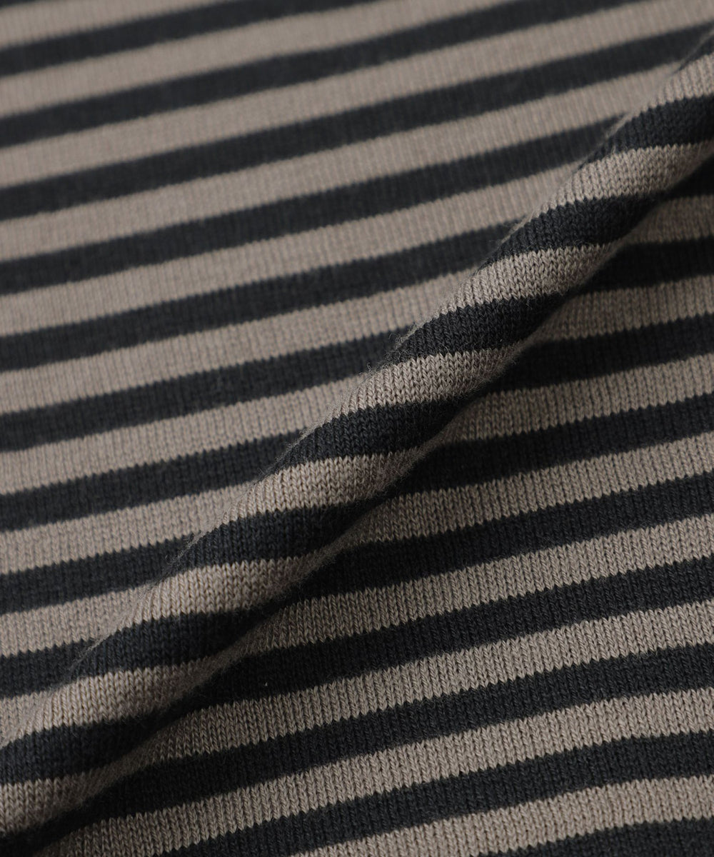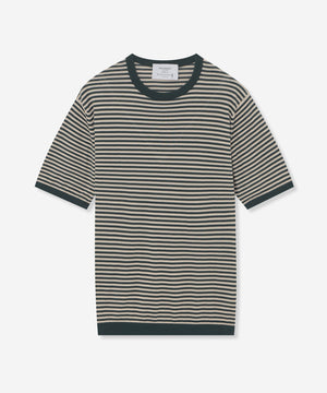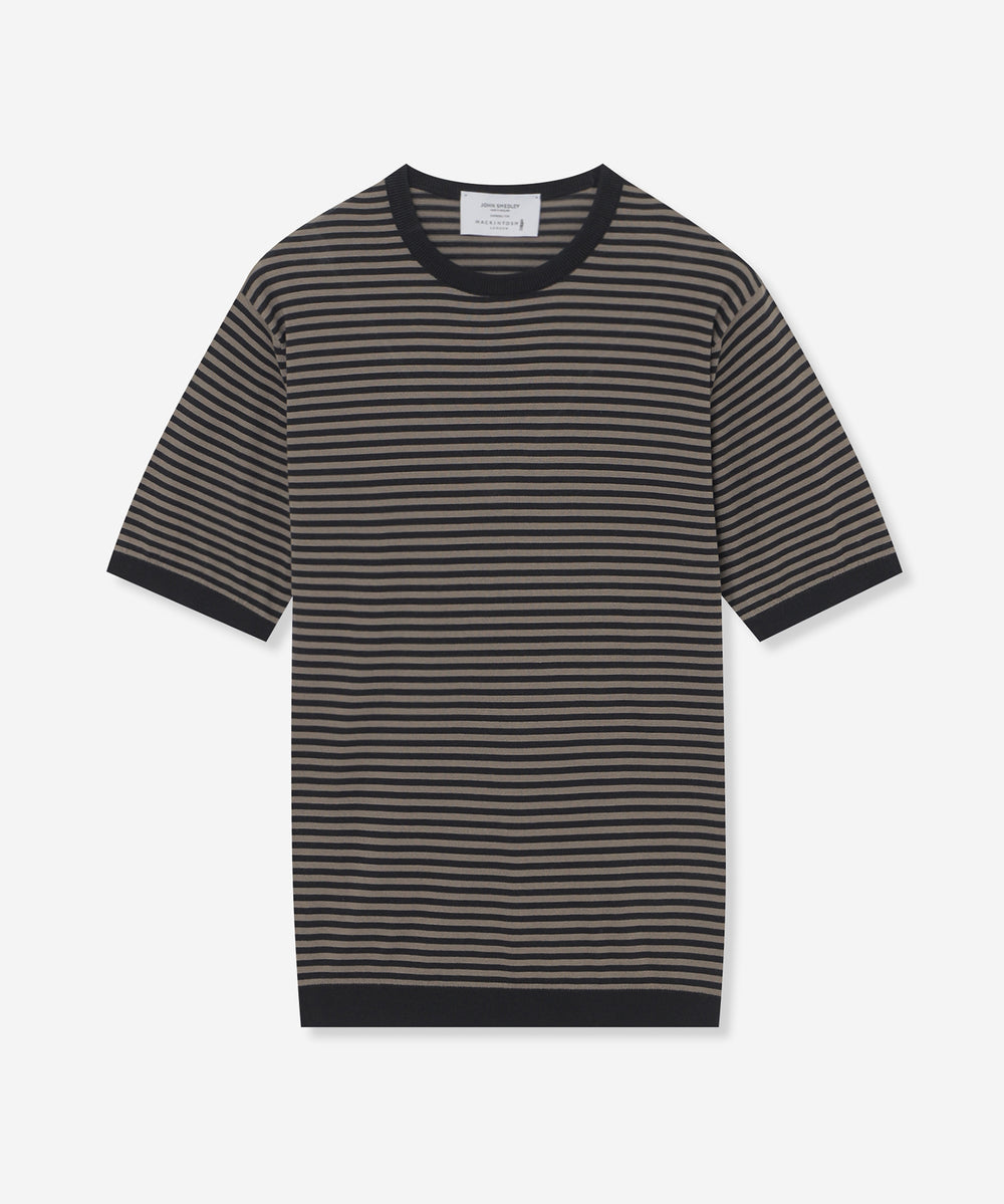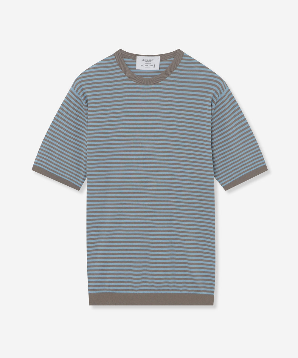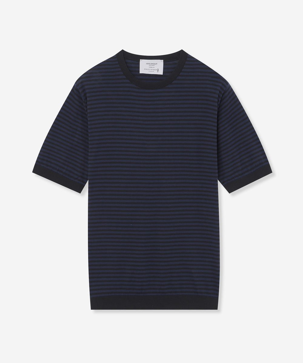 JOHN SMEDLEYのなかでも人気の高い日本別注コレクションの半袖クルーネックニットT。今回はこのクルーネックニットTを元にサイズ感や柄をMACKINTOSH LONDONで別注して表現しました。配色と幅に拘った5㎜ピッチの細巾のストライプは知的で洗練された雰囲気です。サイズも日本人に合わせたサイズ感に微修正しており、限定の特別なコラボネームが付きます。