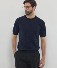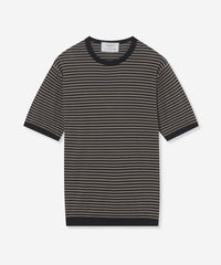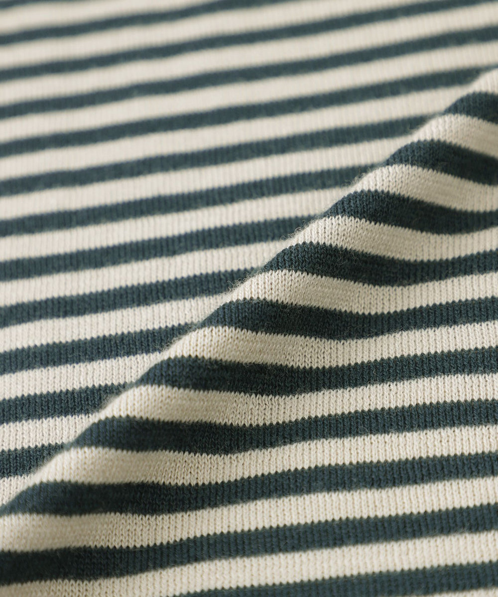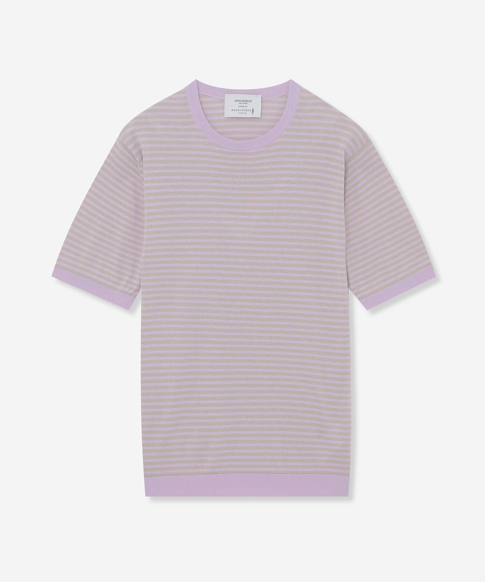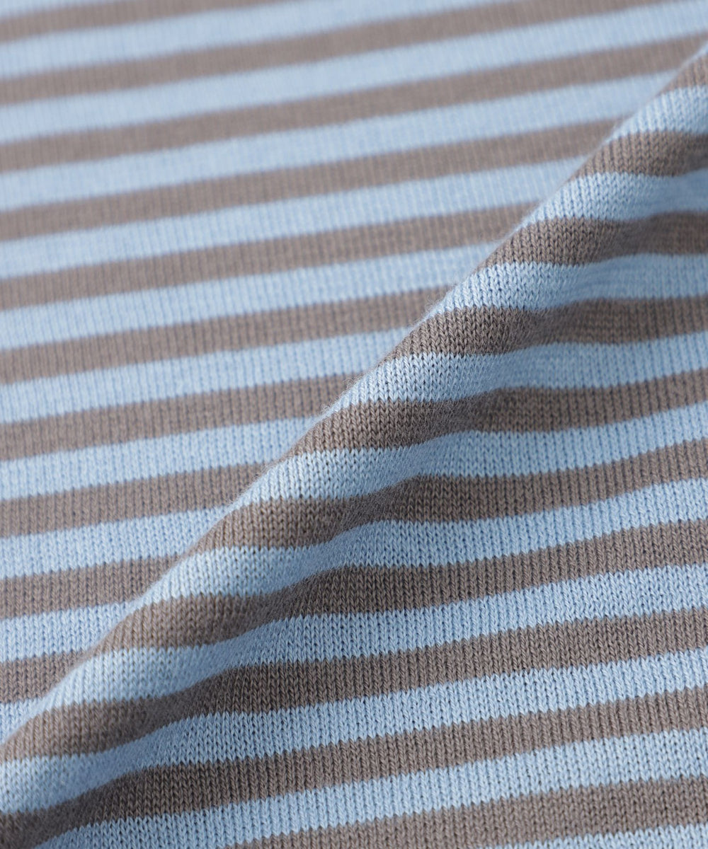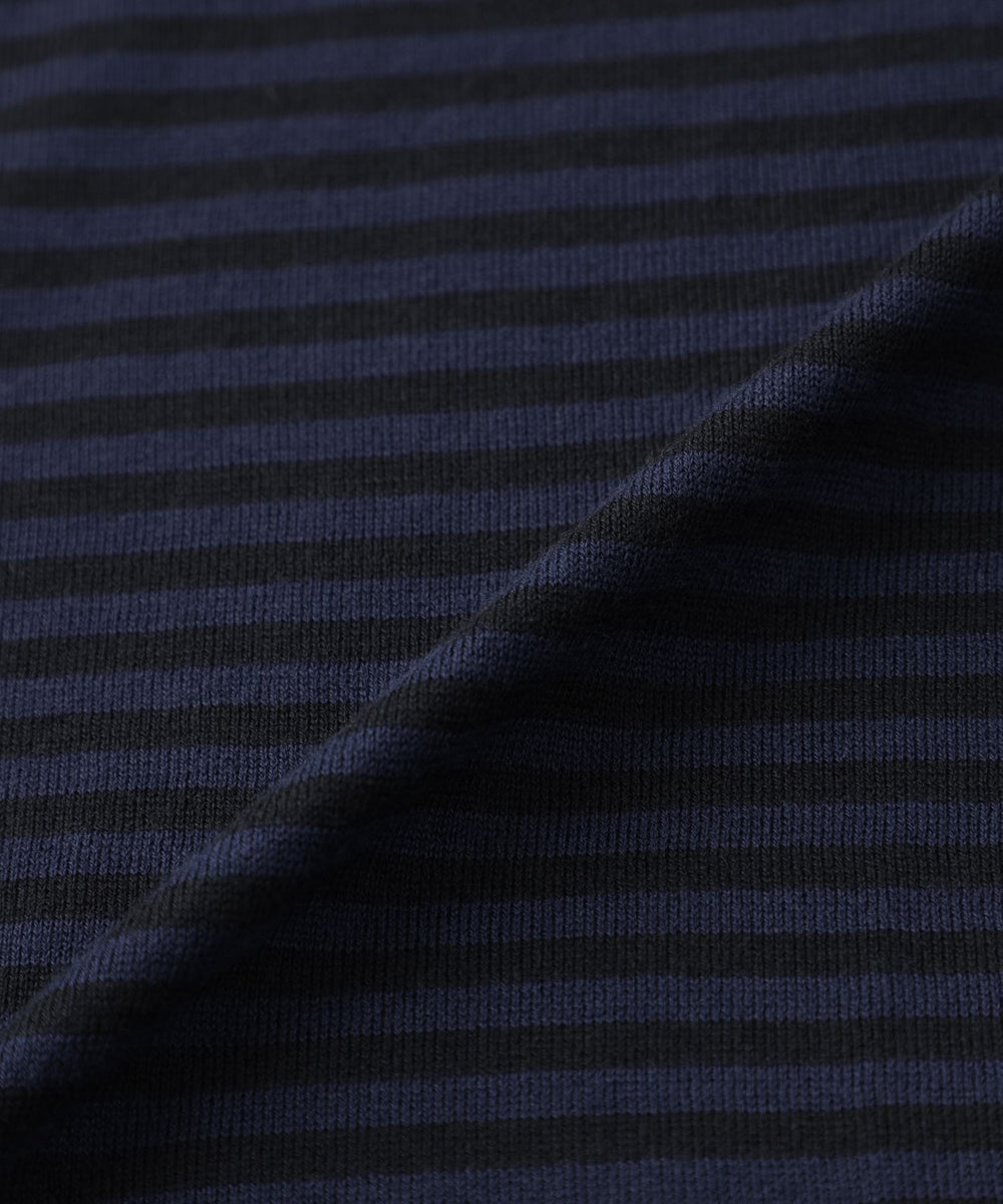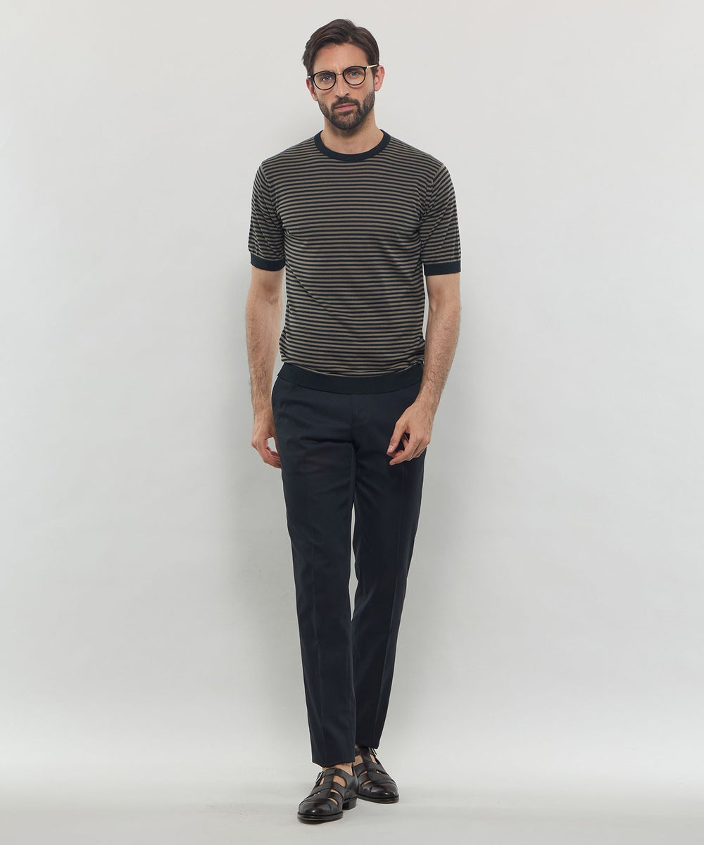 JOHN SMEDLEYのなかでも人気の高い日本別注コレクションの半袖クルーネックニットT。今回はこのクルーネックニットTを元にサイズ感や柄をMACKINTOSH LONDONで別注して表現しました。配色と幅に拘った5㎜ピッチの細巾のストライプは知的で洗練された雰囲気です。サイズも日本人に合わせたサイズ感に微修正しており、限定の特別なコラボネームが付きます。