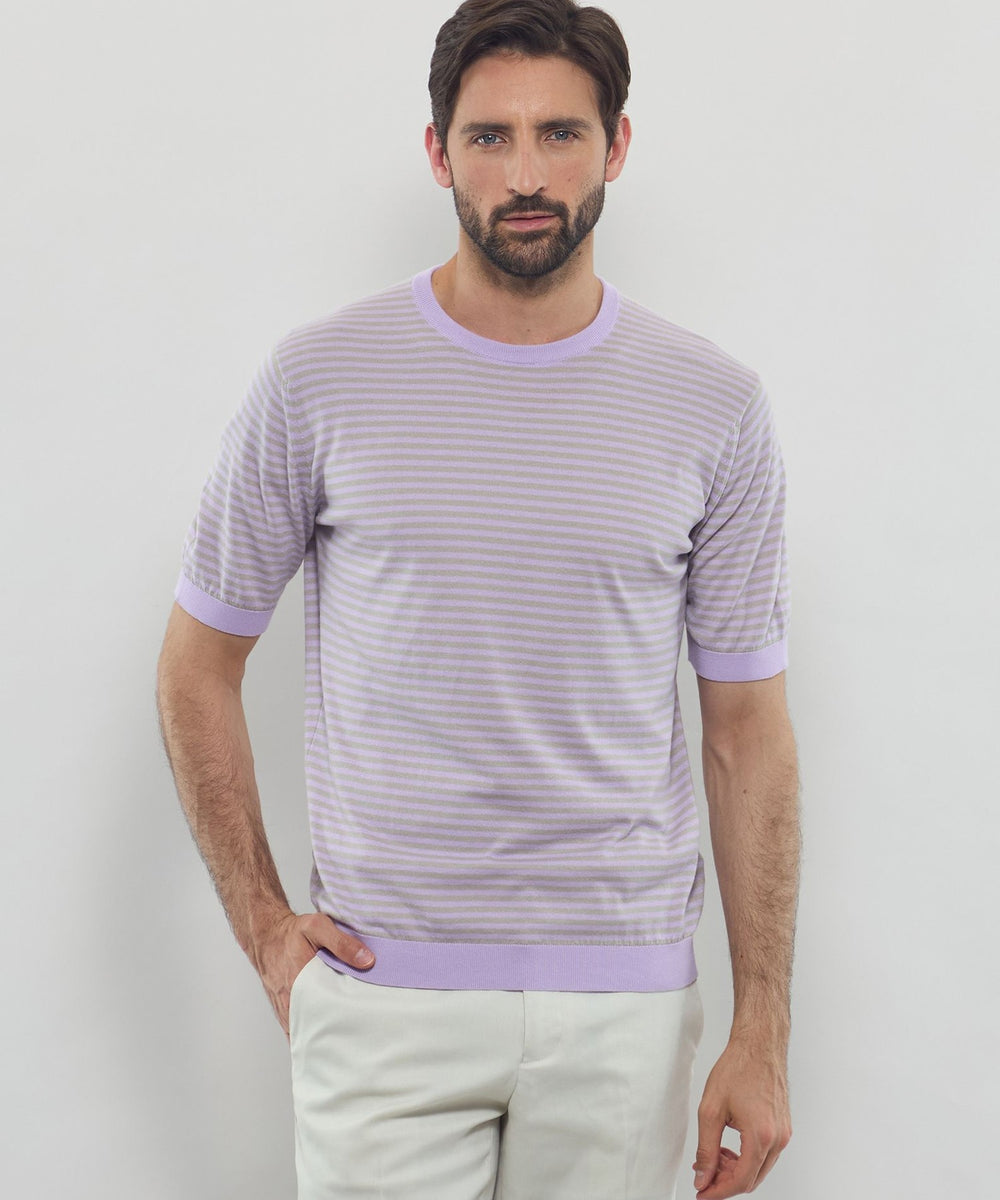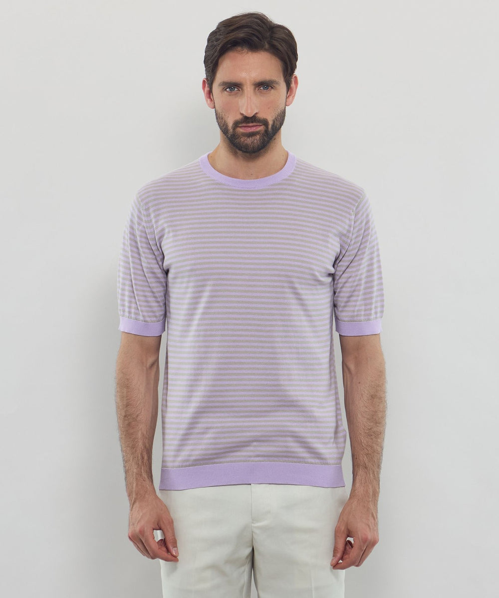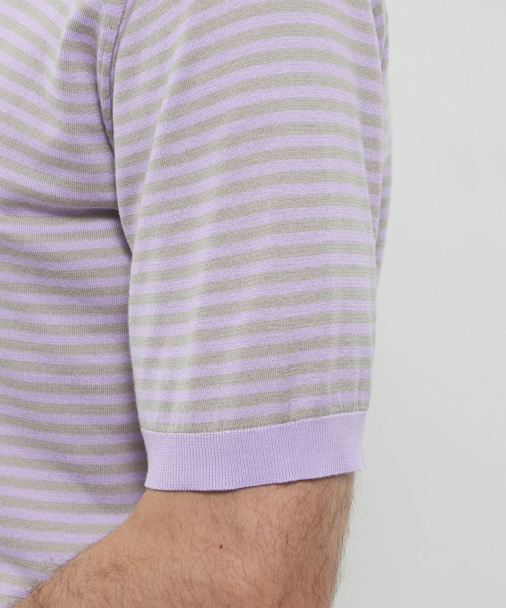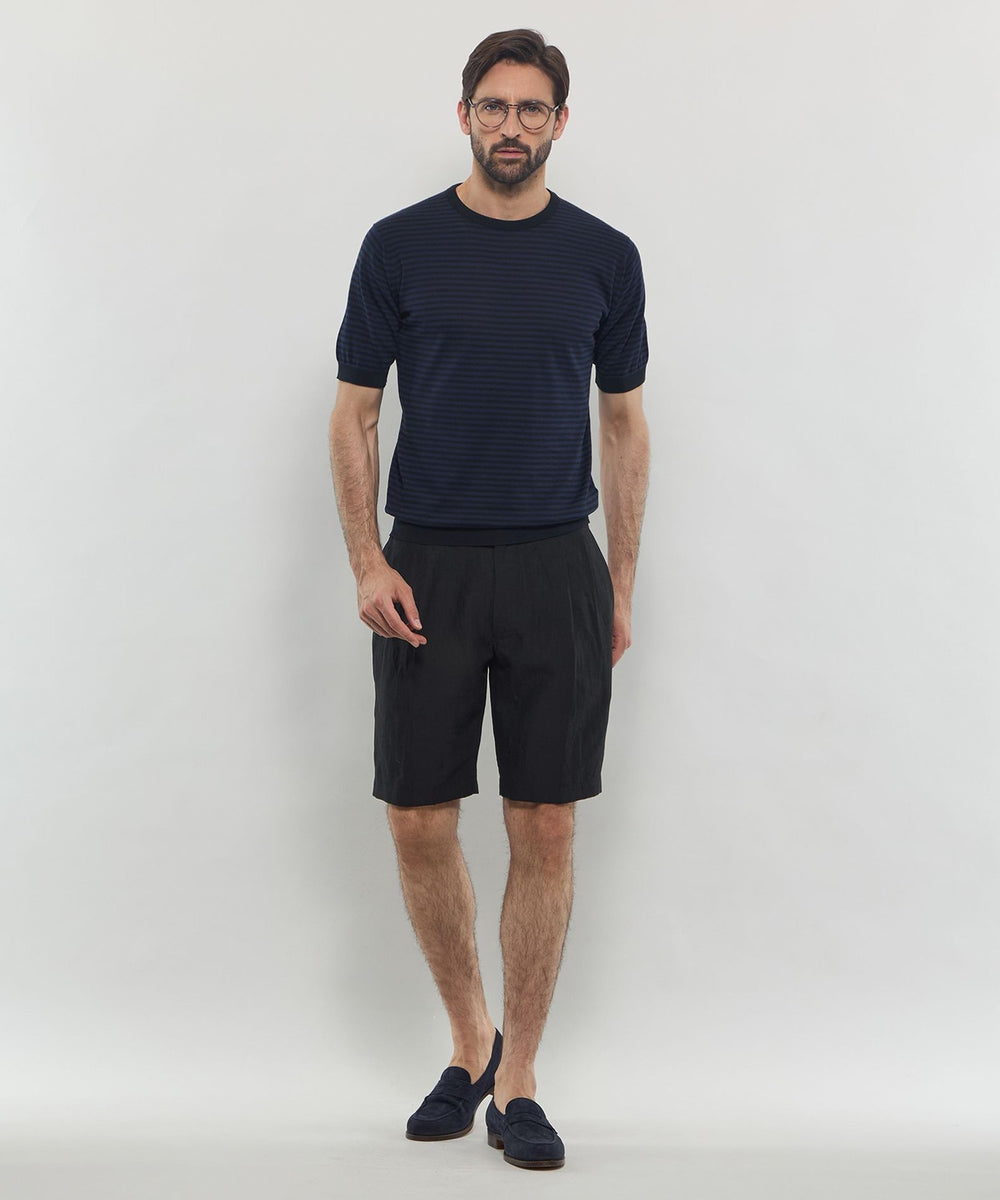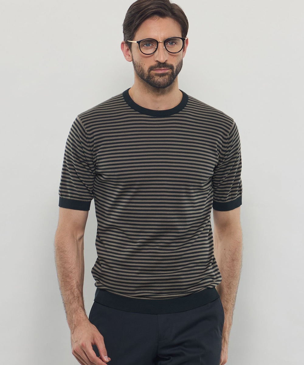 JOHN SMEDLEYのなかでも人気の高い日本別注コレクションの半袖クルーネックニットT。今回はこのクルーネックニットTを元にサイズ感や柄をMACKINTOSH LONDONで別注して表現しました。配色と幅に拘った5㎜ピッチの細巾のストライプは知的で洗練された雰囲気です。サイズも日本人に合わせたサイズ感に微修正しており、限定の特別なコラボネームが付きます。