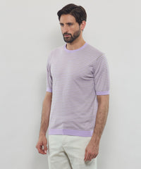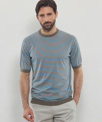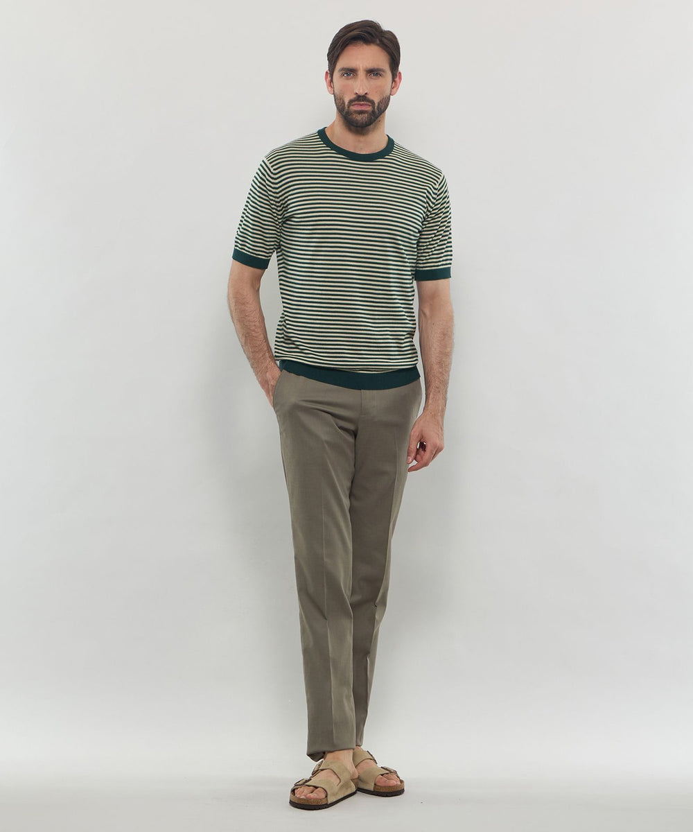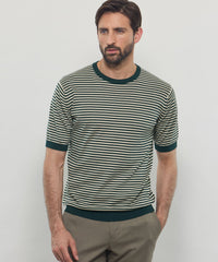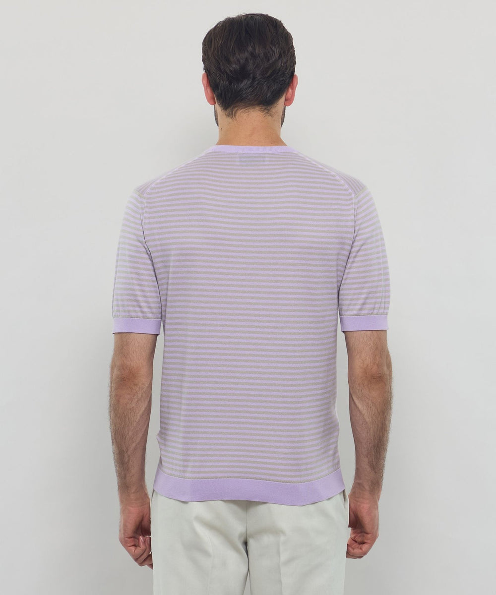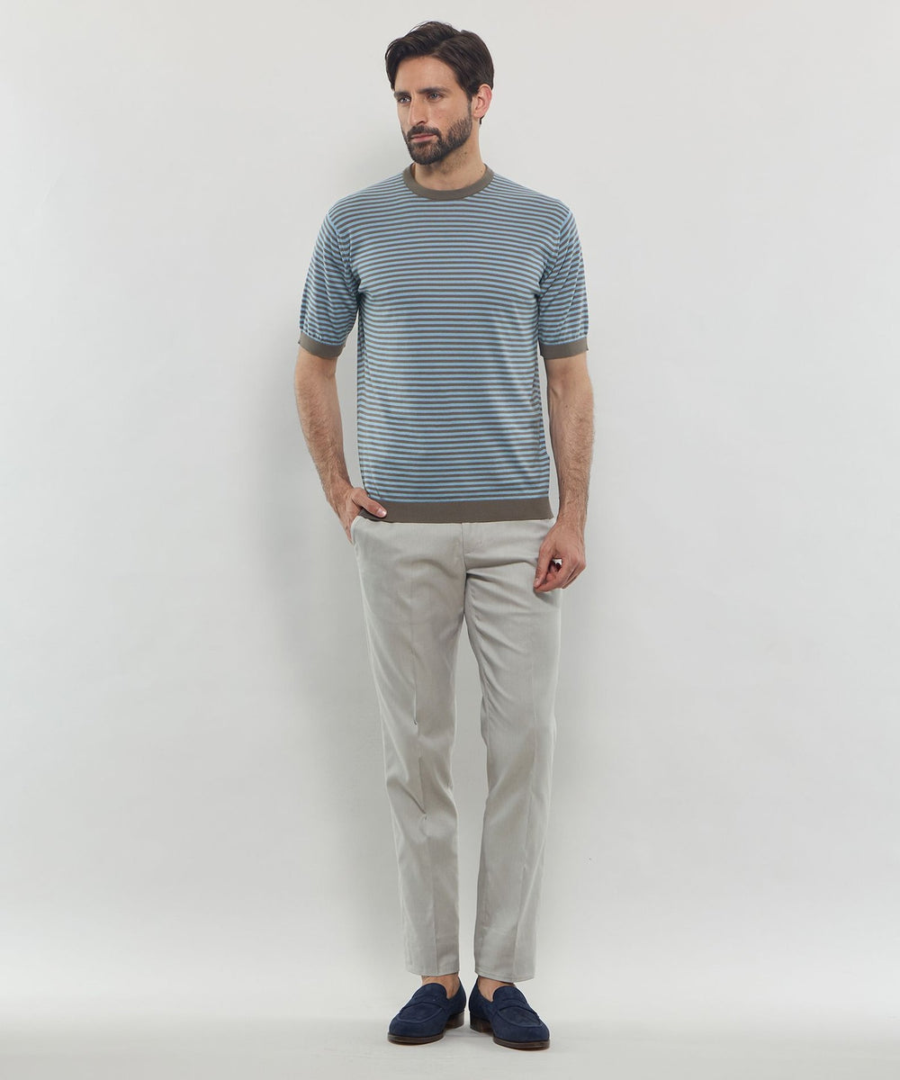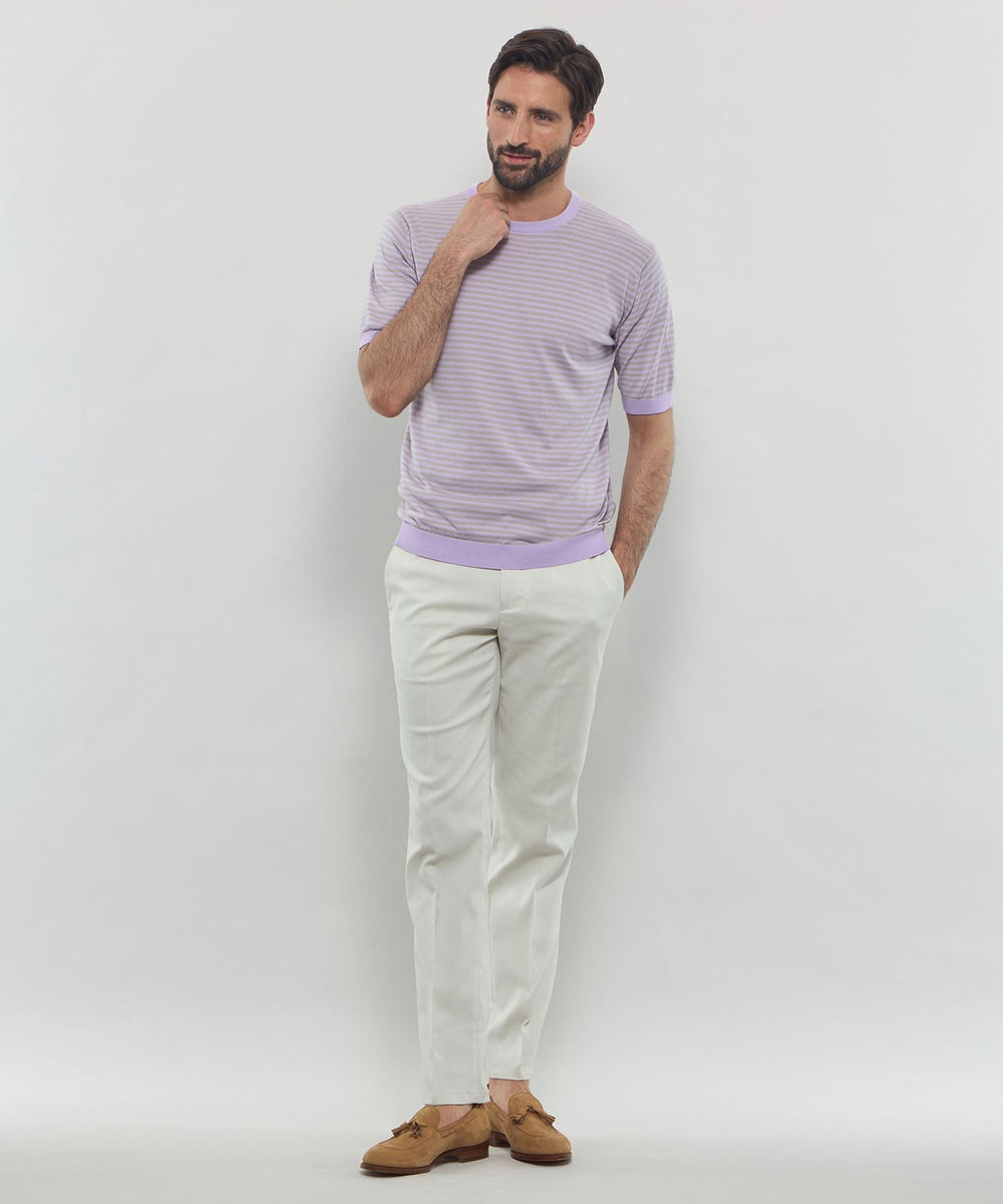 JOHN SMEDLEYのなかでも人気の高い日本別注コレクションの半袖クルーネックニットT。今回はこのクルーネックニットTを元にサイズ感や柄をMACKINTOSH LONDONで別注して表現しました。配色と幅に拘った5㎜ピッチの細巾のストライプは知的で洗練された雰囲気です。サイズも日本人に合わせたサイズ感に微修正しており、限定の特別なコラボネームが付きます。