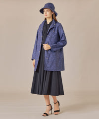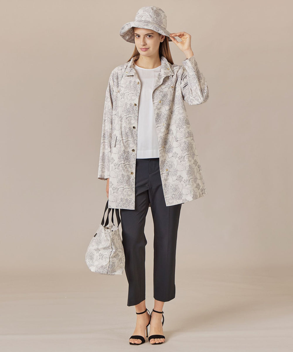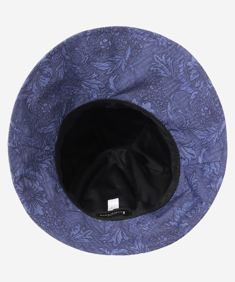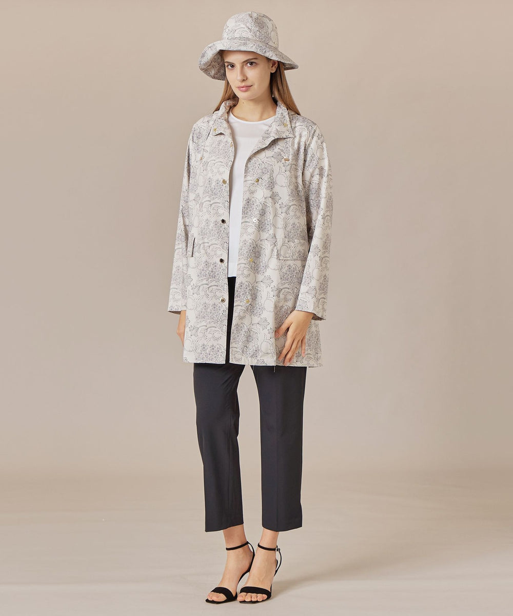 バイブリーフラワープリントのタフタ生地を使用した帽子です。白は線画、ネイビーはジャカード風のプリントでバイブリーフラワーを表現しています。つば部分には1級遮光の芯が貼られており、紫外線・暑さケア出来ます。また、表地ははっ水性のある生地を使用し雨が降った時にも便利です。内側後方のサイズリボンでサイズが調節できます。熟練した職人によって丁寧に作られたMADE IN JAPANの帽子です。共地のコート(品番:G5A11556)もご用意しております。