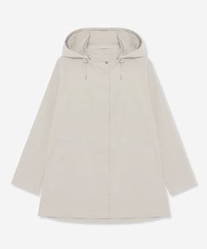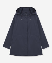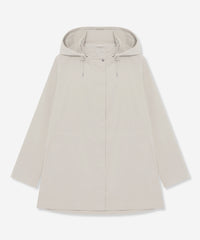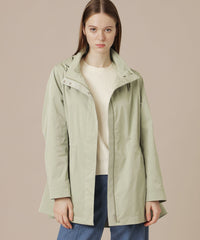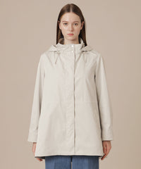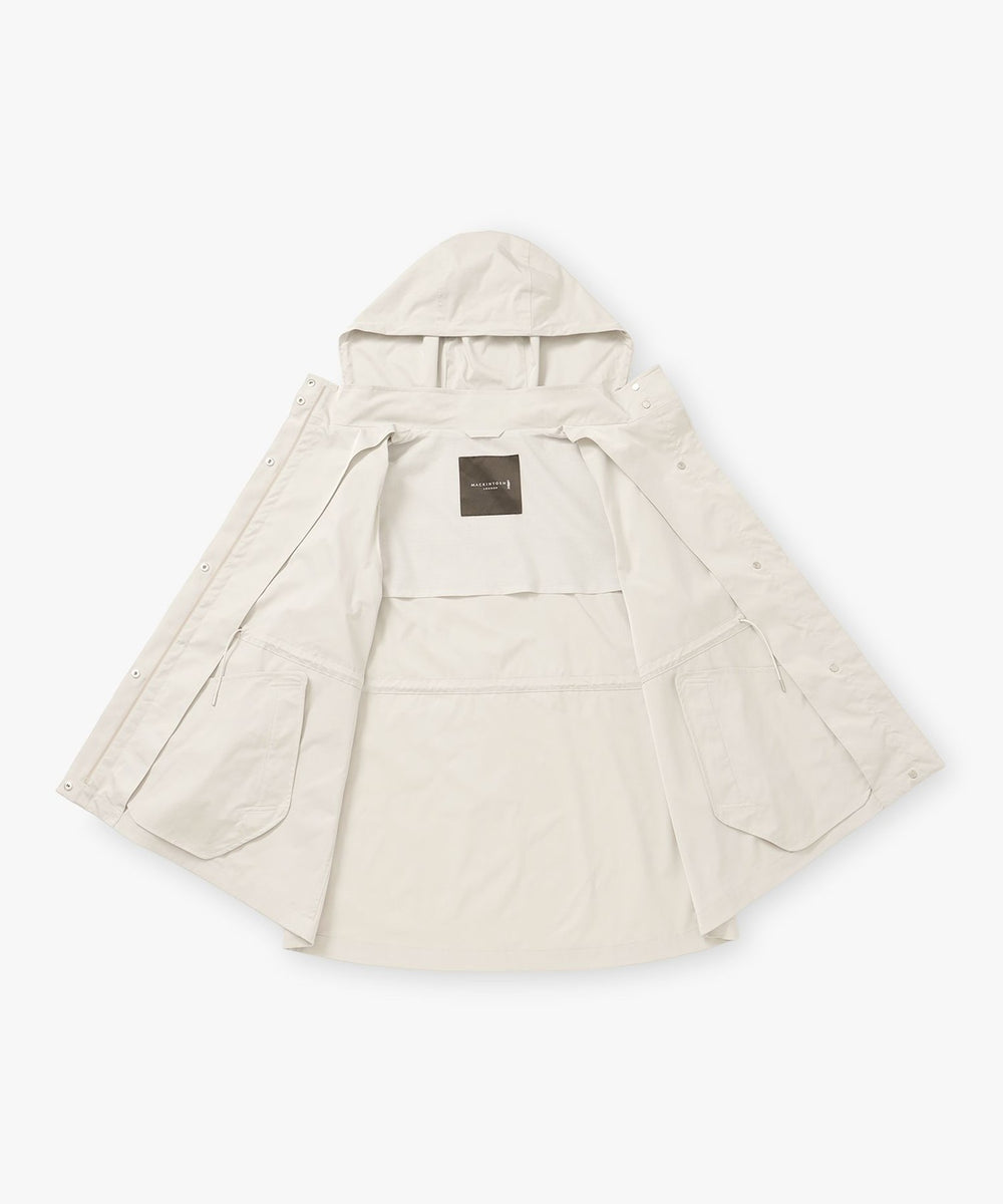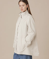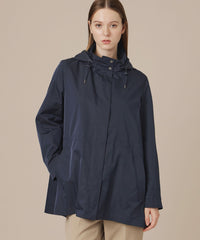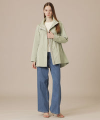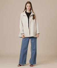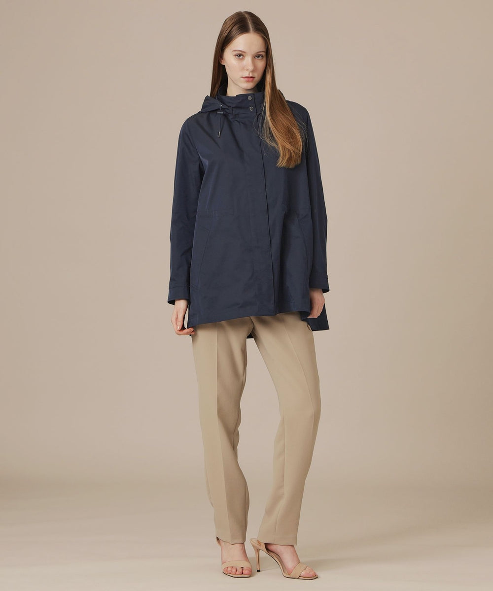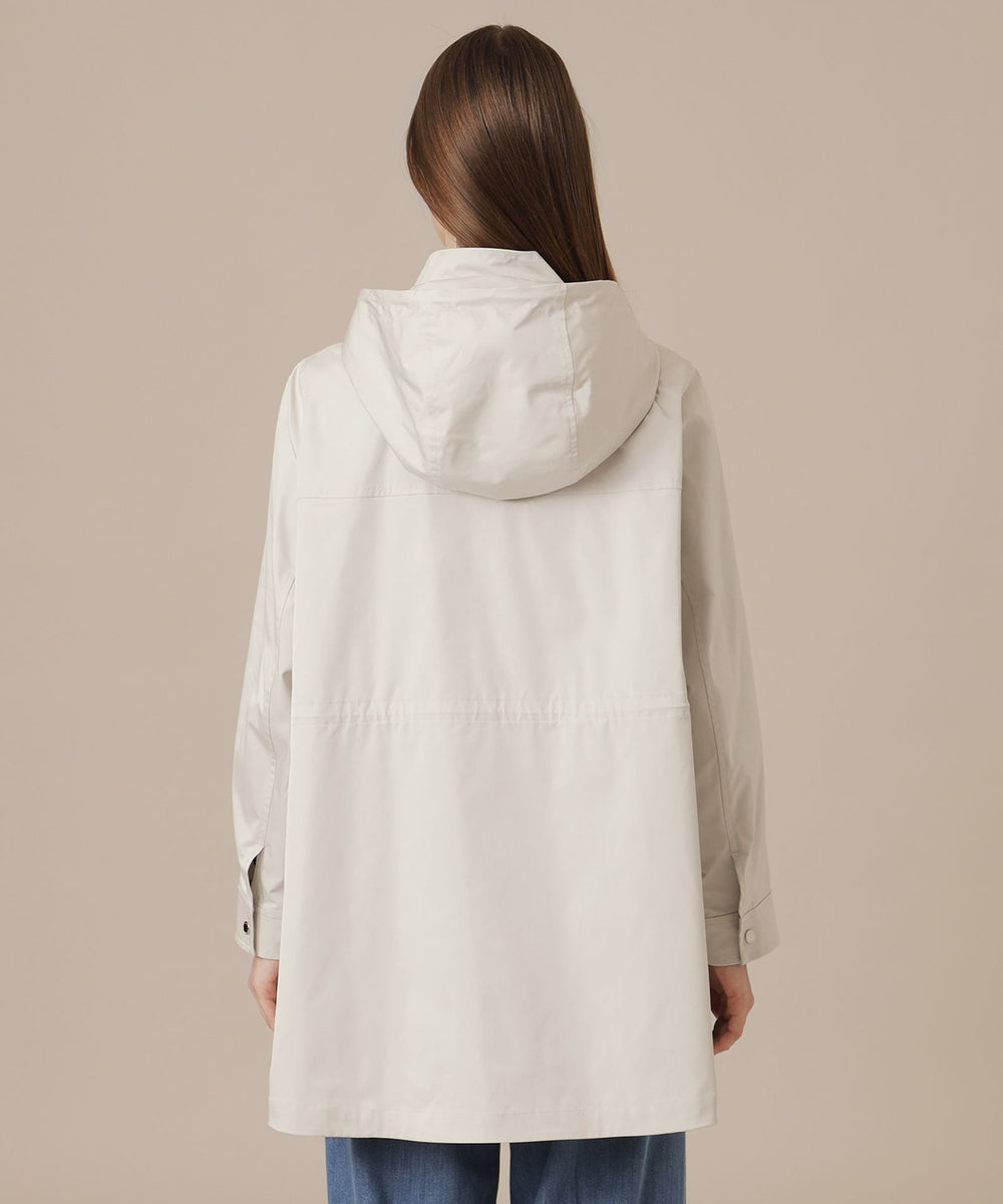 取り外し可能なフード付きのコートです。ウエストのスピンドルでウエストマークが可能です。後ろ裾が長く腰回りが隠れるAラインのシルエットでパンツ合わせで身体を細く見せてくれます。裏地なしです。