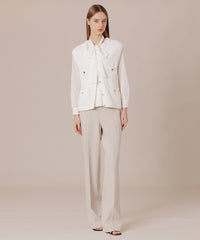 緩やかにシェイプしたウエストラインがやさしいツイードニットベストです。ポケットのメタルボタンをポイントに、エレガントなコーディネートをお楽しみいただけます。