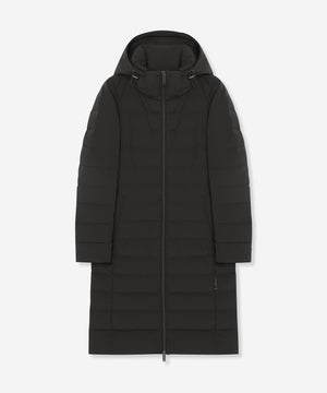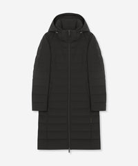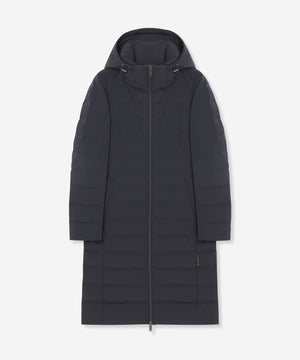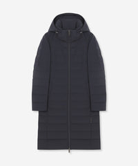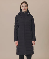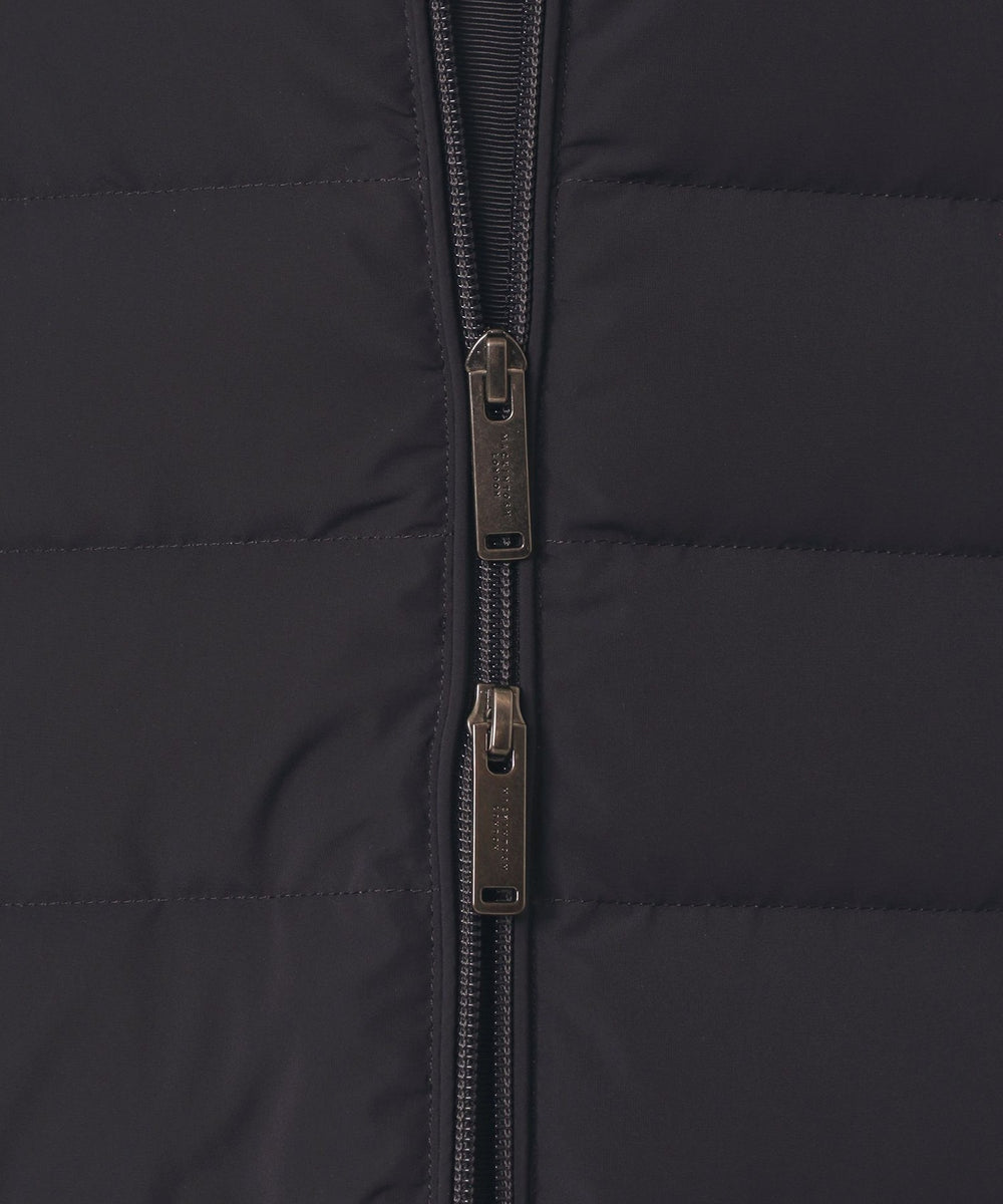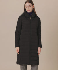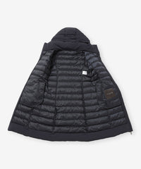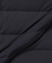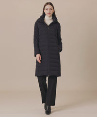 脇接ぎを無くし側面をフラットに仕上げることで着用すると細く見えるシルエットのダウンコートです。高めの衿に取り外し可能なフード付きで、エレガントな表情とカジュアルな表情をお楽しみいただけます。総裏地付きです。