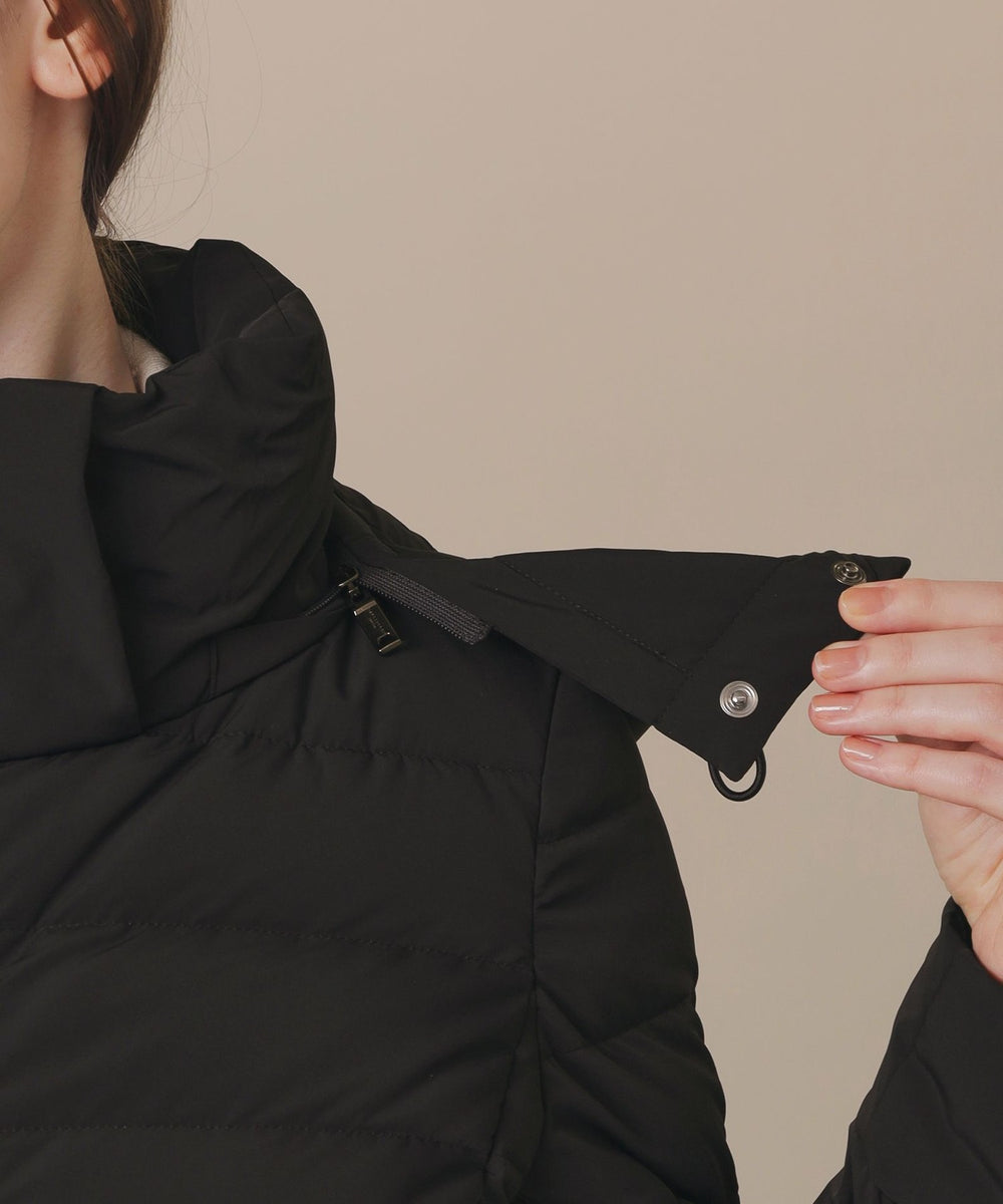 脇接ぎを無くし側面をフラットに仕上げることで着用すると細く見えるシルエットのダウンコートです。高めの衿に取り外し可能なフード付きで、エレガントな表情とカジュアルな表情をお楽しみいただけます。総裏地付きです。