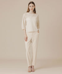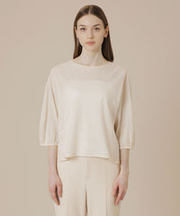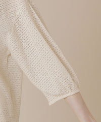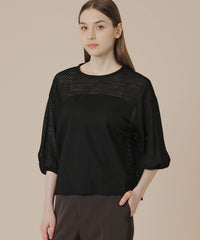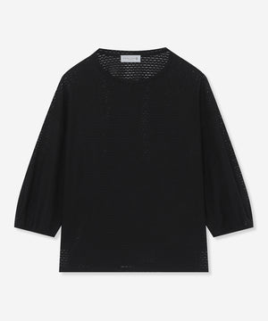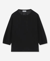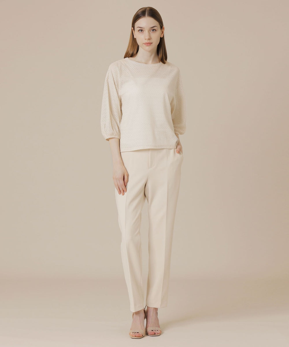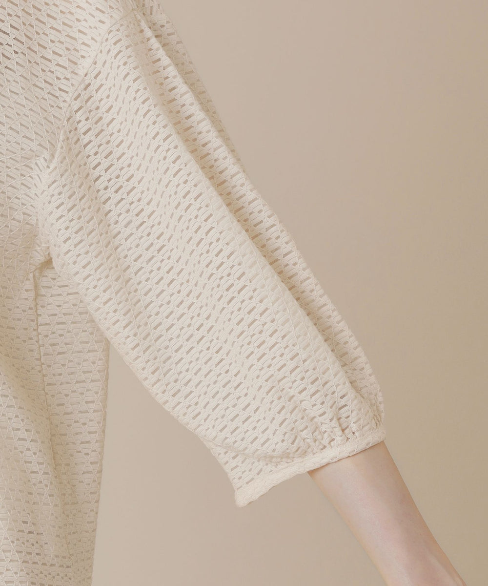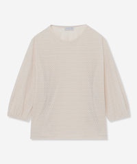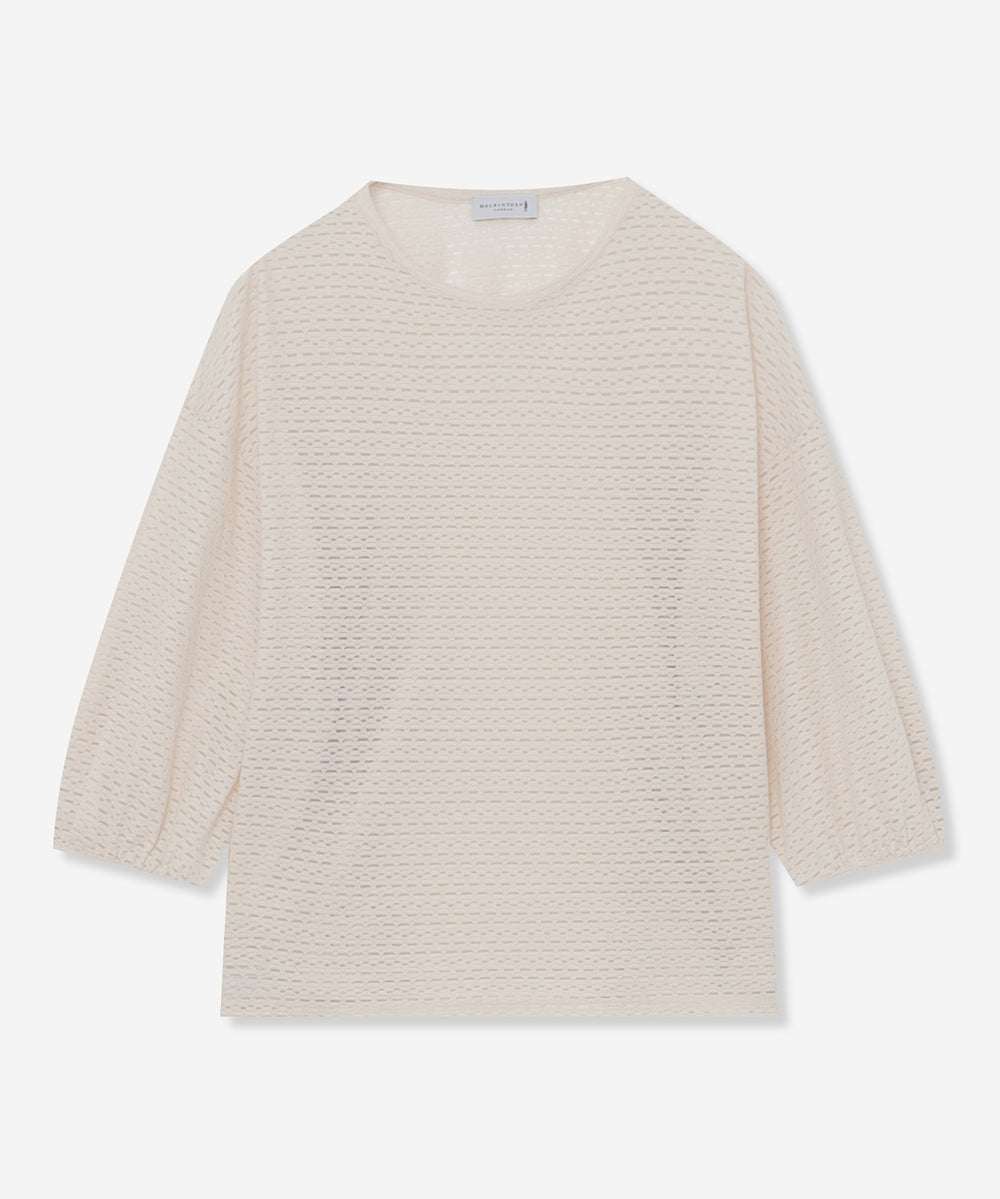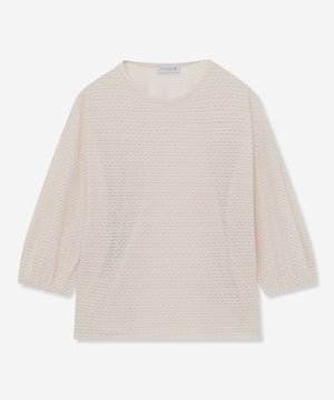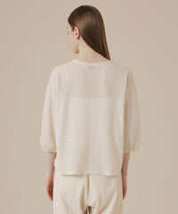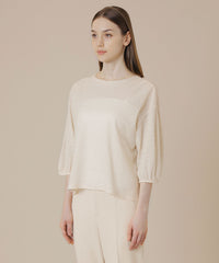 シアーで立体的な表情の生地を生かしたシンプルなプルオーバーです。程よく身体から離れたシルエットで清涼感があり、7分袖の袖口はギャザーでボリュームを出し華やかな印象です。