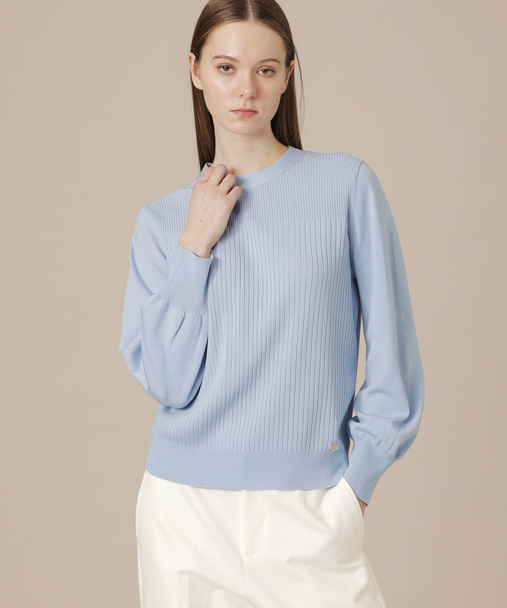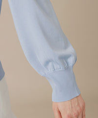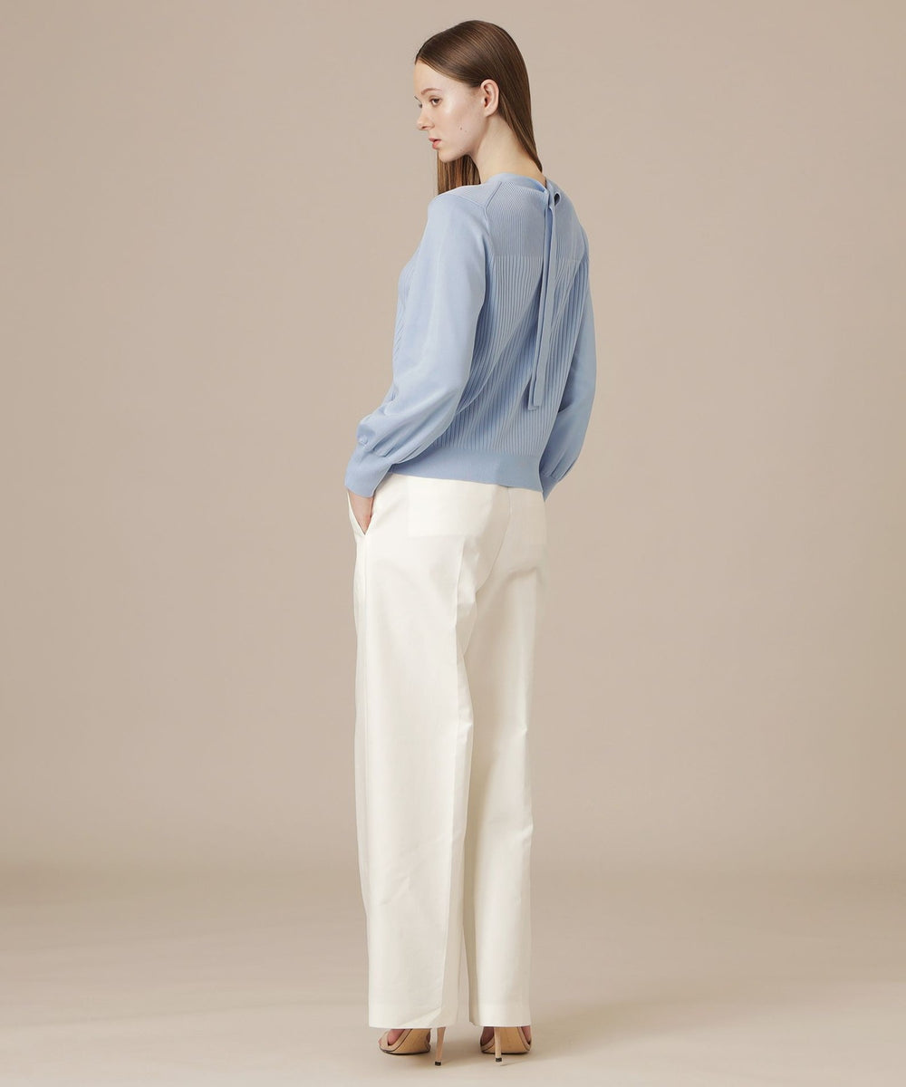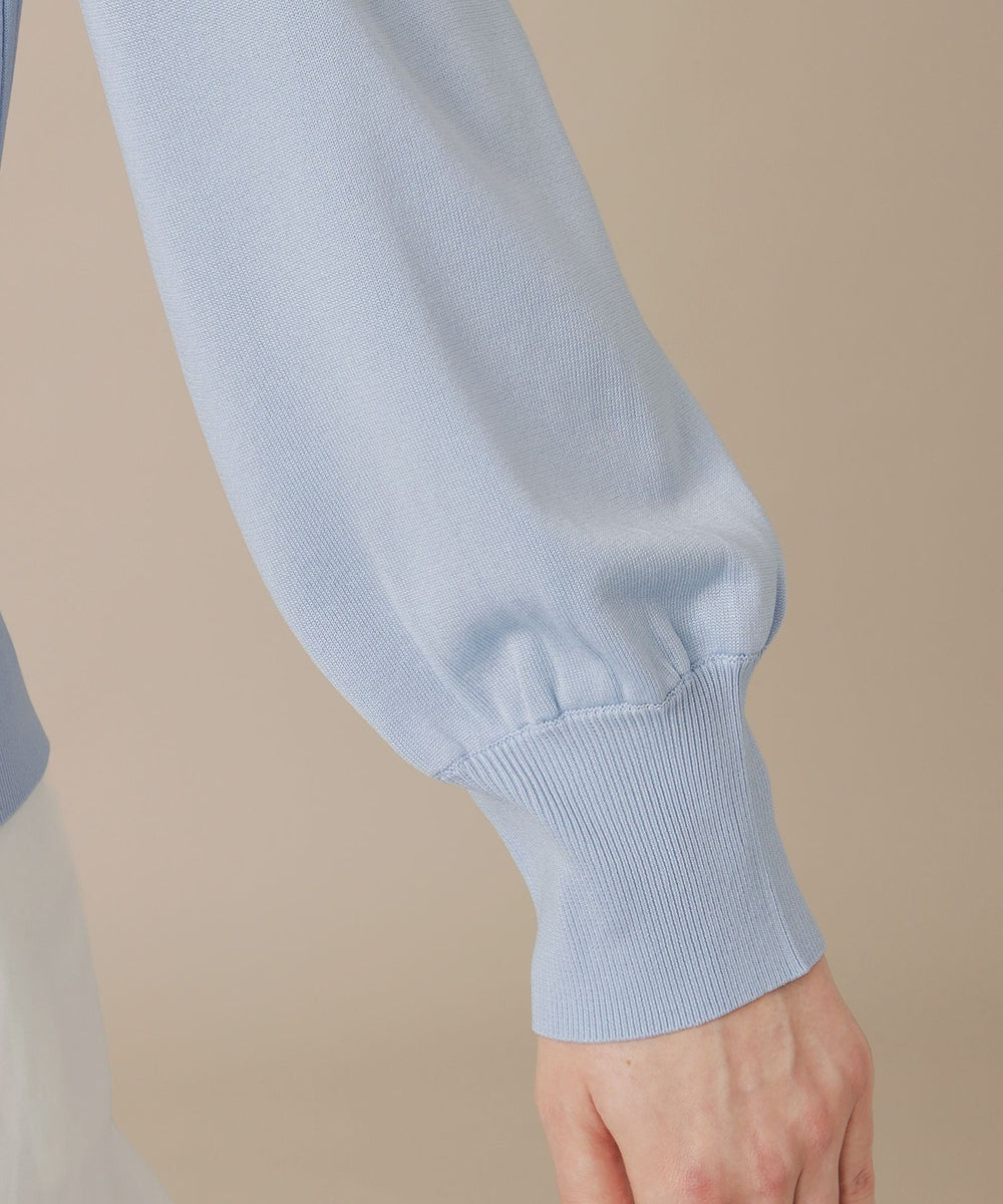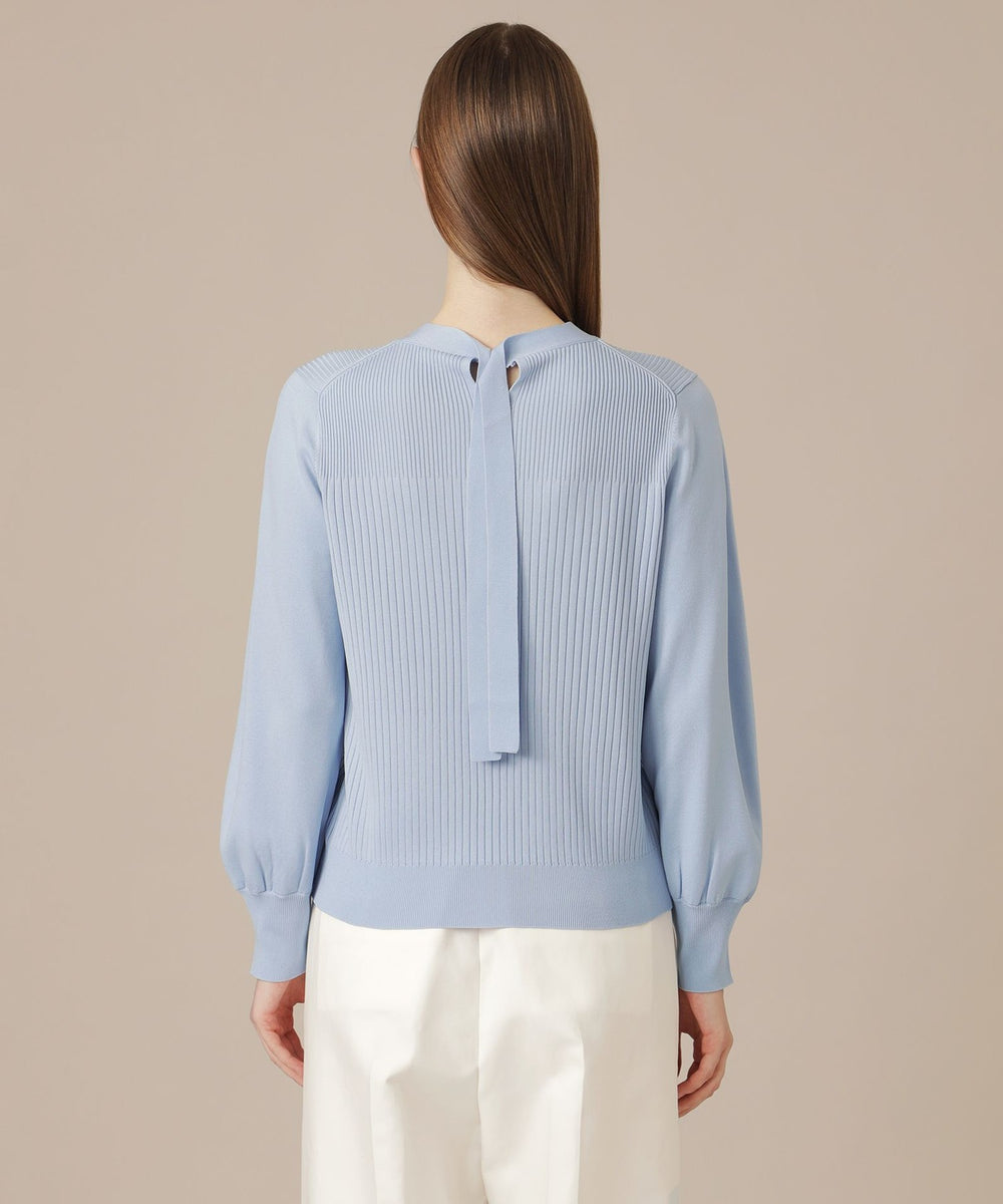 袖のギャザーと衿続きで後へ垂れるボウタイが、上品で華やかな印象のニットプルオーバーです。一枚でも、ジャケットとのレイヤードスタイルにも着映えするデザインニットです。