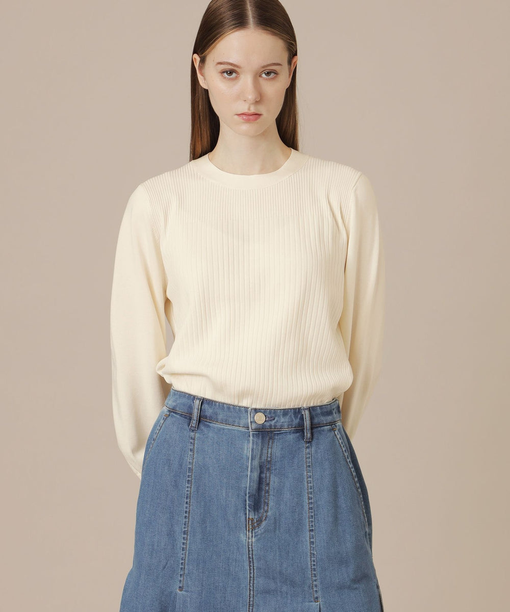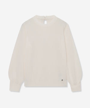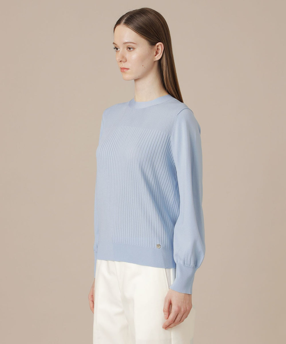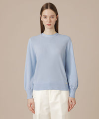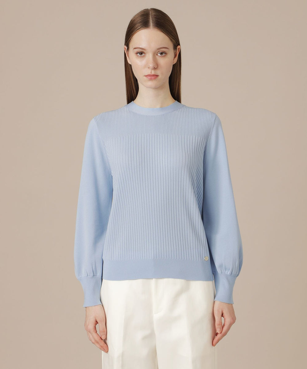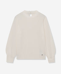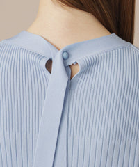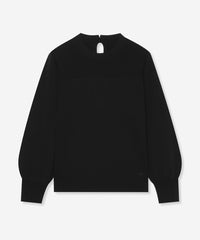 袖のギャザーと衿続きで後へ垂れるボウタイが、上品で華やかな印象のニットプルオーバーです。一枚でも、ジャケットとのレイヤードスタイルにも着映えするデザインニットです。