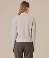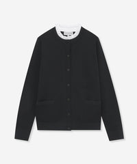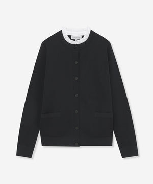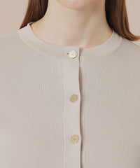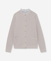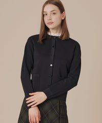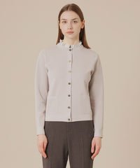 衿に布帛のフリルを施したカーディガンジャケットです。エレガントな印象で、衿のフリルは外しても着用でき、コーディネートの汎用性高いアイテムです。衿のカラーはブラック(#09):白衿、ベージュ(#40):ベージュ×白ストライプとなります。