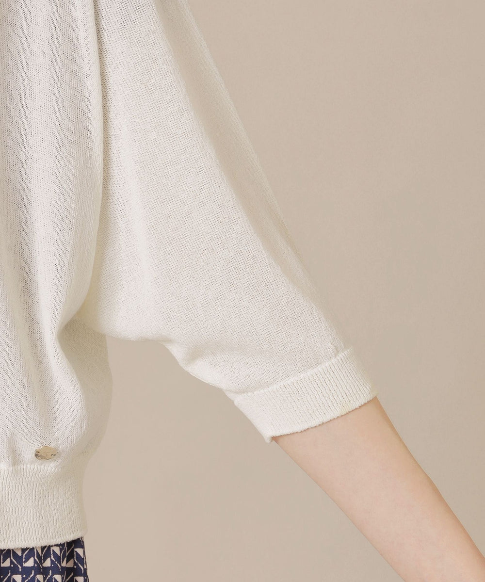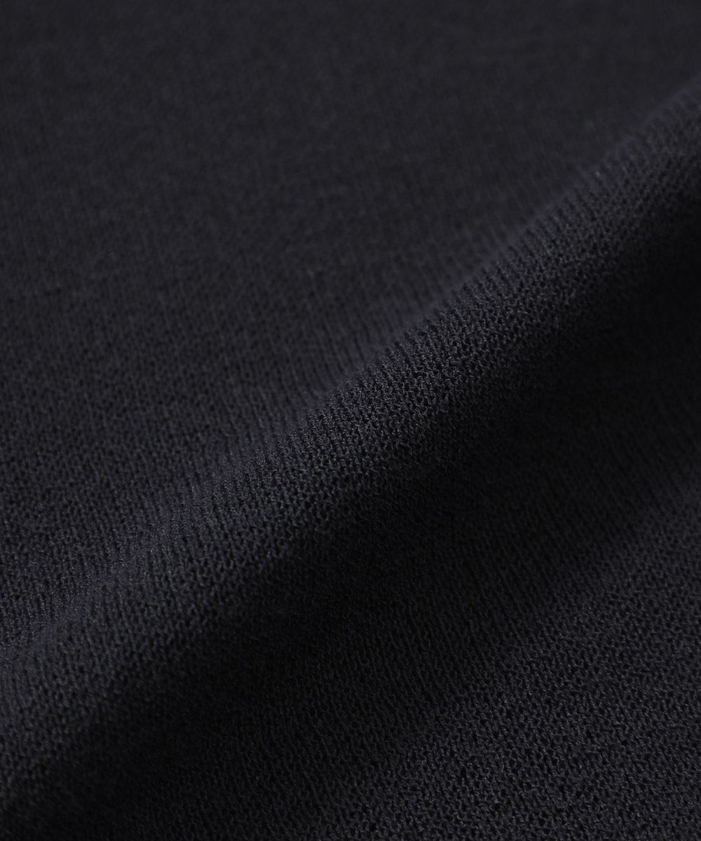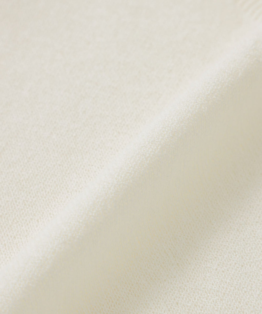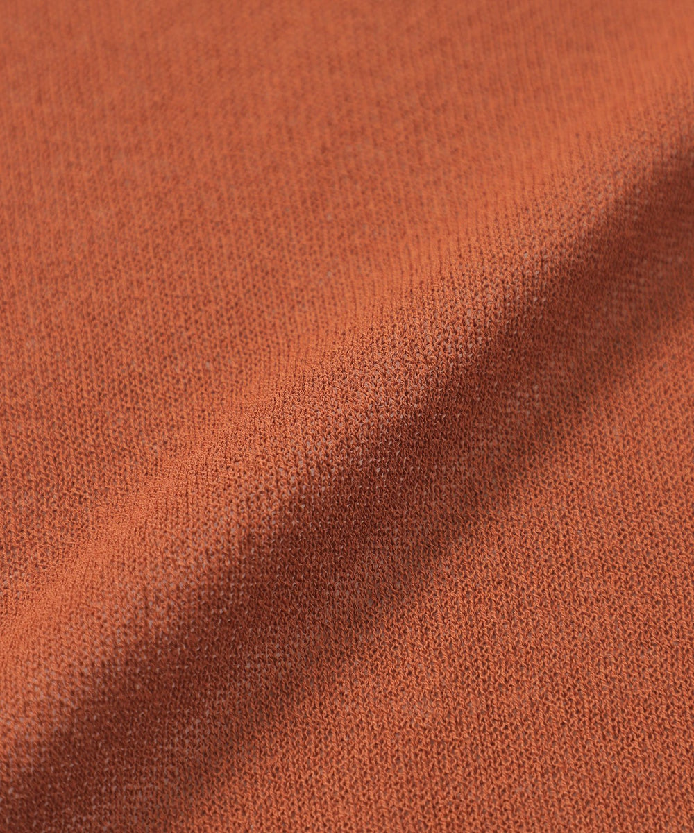 清涼感のあるドライな肌触りと軽さが特徴の素材です。フリーゼ(縮れ毛)タイプの糸を使用し、シンプルな編地に繊細で独特の表面感を演出しています。