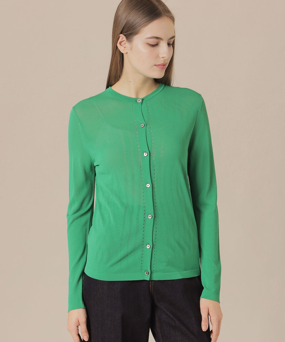 繊細なアイレットを前立てとサイドラインに施したシャープな印象のカーディガンです。ノースリーブなどの羽織に涼しげな印象のアイテムは春先から晩夏までご着用いただけます。