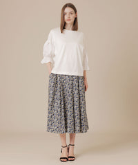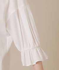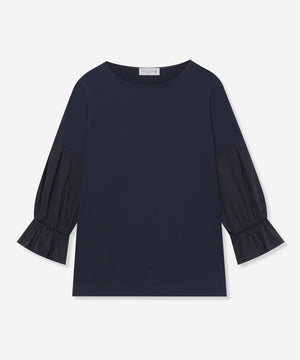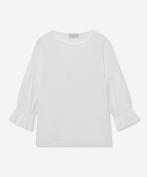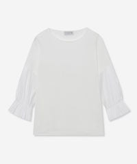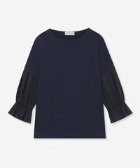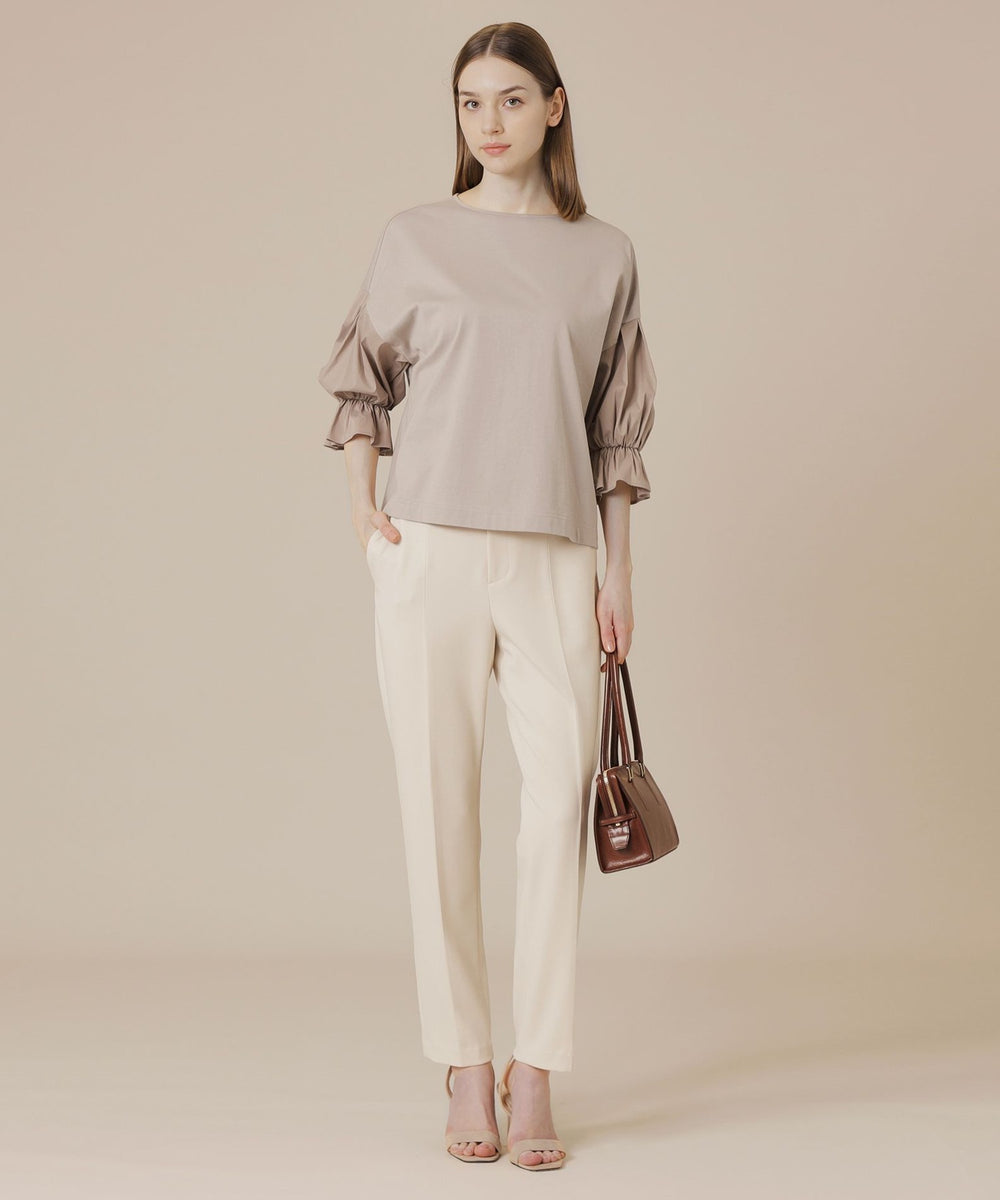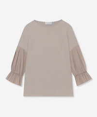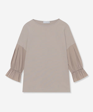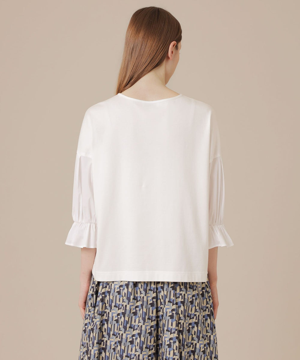身頃と袖に異素材を組み合わせたマテリアルミックスの六分袖プルオーバーです。ジャージ素材の着やすさと、繊細な生地の風合いを生かしたタックギャザーのボリューム袖がポイントです。袖口はゴム仕様で袖シルエットの調節ができます。