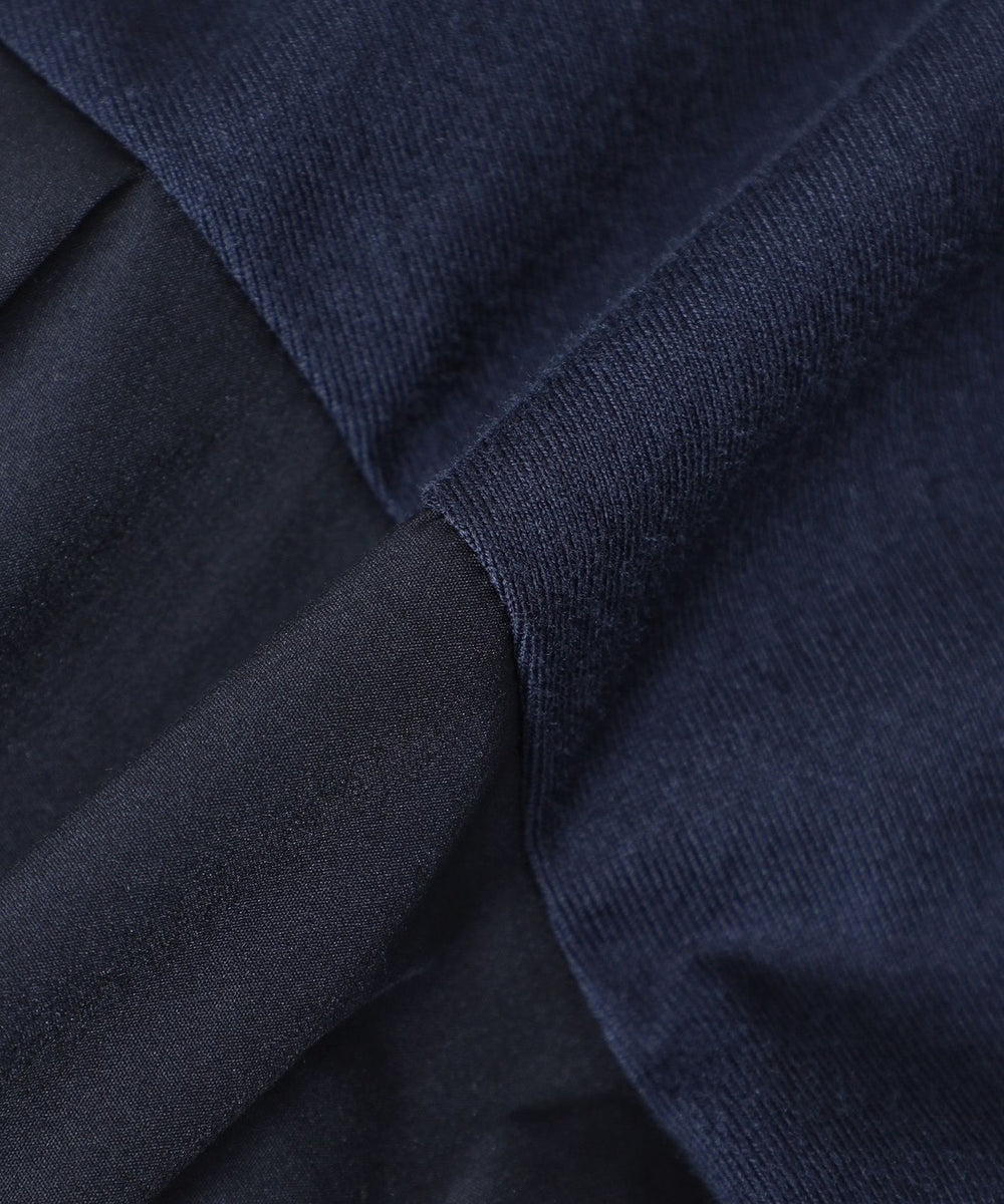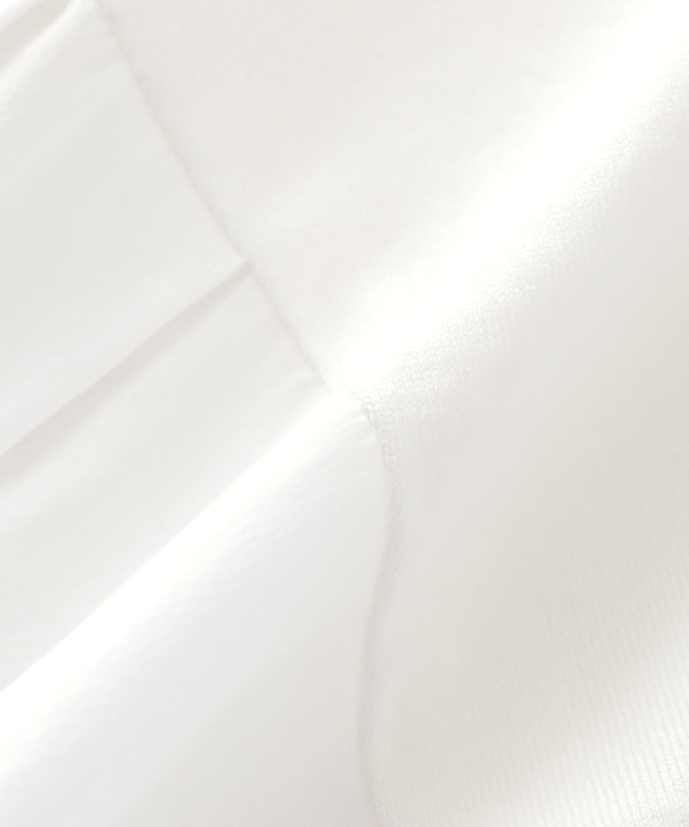 身頃はハリ感とふくらみのあるソフトでやさしい肌触りのジャージ素材、袖にはしなやかな風合いにクリアな表情のストレッチブロードを使用しています。