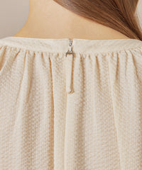 サッカー素材を生かした清涼感のあるブラウスです。袖口に繊細なギャザーを施したやさしいシルエットの袖は、二の腕をカバーしながら動きやすく着心地の良いエレガントな装いのアイテムです。