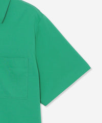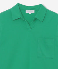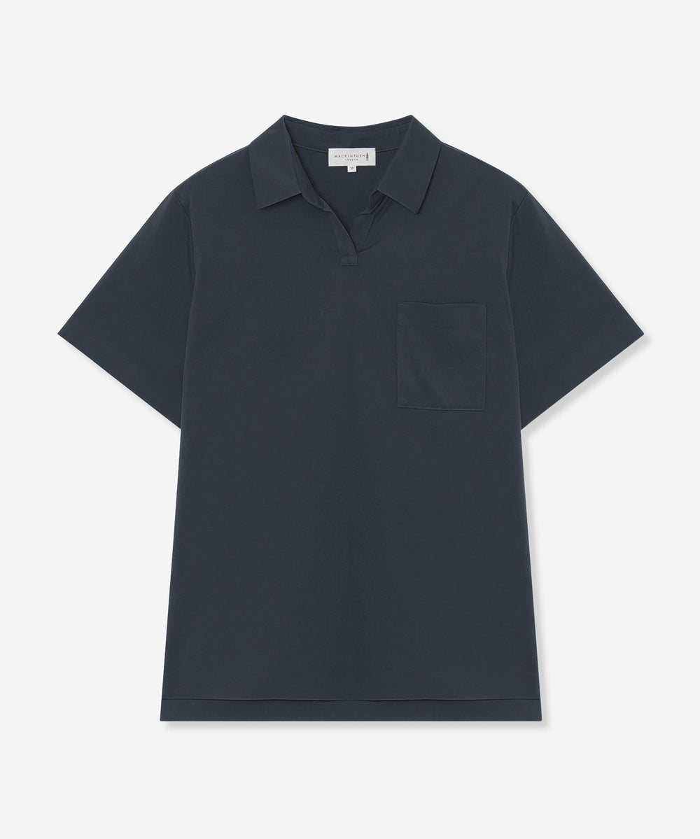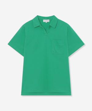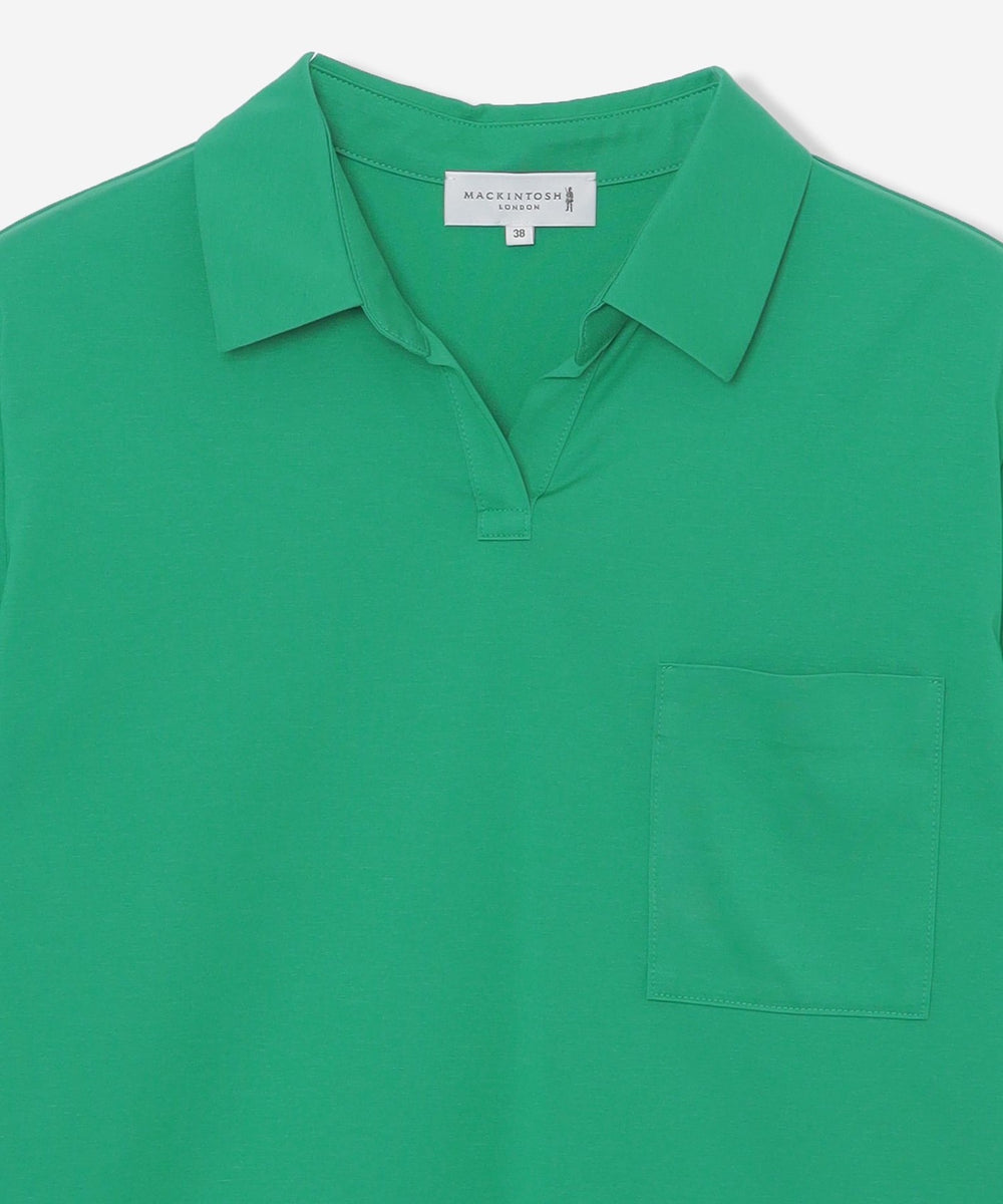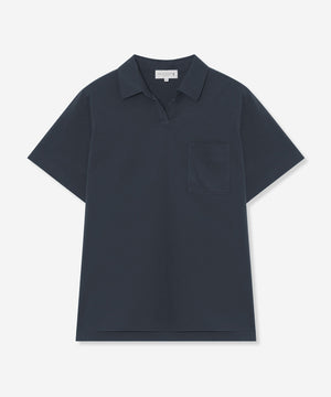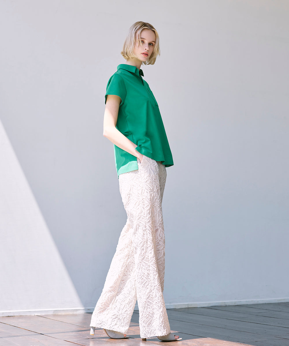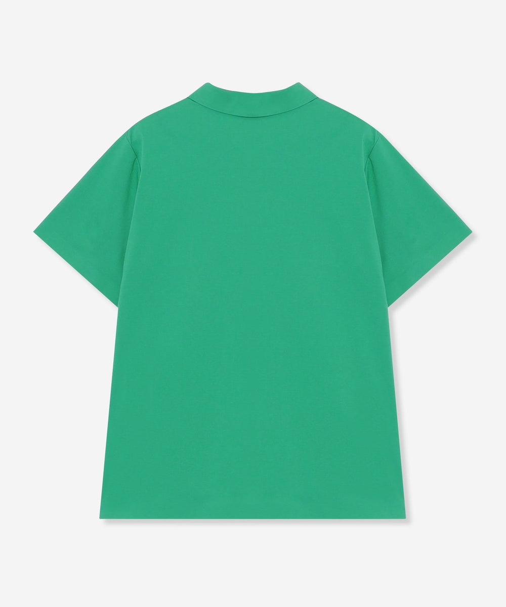 ポロ衿タイプのトップスです。裾、袖口は折り上げ接着する仕様で、シルエットは体に合わせた肩傾斜を意識し衿元はシャープになる様仕立てています。決まりの良い丈感で汎用性高く着用いただけます。