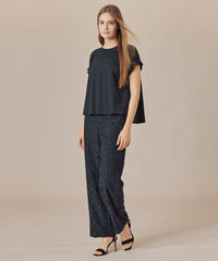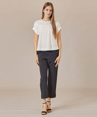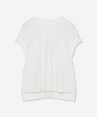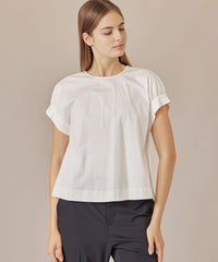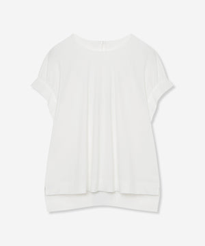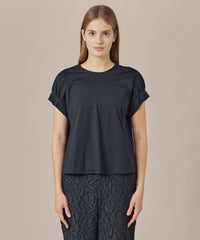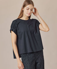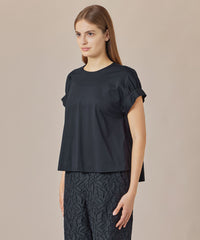 適度なゆとりと素材本来の伸縮性で着心地の良いプルオーバーです。フレンチスリーブに、前後差のある着丈で抜け感をプラスしたデザインです。