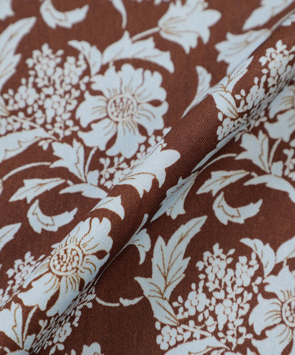 シルク調の風合いと優雅な光沢感が特長のサテン生地に、ブランドオリジナルのBIBURY/バイブリーフラワー柄をミニサイズにアレンジしたバイカラープリントです。