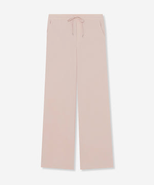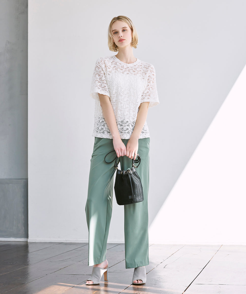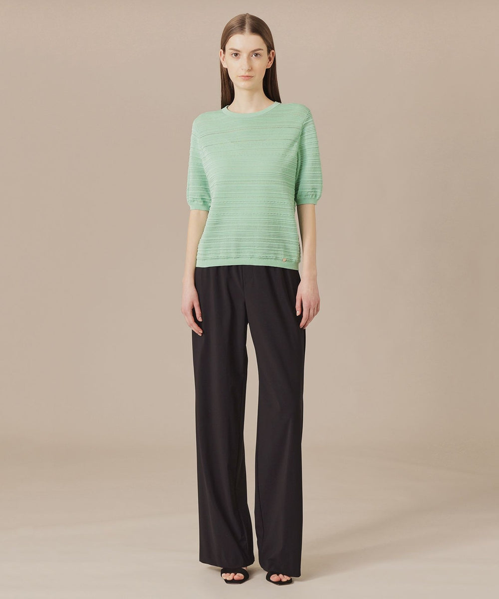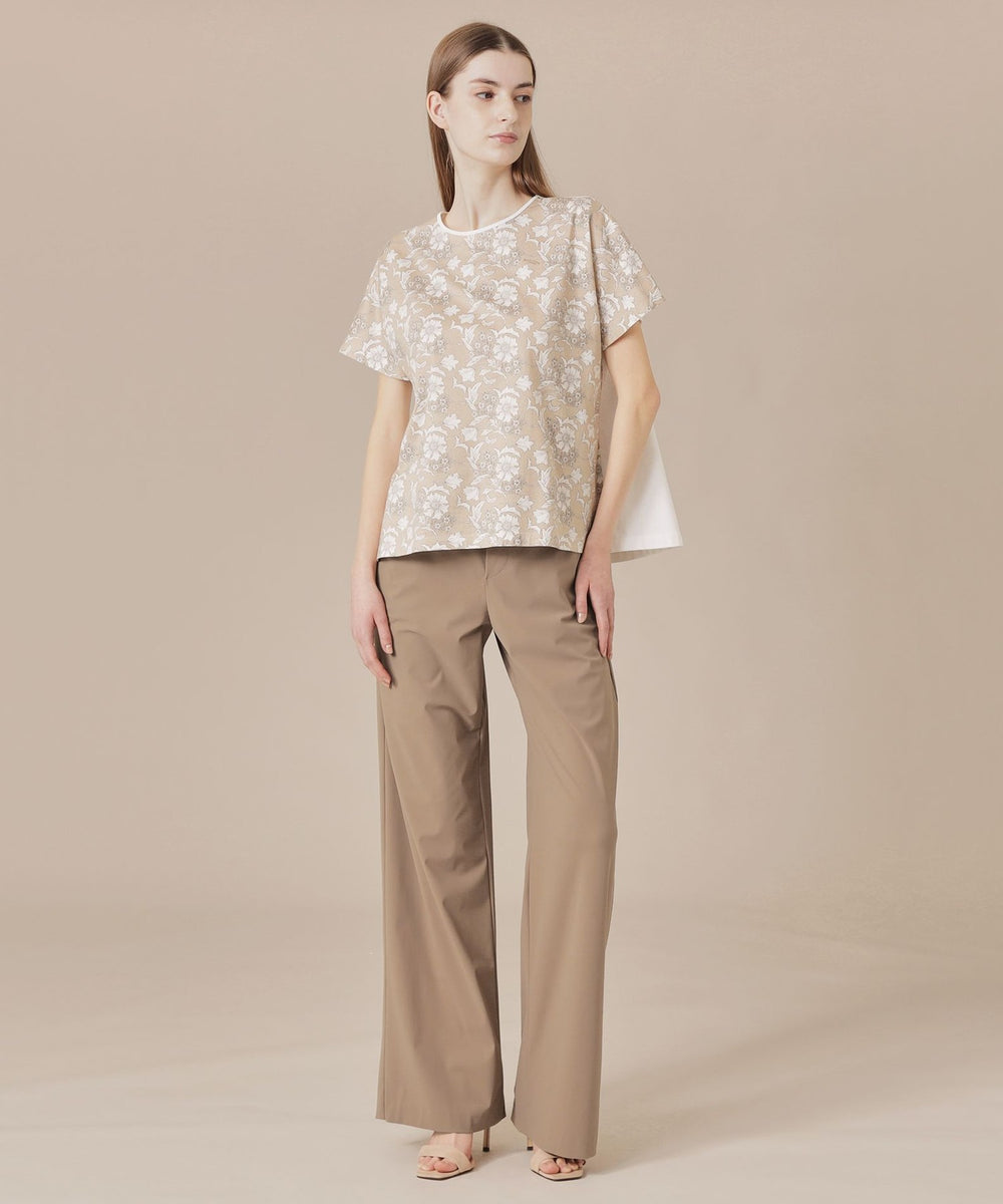 軽量で適度なハリがありさらっとした風合いのトリコット素材です。自然なストレッチ性で動きやすく快適な着用感も特徴です。また、シワが目立ちにくくリラックス感がありながら、綺麗な見た目でエレガントな表情もあります。