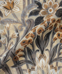 シボ感が特徴のポリエステル楊柳の生地で、ソフトな風合いと適度な透け感にドライタッチな表情が特徴です。プリントはロンドンの老舗デザインスタジオの伝統的な柄を元に、モダンにアレンジしたボタニカルフラワーです。