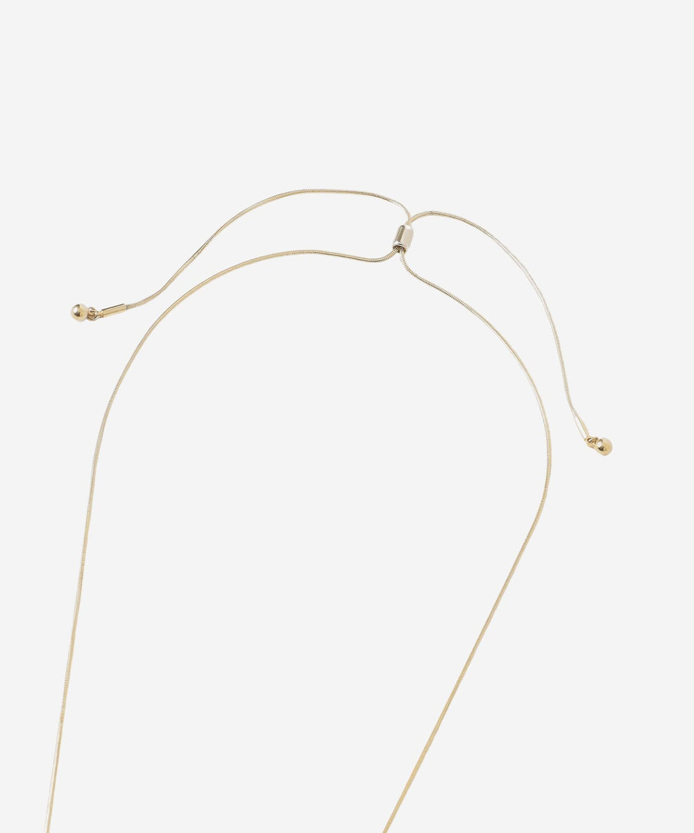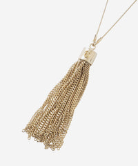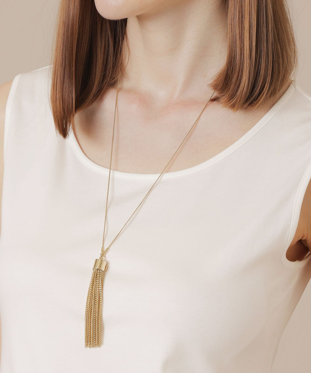 チェーンをフリンジ状にしたタッセルモチーフのネックレスです。球状のアジャスター(スライドビーズ)を上下に滑らせることで簡単に長さを調節できる被るタイプのネックレスです。揺れると輝き、フォーマルにもカジュアルにも合わせやすいデザインです。ニッケルフリーのメッキを施しています。