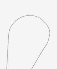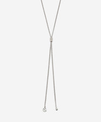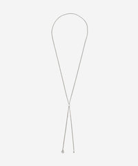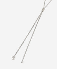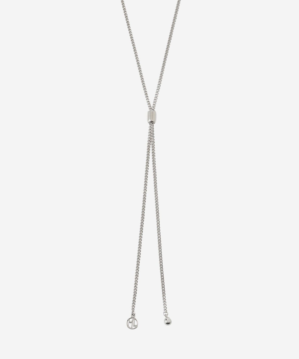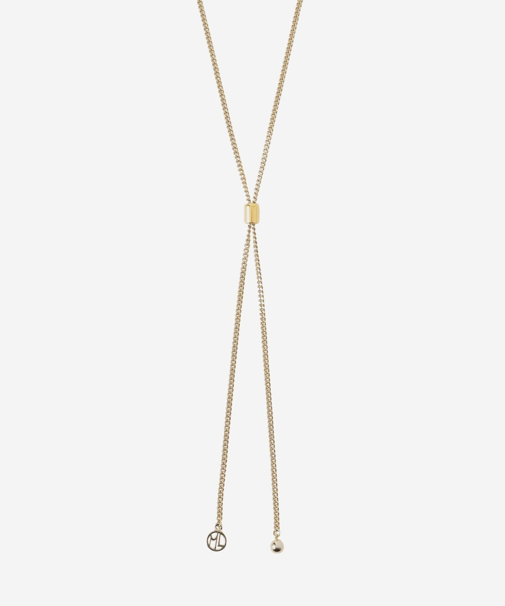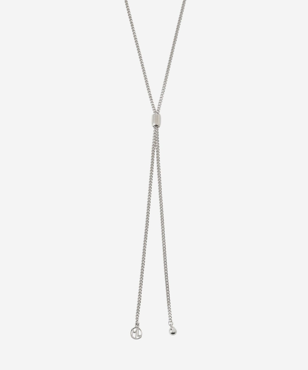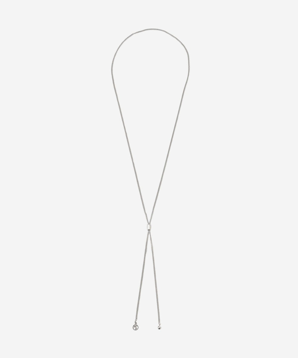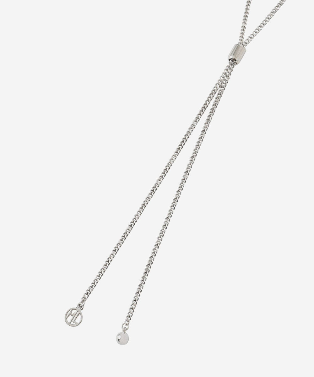 チェーンのシンプルなラリエットタイプのネックレスです。球状のアジャスター(スライドビーズ)を上下に滑らせることで簡単に長さを調節できる被るタイプのネックレスです。前後を逆にしても身に付けられます。揺れると輝き、フォーマルにもカジュアルにも合わせやすいデザインです。ニッケルフリーのメッキを施しています。