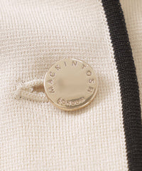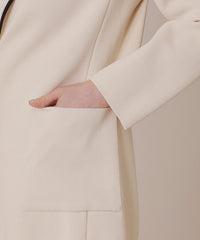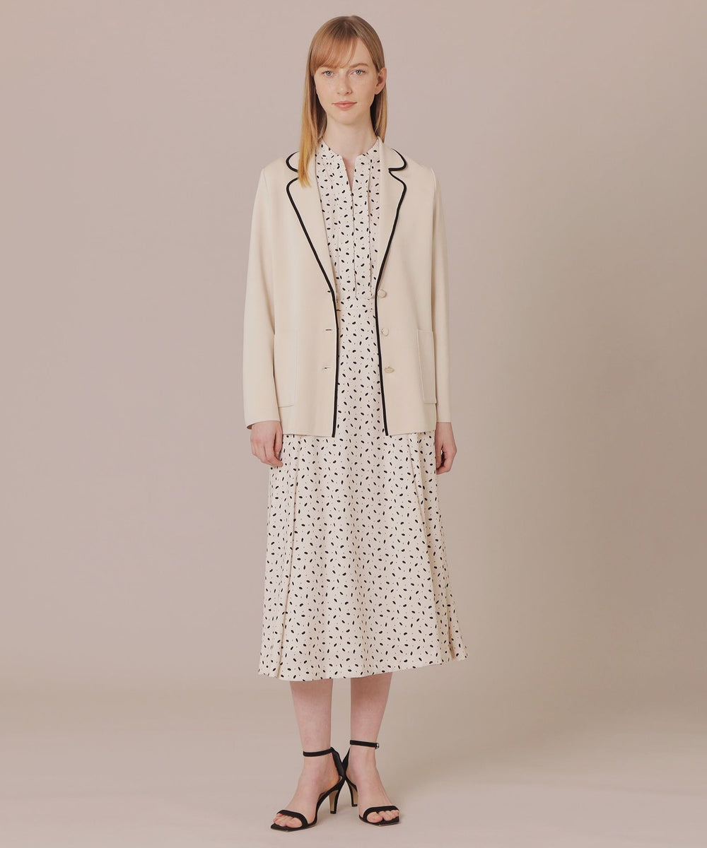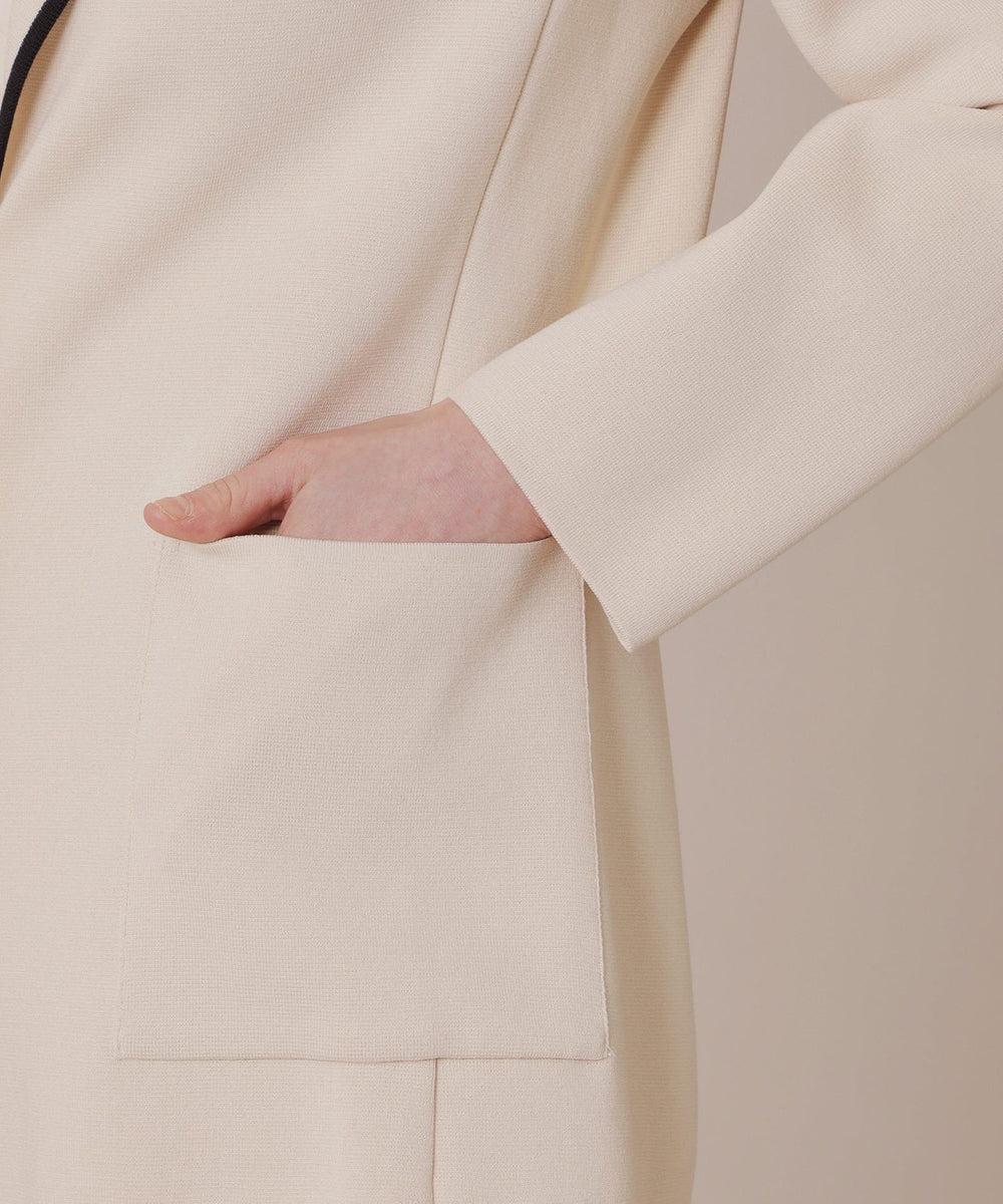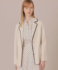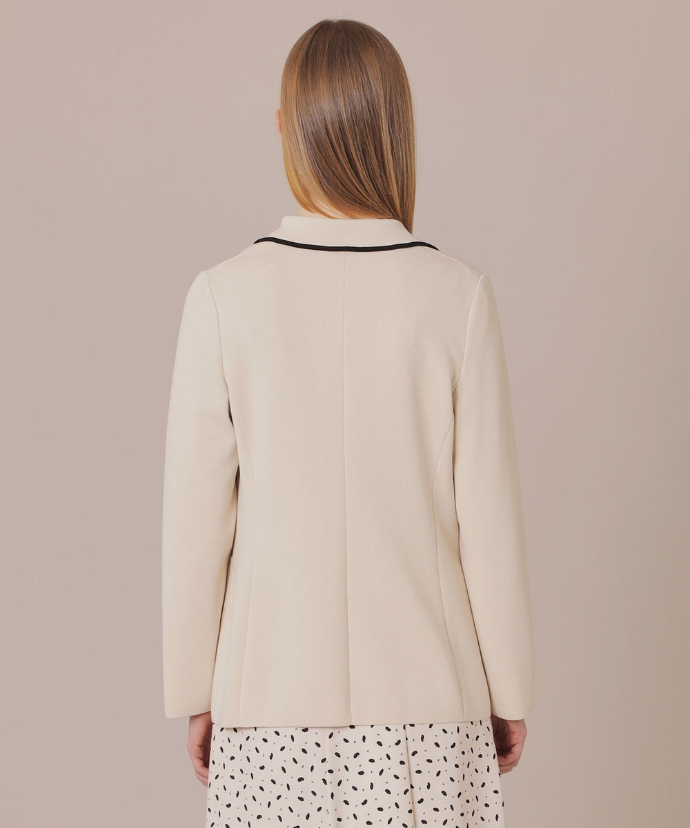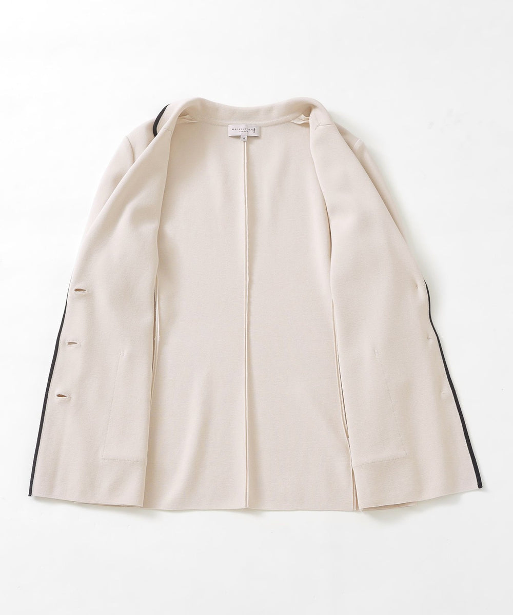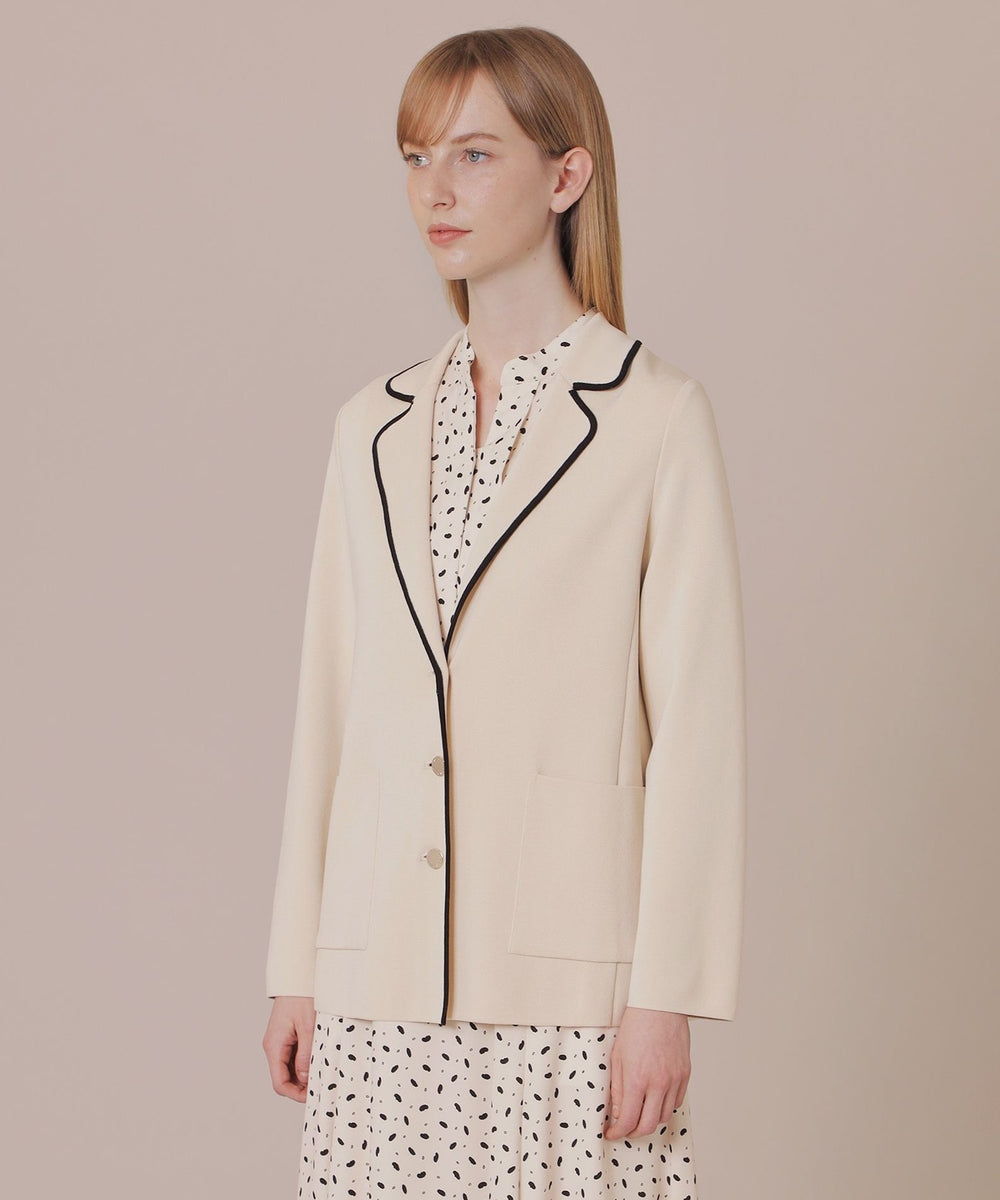 細めの配色パイピングが繊細な印象のテーラードジャケットです。着丈はヒップが隠れる安心丈です。ミラノ編みできちんと感がありながら適度なストレッチ性もあり着心地の良いニットジャケットです。裏地なしです。
