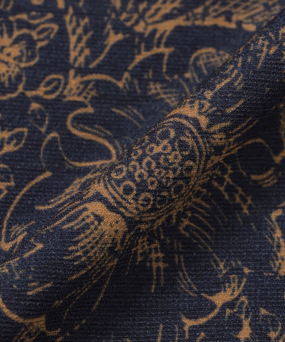 ナチュラルな表情感、軽やかなドレープからくる爽やかな着心地のジャージ素材です。ブルー(#26)はブランドオリジナルのBIBURY FLOWERスタンダード柄を濃淡で表現し、ネイビー(#28)はBIBURY FLOWERのドローイングタッチ柄をキャメルの配色で表現しています。